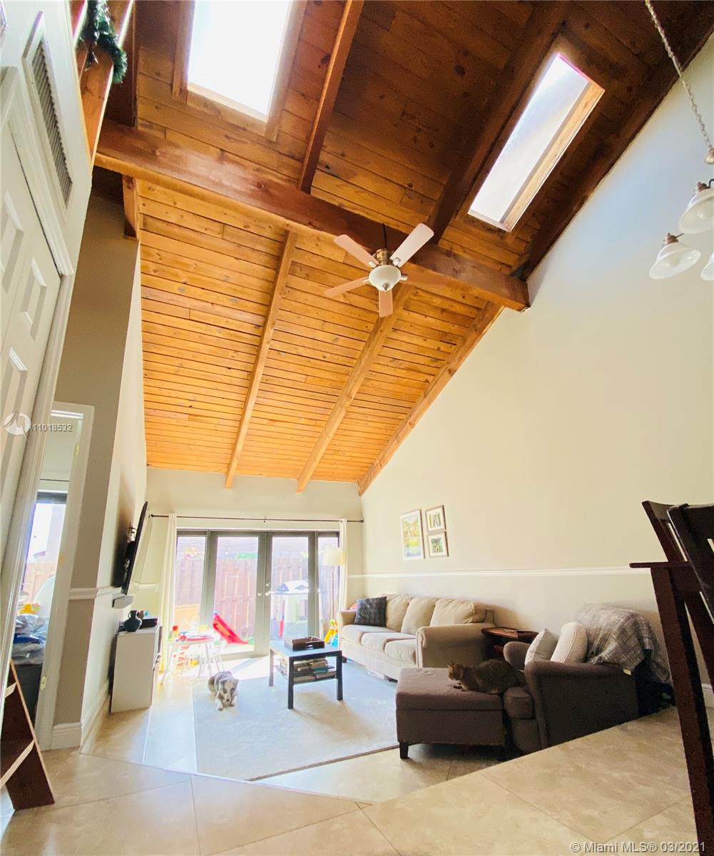 This beautiful 2 bedroom townhouse is fully protected with hurricane impact windows and doors (including the skylights), has a BRAND NEW AC, updated kitchen and bathroom, high vaulted ceilings, 2nd story loft can be used as a 3rd bedroom or office, assigned parking spot is located directly in front of the entrance door, additional parking spaces are just steps away. There is a front patio, which can be used as additional storage, or another seating area, just off the kitchen. The backyard has artificial grass for easy maintenance. The community offers a large, resort-style pool, playground, tennis courts, a pickle ball court, & basketball half court.