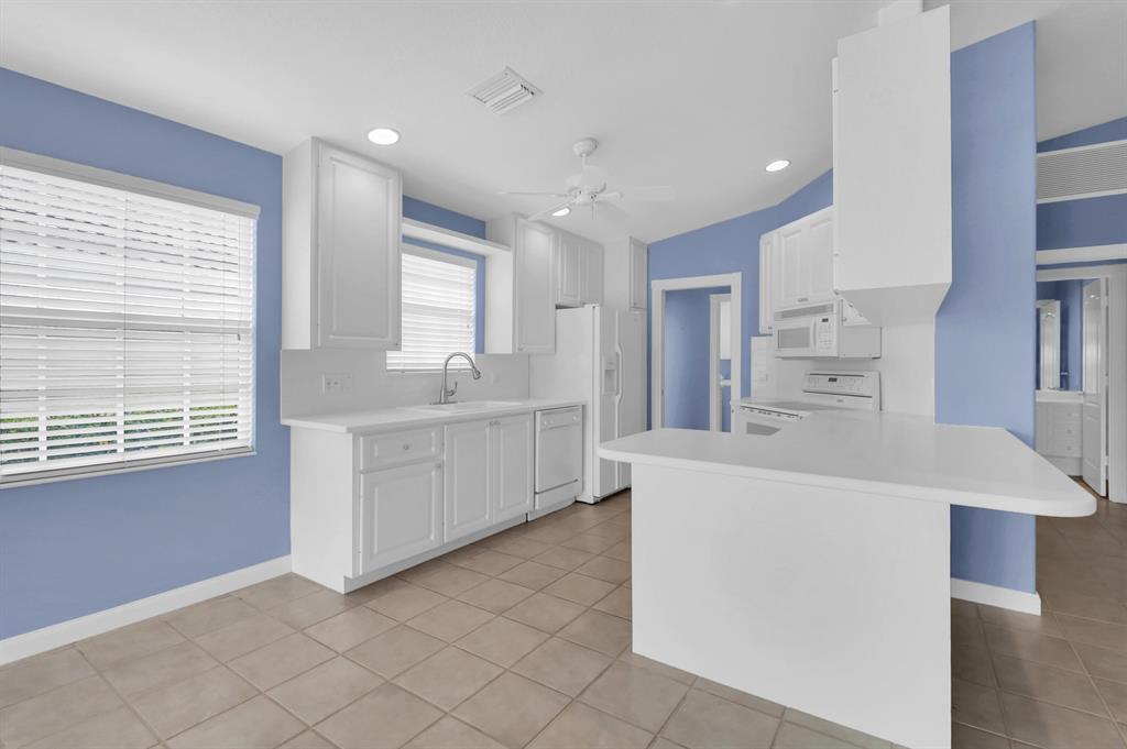 GORGEOUS CAPRI-EXTENDED model on a lush tropical Lakeside Lot l!! This 2 bed 2 bath home is in the highly sought-after RiverWalk community. This home is extremely well maintained and up to date featuring beautiful tile throughout. The spacious kitchen has premium JennAir appliances, stunning white Corian counter tops, ceramic tile backsplashes, beautiful white cabinetry with breakfast bar seating. The expansive 30 foot dining area with ceramic tile and family room leads to the huge sliding glass doors that look out to the fantastic 30x40 screened patio overooking the breathtaking lush landscaped lakeside lot. Master bedroom over looks your breathtaking lake views and feature slip-laid faux wood ceramic tile and a large walk-in closet. Large ensuite with his and hers vanities,