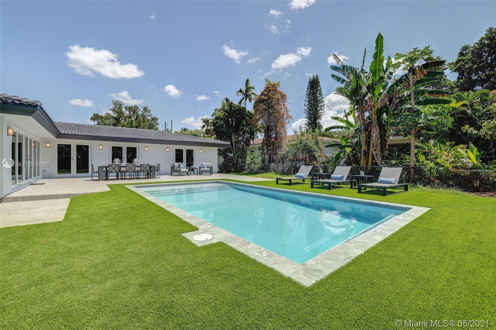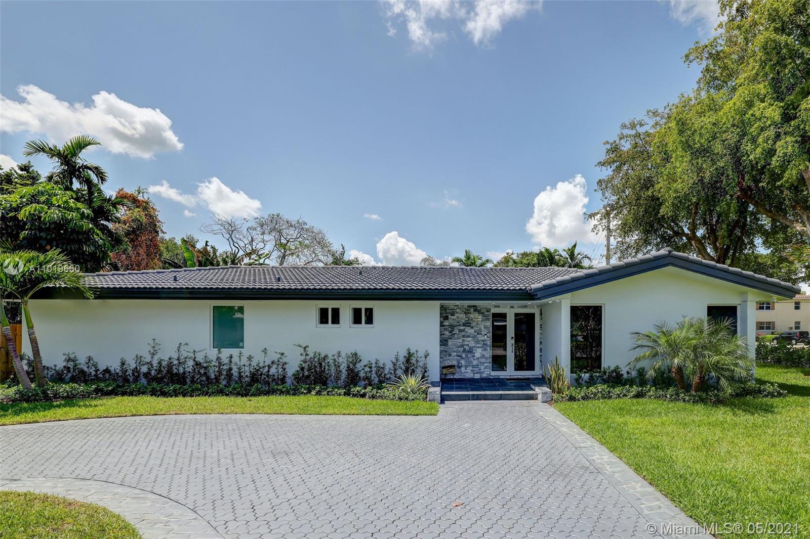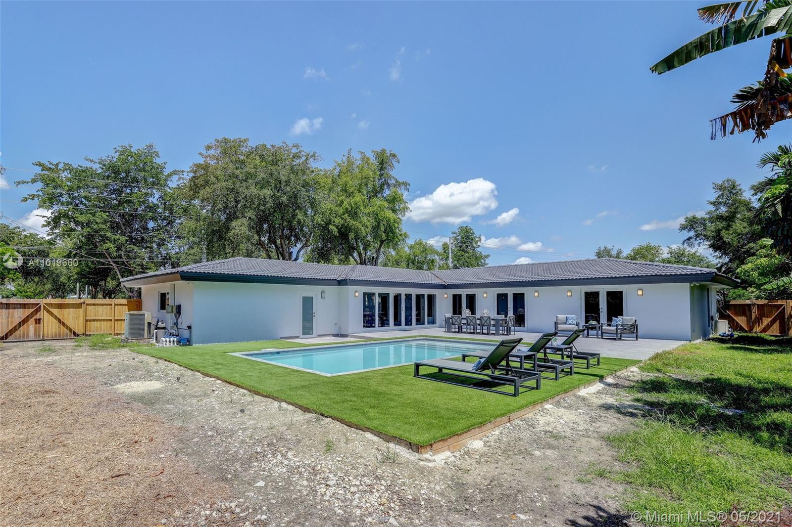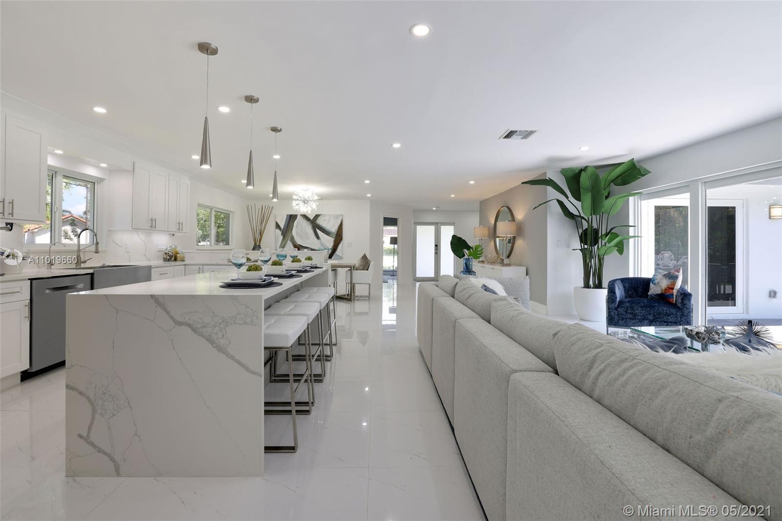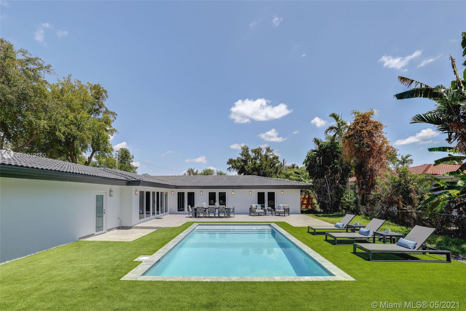 Miami Shores Pool Home! This jewel is situated on a sprawling 1/3 acre corner lot. Completely gutted and tastefully renovated. Just completed - May, 2021. Must see! This gorgeously finished 4 Bed/2.5 bath residence features a bright and spacious design providing abundant natural light, appealing white porcelain tile flooring throughout, a large 2 car garage, impact windows/doors, and sleek spa-inspired bathrooms. The chef-inspired kitchen is equipped with brand new Bosh appliances, quartz counter tops and custom cabinetry. Central kitchen island with bar seating and separate dining space allow for numerous spots to entertain. The open floor plan is ideal for indoor/outdoor living. All bedrooms and living spaces open to your newly installed pool and serene patio area with complete privacy.