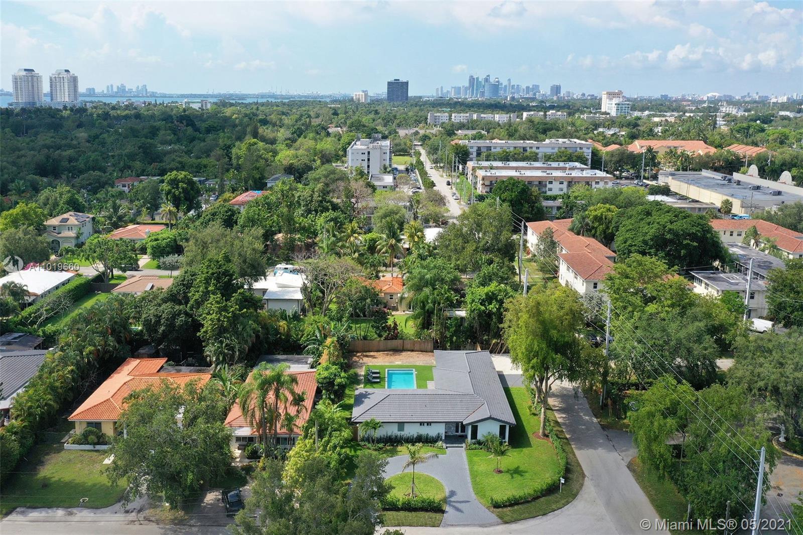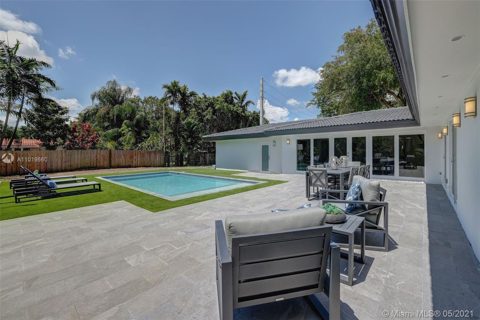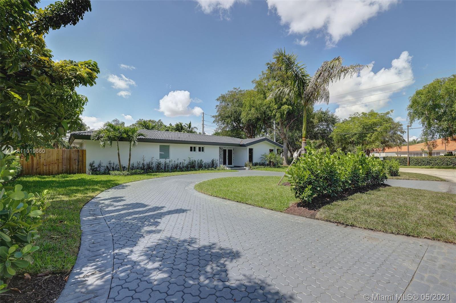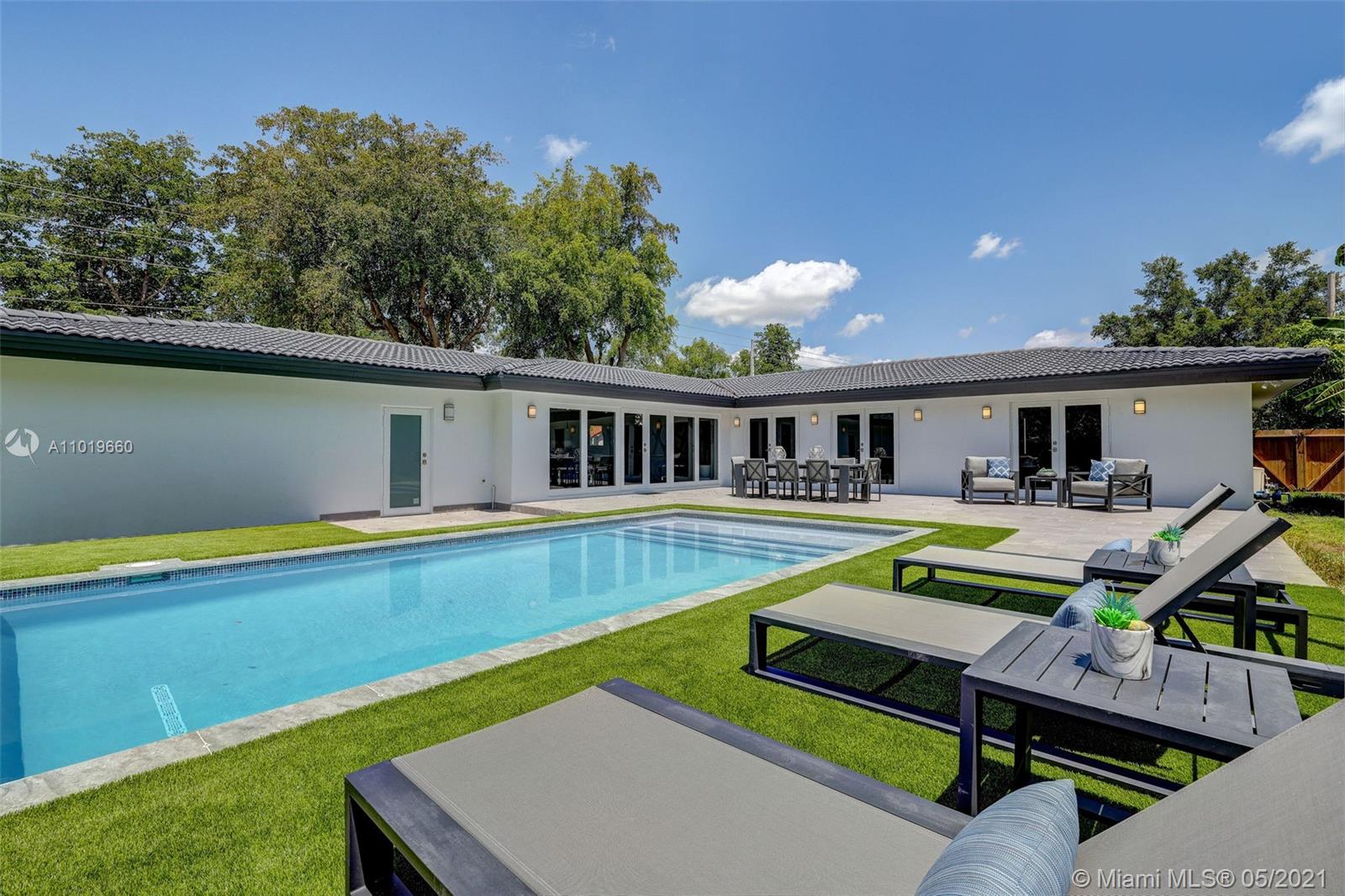 Miami Shores Pool Home! This jewel is situated on a sprawling 1/3 acre corner lot. Completely gutted and tastefully renovated. Just completed - May, 2021. Must see! This gorgeously finished 4 Bed/2.5 bath residence features a bright and spacious design providing abundant natural light, appealing white porcelain tile flooring throughout, a large 2 car garage, impact windows/doors, and sleek spa-inspired bathrooms. The chef-inspired kitchen is equipped with brand new Bosh appliances, quartz counter tops and custom cabinetry. Central kitchen island with bar seating and separate dining space allow for numerous spots to entertain. The open floor plan is ideal for indoor/outdoor living. All bedrooms and living spaces open to your newly installed pool and serene patio area with complete privacy.