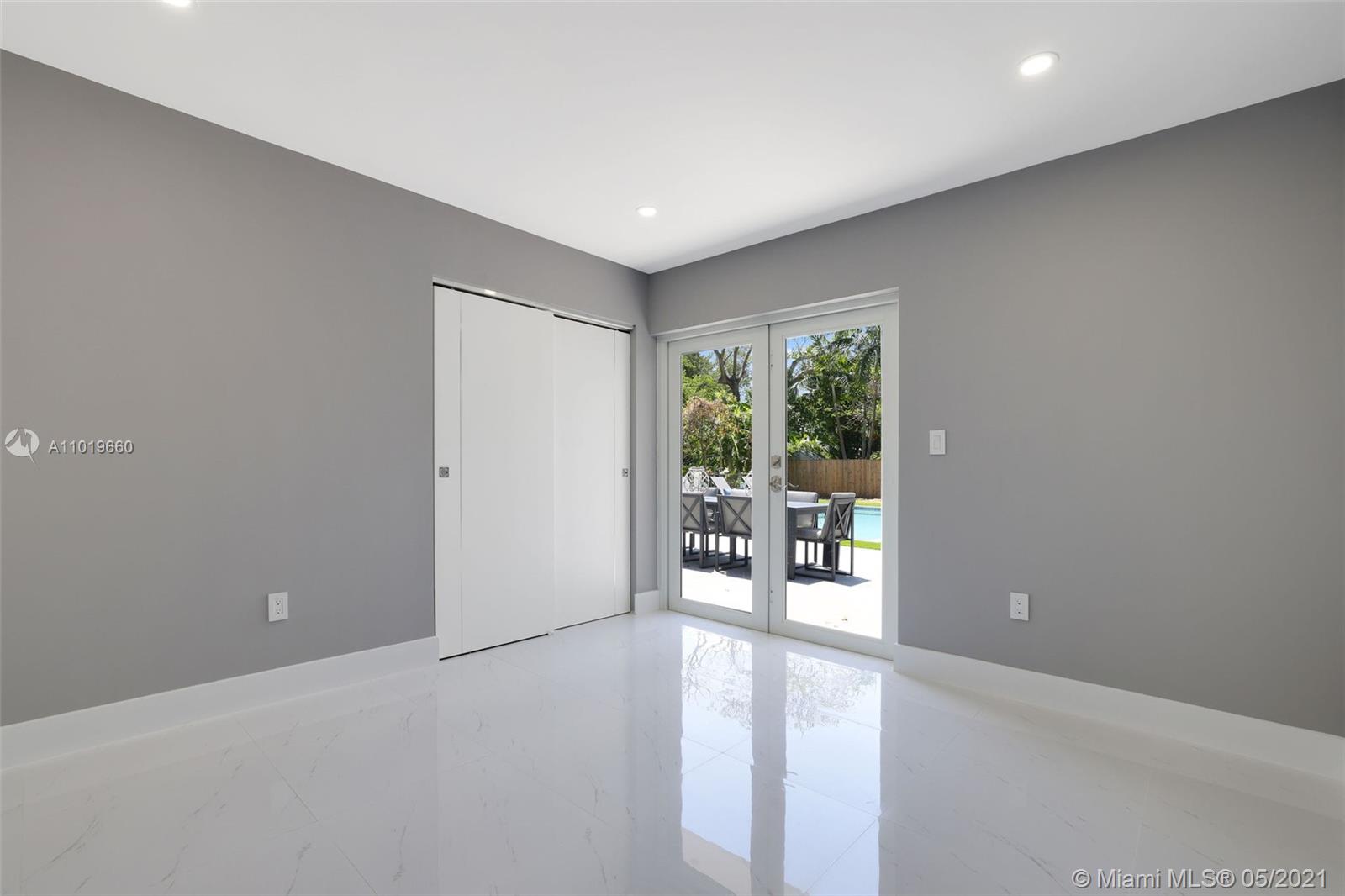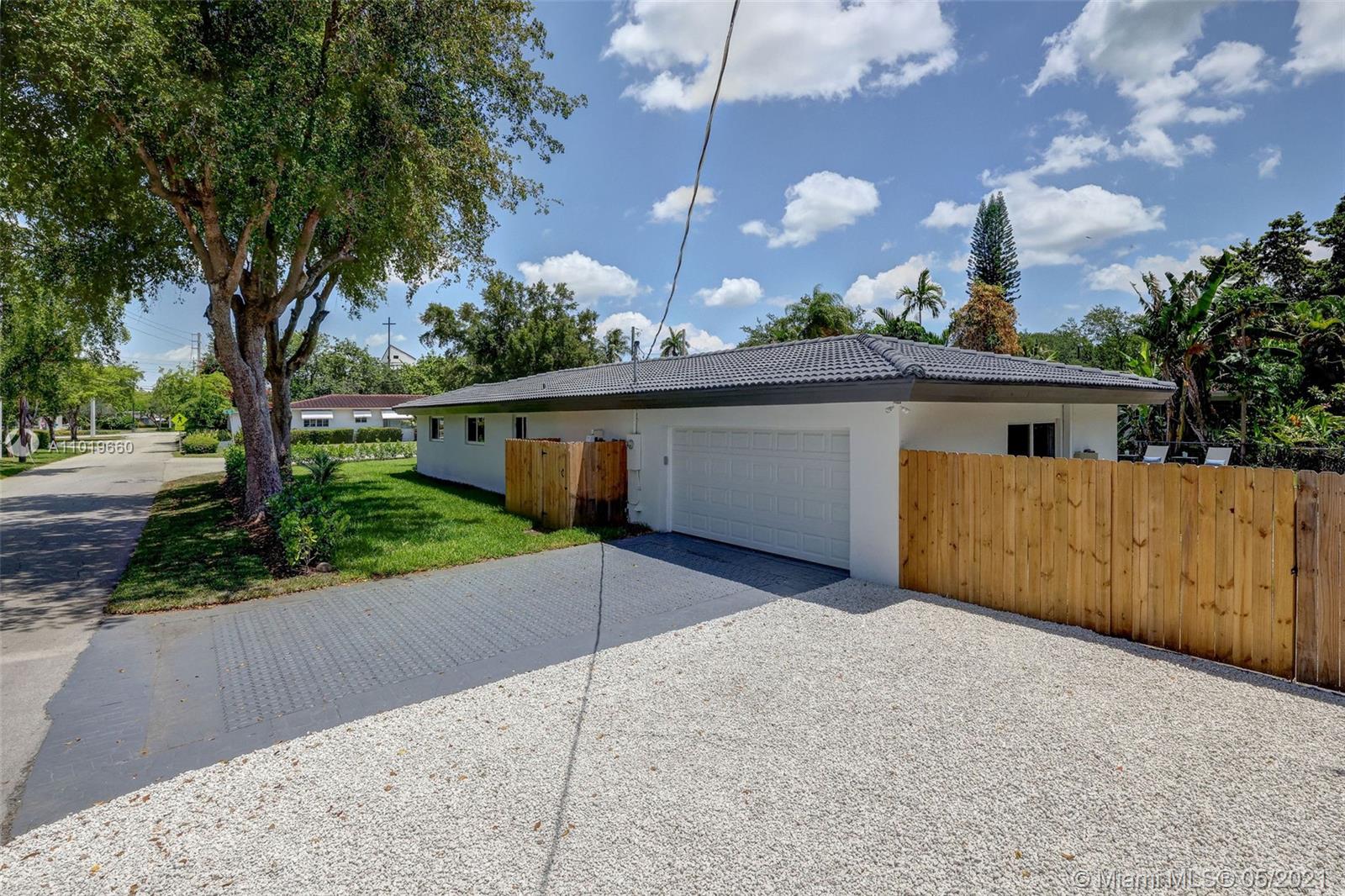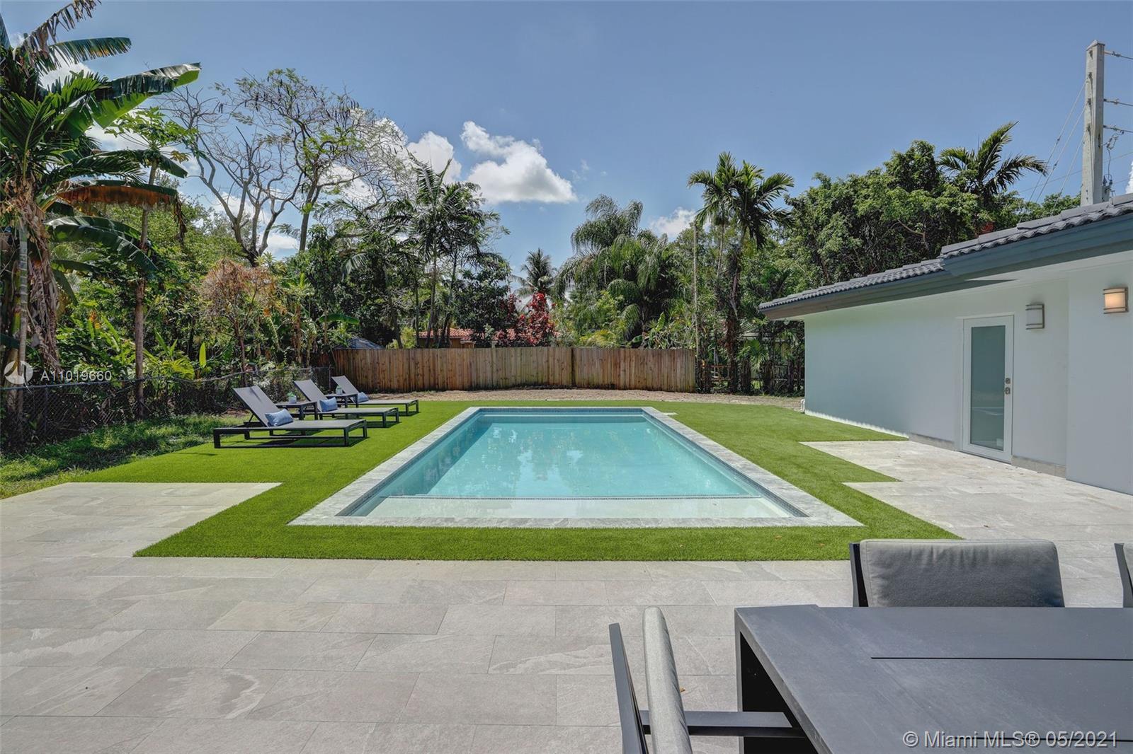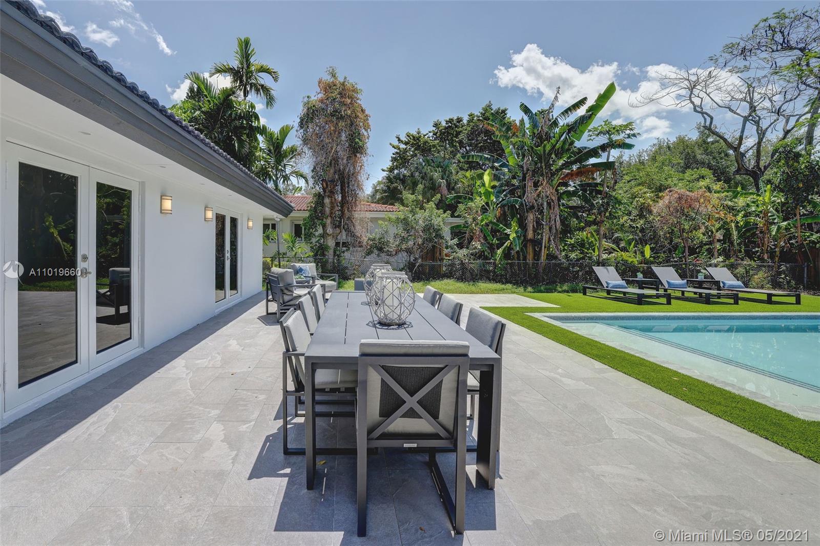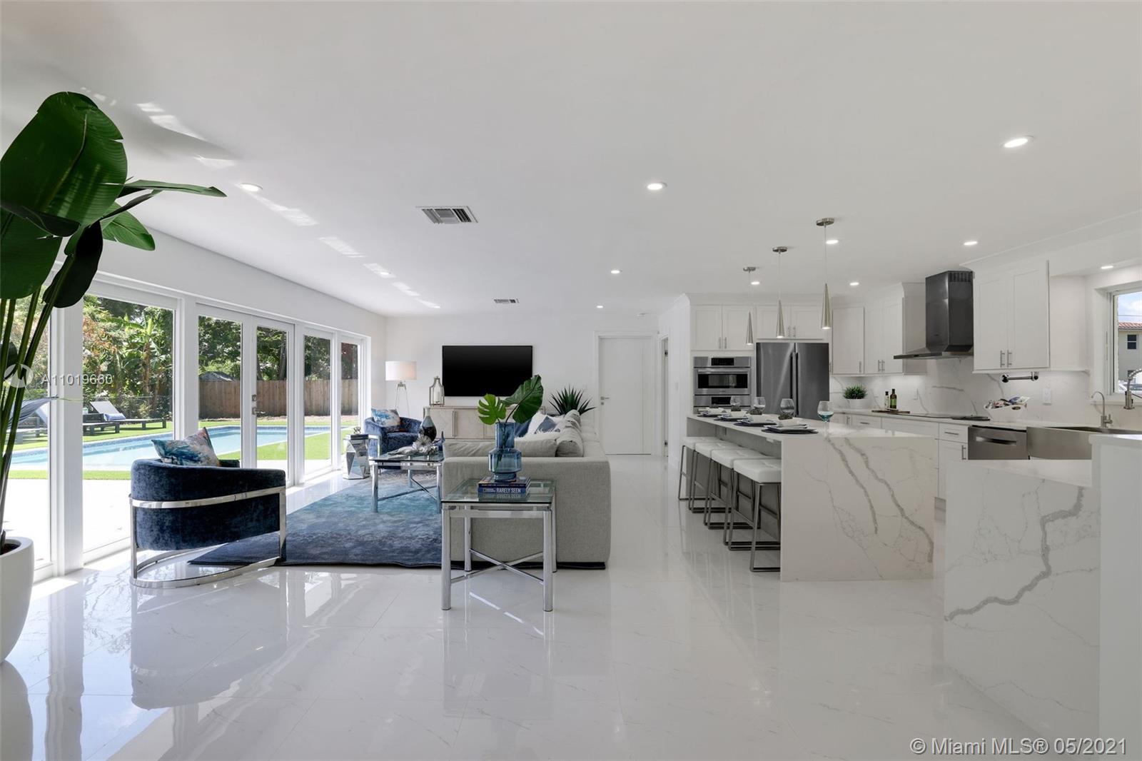 Miami Shores Pool Home! This jewel is situated on a sprawling 1/3 acre corner lot. Completely gutted and tastefully renovated. Just completed - May, 2021. Must see! This gorgeously finished 4 Bed/2.5 bath residence features a bright and spacious design providing abundant natural light, appealing white porcelain tile flooring throughout, a large 2 car garage, impact windows/doors, and sleek spa-inspired bathrooms. The chef-inspired kitchen is equipped with brand new Bosh appliances, quartz counter tops and custom cabinetry. Central kitchen island with bar seating and separate dining space allow for numerous spots to entertain. The open floor plan is ideal for indoor/outdoor living. All bedrooms and living spaces open to your newly installed pool and serene patio area with complete privacy.