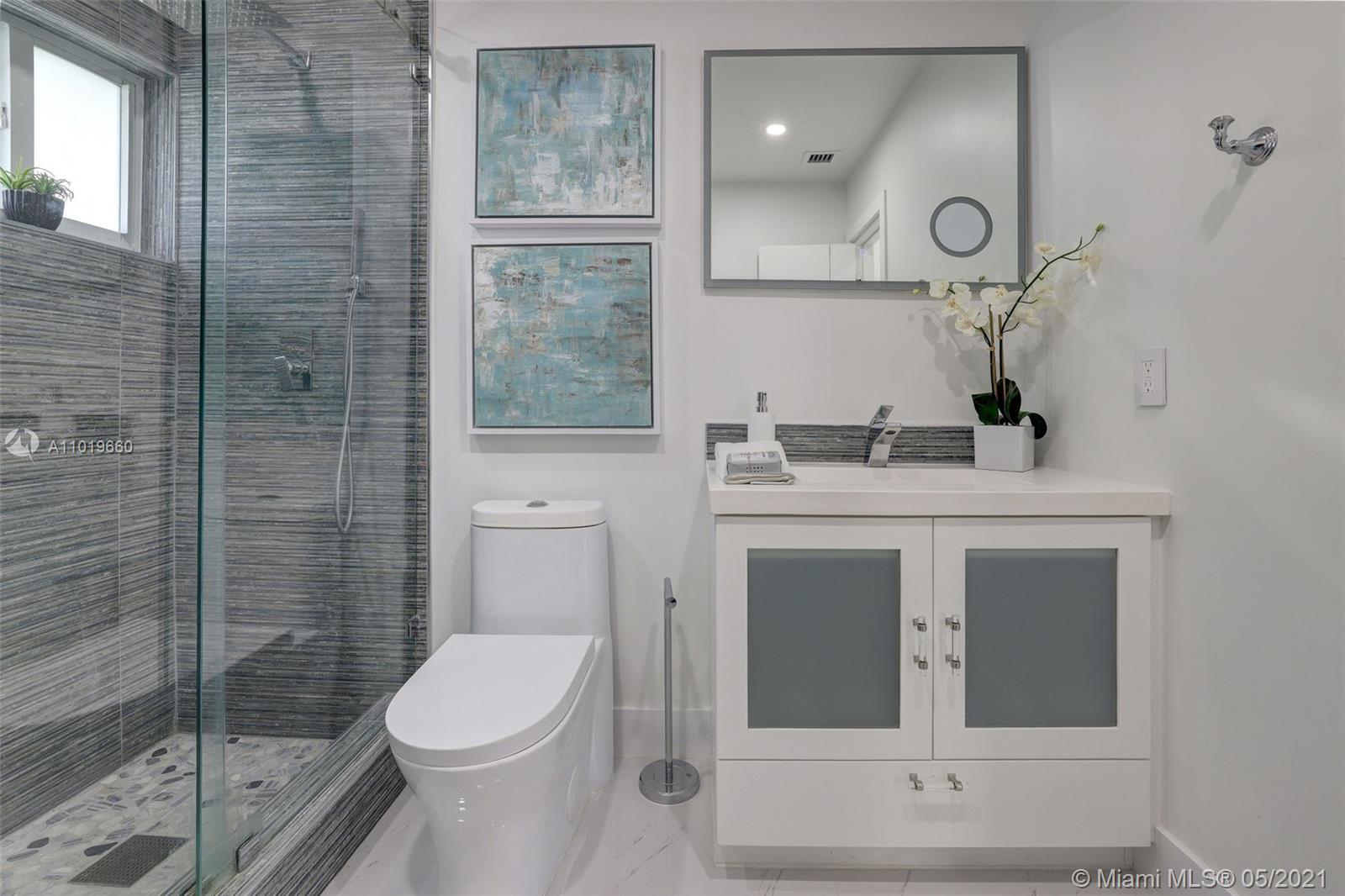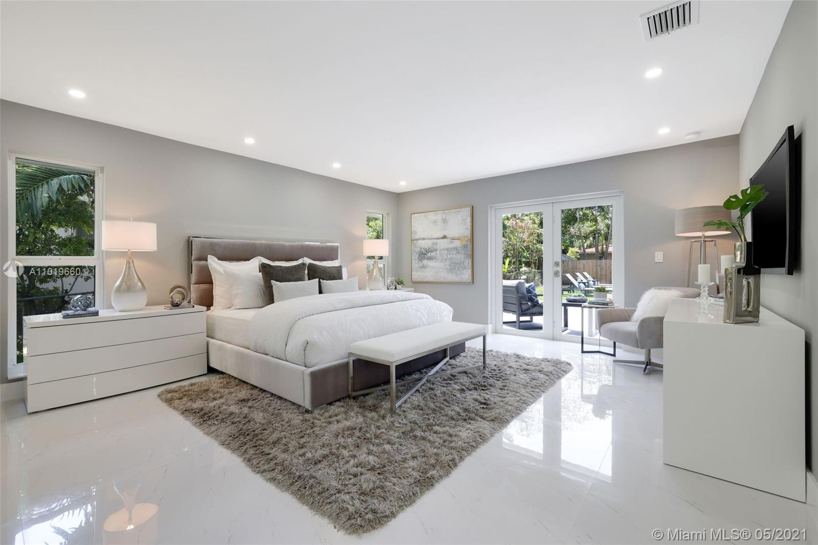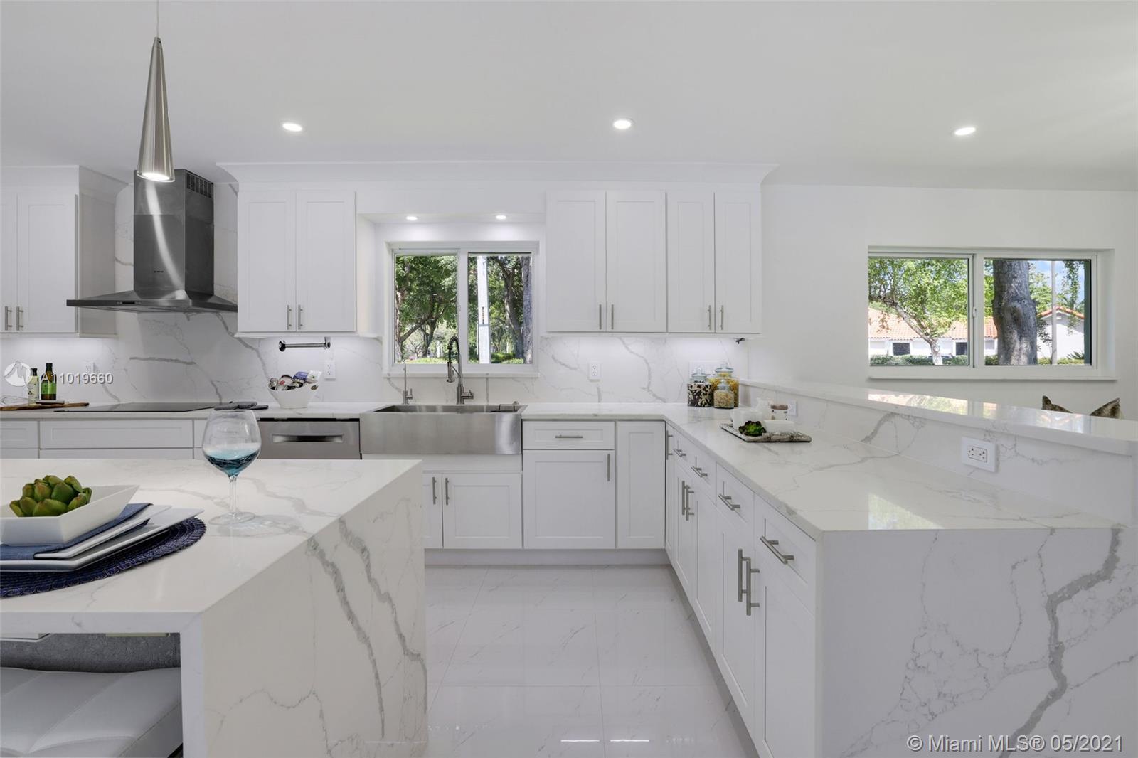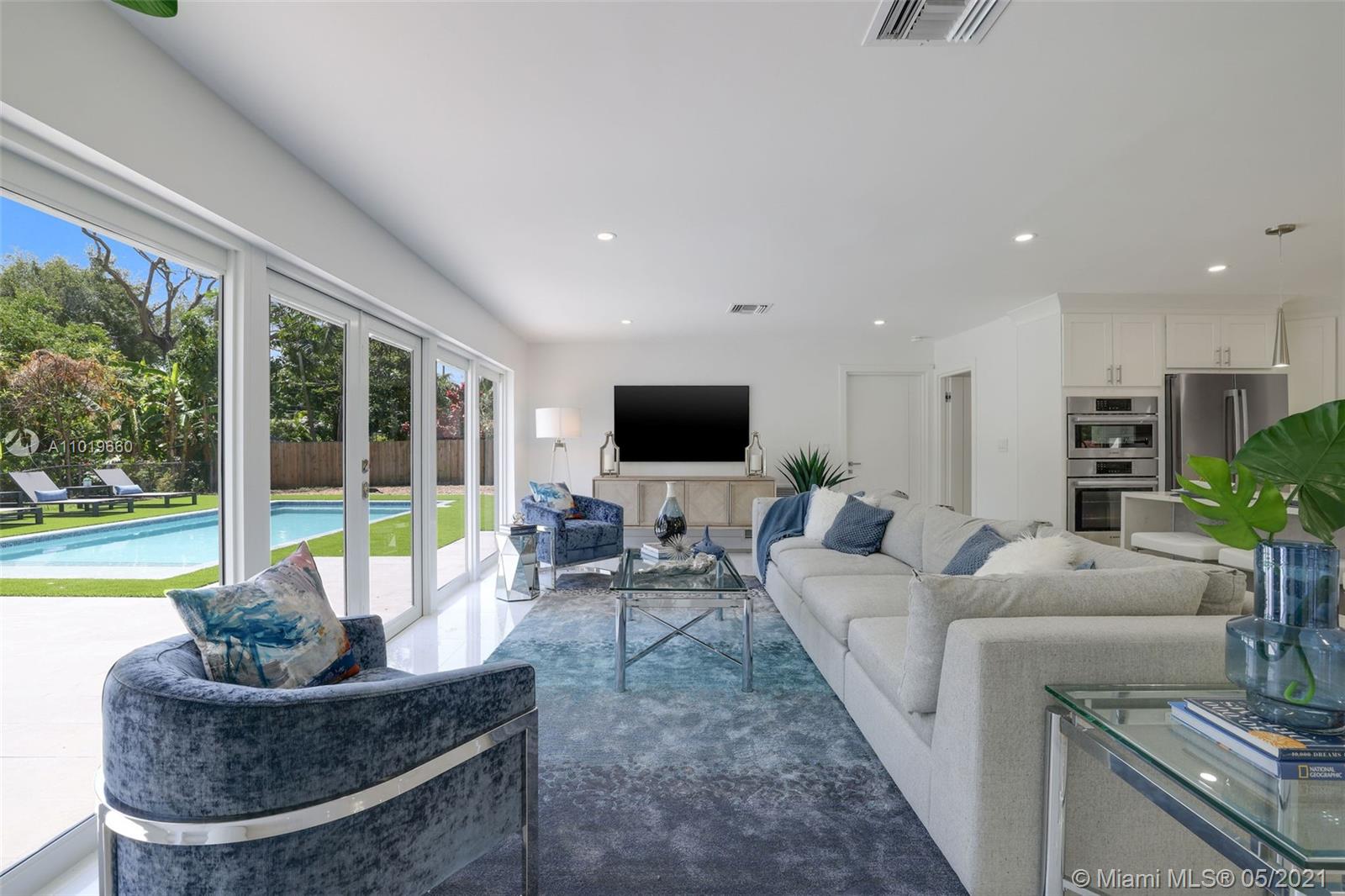 Miami Shores Pool Home! This jewel is situated on a sprawling 1/3 acre corner lot. Completely gutted and tastefully renovated. Just completed - May, 2021. Must see! This gorgeously finished 4 Bed/2.5 bath residence features a bright and spacious design providing abundant natural light, appealing white porcelain tile flooring throughout, a large 2 car garage, impact windows/doors, and sleek spa-inspired bathrooms. The chef-inspired kitchen is equipped with brand new Bosh appliances, quartz counter tops and custom cabinetry. Central kitchen island with bar seating and separate dining space allow for numerous spots to entertain. The open floor plan is ideal for indoor/outdoor living. All bedrooms and living spaces open to your newly installed pool and serene patio area with complete privacy.
