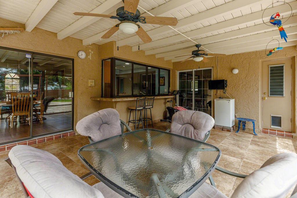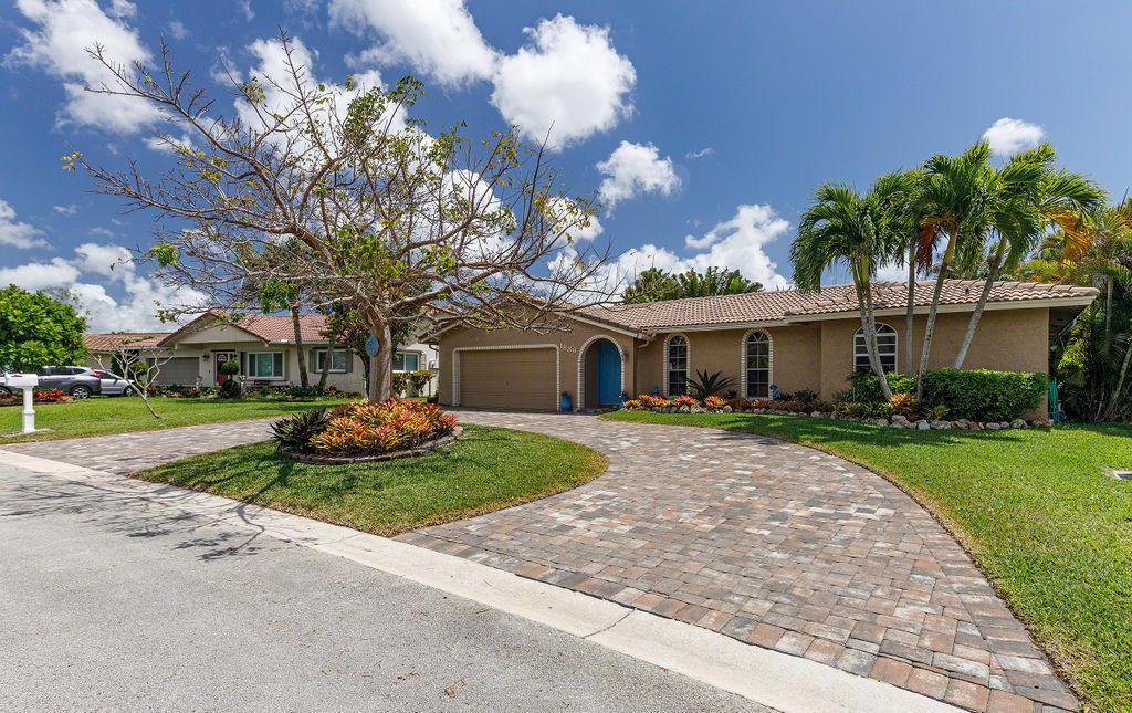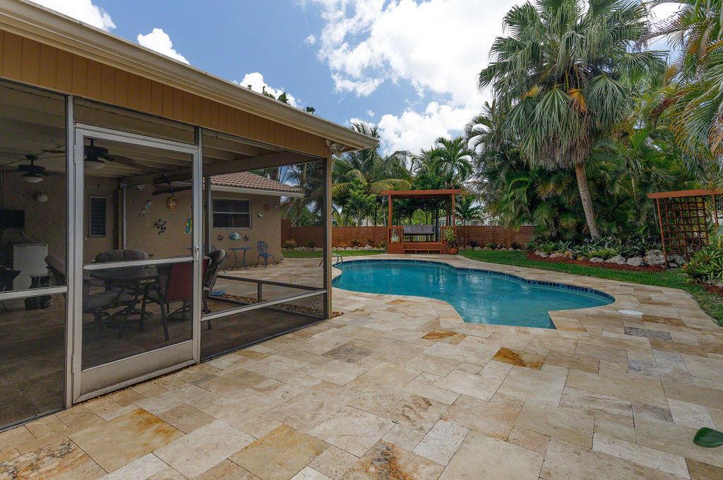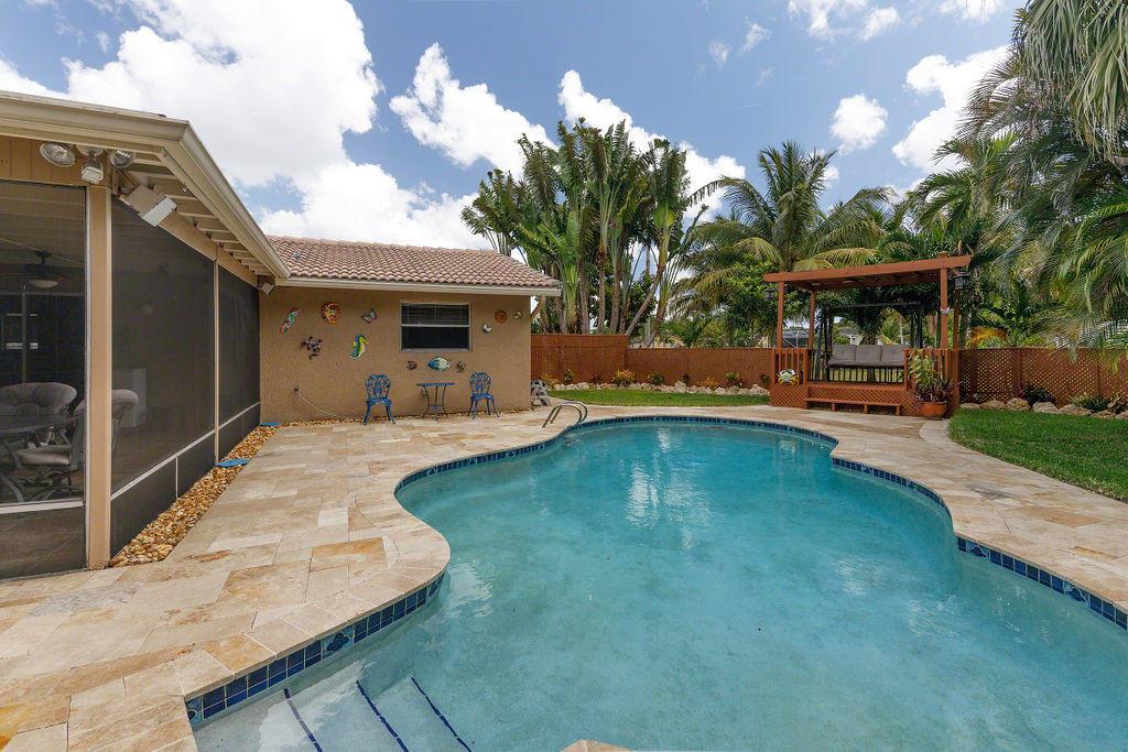 Desirable Ramblewood 4 Bedroom, 2 Bath split bedroom plan with 2 car garage, Pool home in a quiet neighborhood with a Circular paver driveway. Spacious living area with large Master Bedroom with large walk-in shower, free standing tub and walk-in closet. Updated and great size kitchen, granite countertops, with stainless steel appliances. The backyard is a private resort like retreat! Fenced yard, sparkling Pool and screened in patio that is perfect for entertaining or relaxing. Pool deck has Travertine Marble pavers with steps leading to the Gazebo which is surrounded by a privacy lattice wood fence. There is a wooden archway leading to the rest of the yard with mature Coconut palms and overlooking the canal.