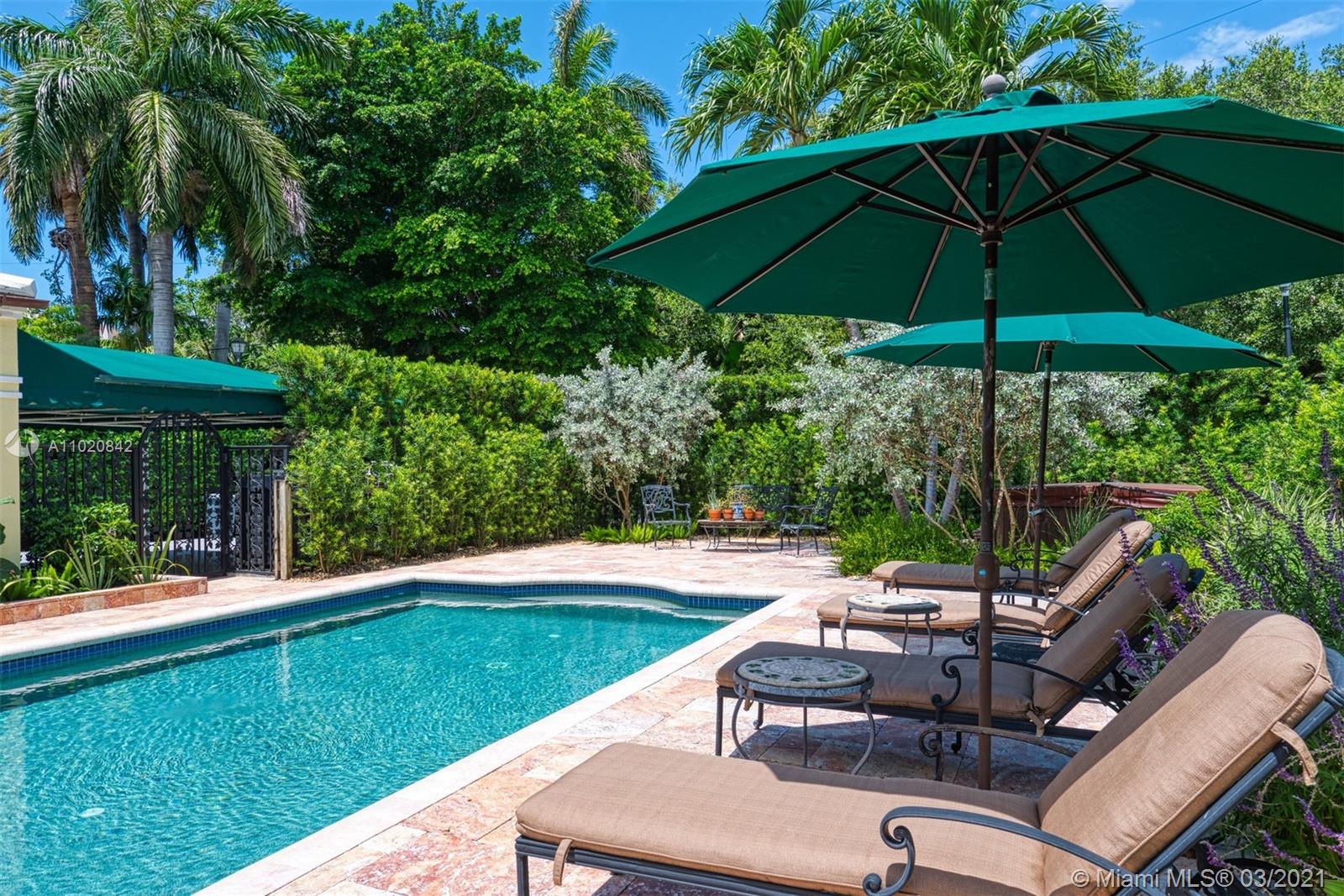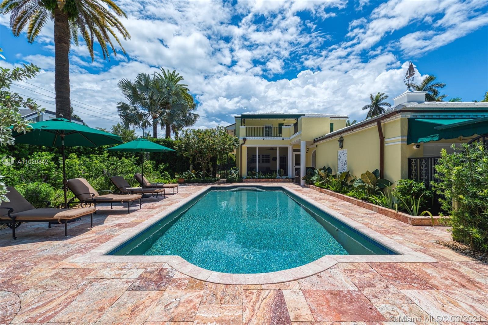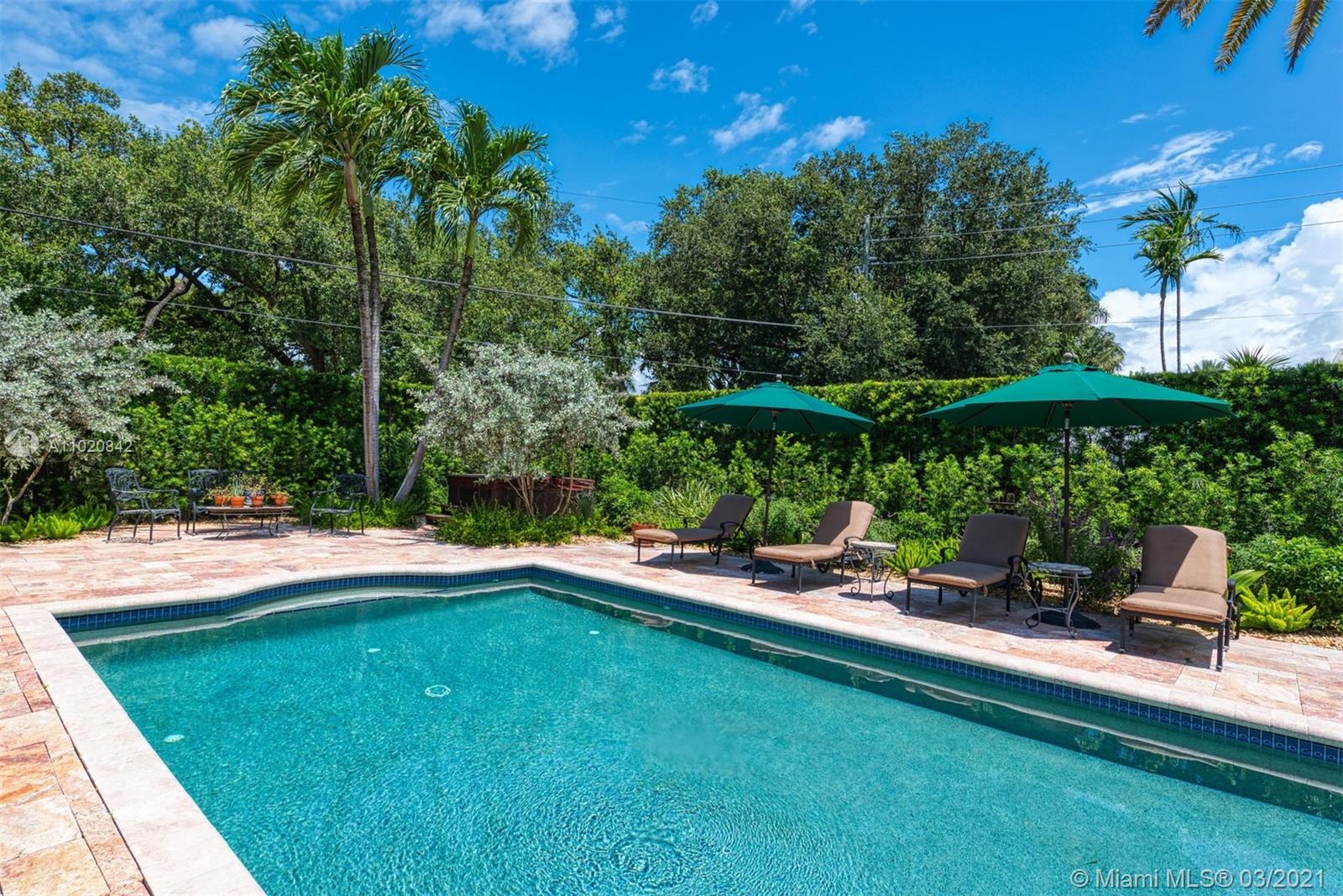 Enjoy living in your own private oasis located on a corner lot on the prestigious & gated Sunset Island III. Private & lushly landscaped w/ an oversized pool, separate guest room & renovated cabana bathroom. This 5 bed, 4.5 bath home sits on one of the largest corner interior lots (12,448 sqft) on Sunset III & IV. Property includes a fireplace & exquisite French sliding doors lead into private formal dining. Open kitchen complete w/ Sub Zero fridge,2 Miele dishwashers, Miele dual ovens, built in warming drawer, dual-zone wine cooler & gas GE Monogram 4 burner cooktop w/ griddle. The master bedroom suite boasts soaring ceilings, an oversized walk-in closet, marble double vanity bathroom. Front circular driveway and side carport covered driveway, 2 car garage and whole house generator.