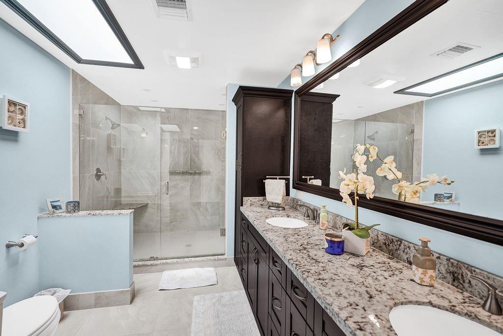 Substantially and tastefully remodeled; beginning with the expertly designed and meticulously maintained tropical landscaping, custom stamped concrete driveway with matching patio and poured concrete flower beds, premium stack stone accents on the facade, handmade mailbox with stone, and all hurricane impact windows and doors including skylight. Open living area with vaulted ceilings, custom kitchen complete with seamless premium granite, soft close cabinets and drawers with brushed aluminum fixtures, under cabinet lighting, properly ventilated stainless steel range hood, stainless steel appliances and glass top stove, dual pantry with pull out shelving, lazy susan, and wood plank style ceramic tile, 5x8 island bar. MBR walk-in closet, dual sinks + frameless glass shower door... cont. supp