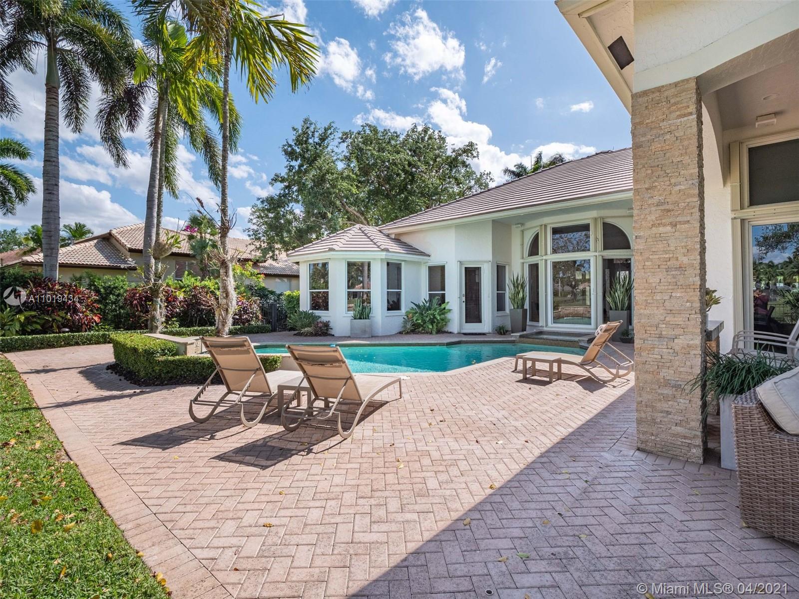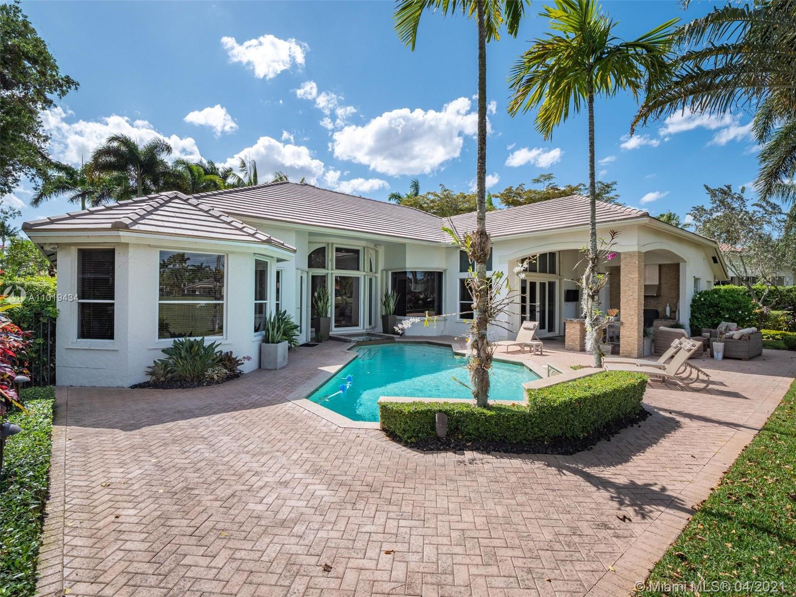 Meticulously maintained 4,364sf 5 bed/4bath/office home located on the Players Course 7th hole in Weston Hills Country Club has it all. This professionally decorated home has an open floor plan with 14' ceilings and upgrades throughout. Modern kitchen with all the top stainless steel appliances. Marble and porcelain wood-like tile floors. Huge floor to ceiling windows w/ motorized shades provide an impressive backdrop for any gathering. Oversized backyard with heated pool, spa, summer kitchen and beautiful golf course views. 2021 ROOF. Accoridan shutters. 3-car garage w/ Chicago brick pavers.
