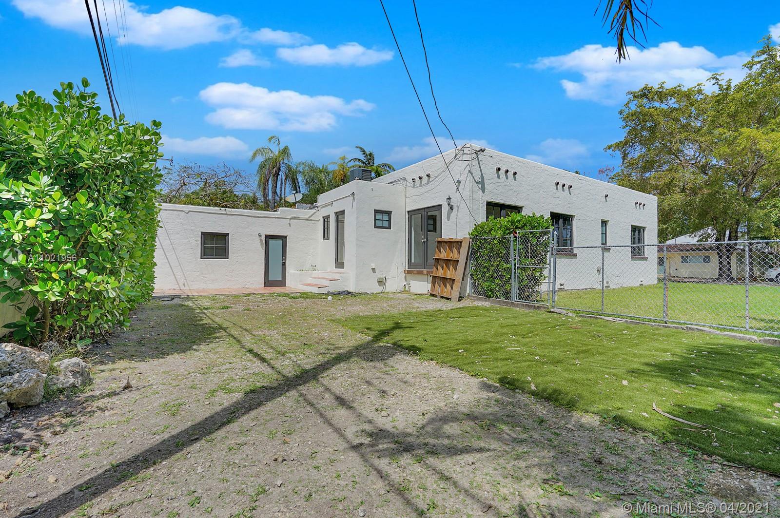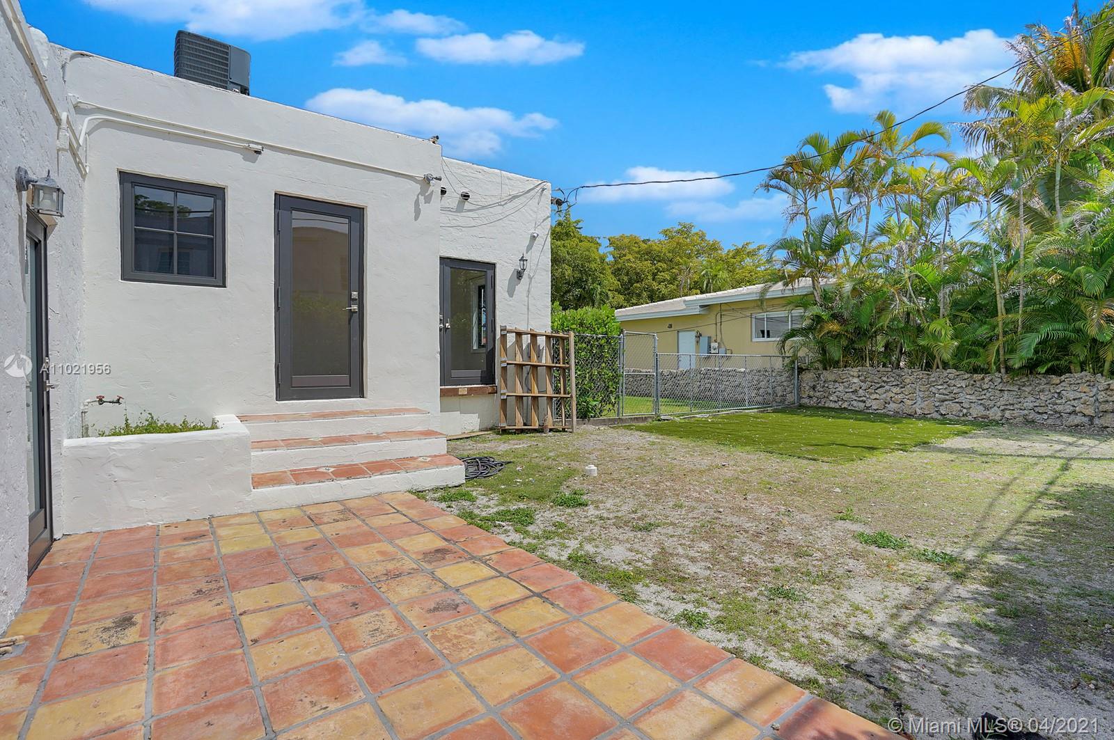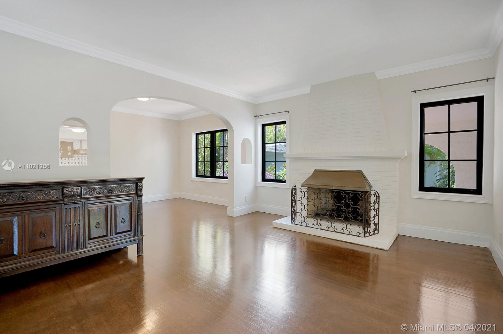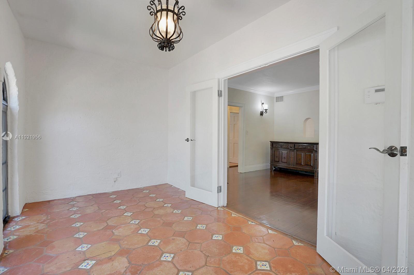 Stunning traditional Coral Gables, Spanish-style home. Consists of a 2-bedroom, 1.5-bath main house with foyer and office space that opens to the back yard; plus, a separate 1-bedroom, 1-bath guest house with kitchen area. Floors are combination of Spanish terracotta with mosaic inserts and wood floors, working fireplace, impact windows Gated carport. New septic system. Large side yards occupies half the lot. New kitchens and laundry room appliances will be needed as old ones have been removed.