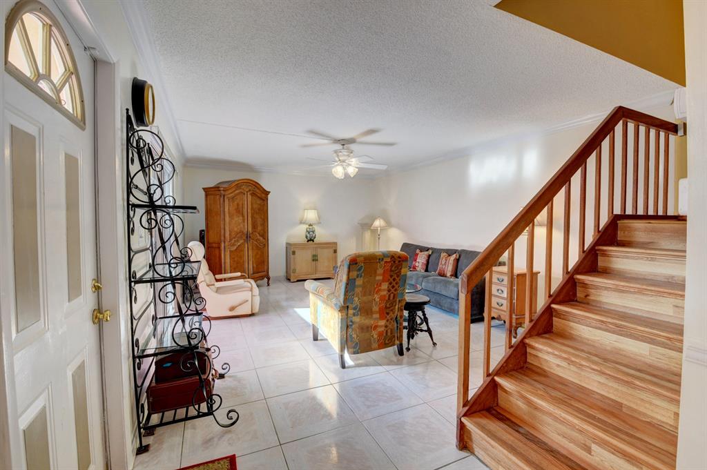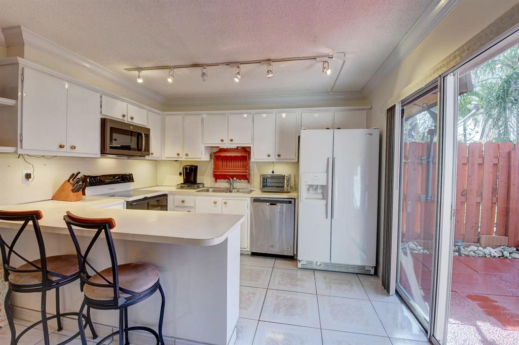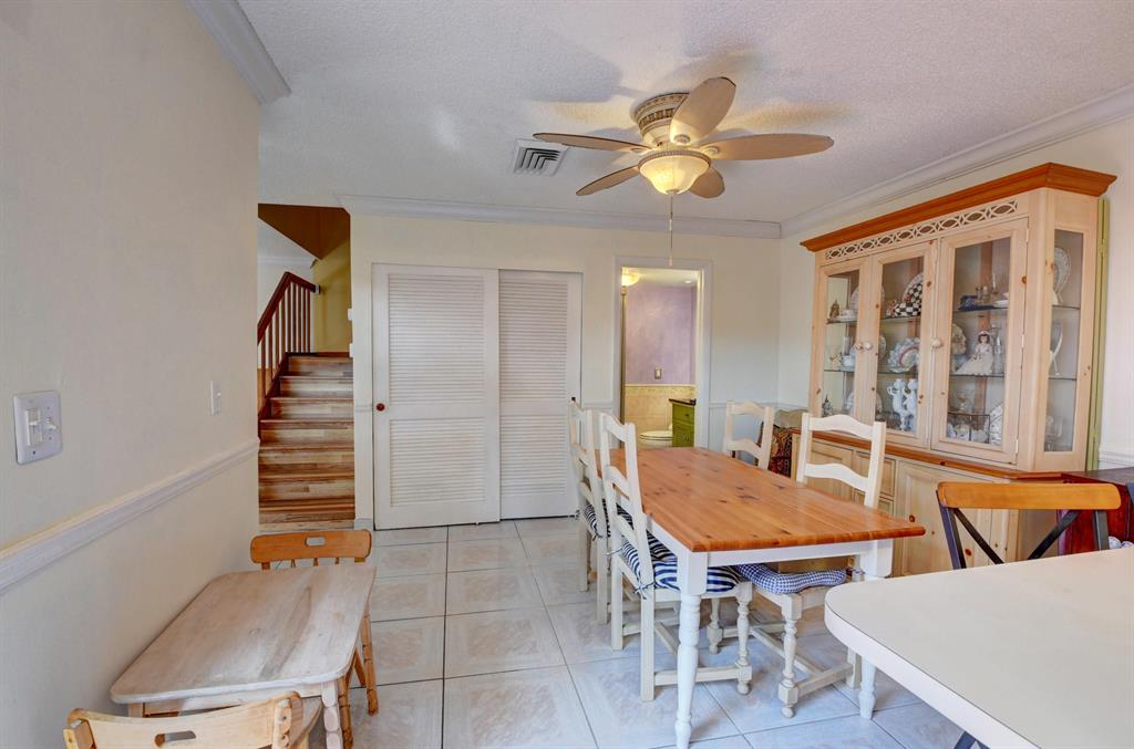 This charming townhome is waiting for you to make it your own! Private courtyard made for entertaining with concealed shed for extra storage on the side of the unit. New interior paint, ceramic tile, crown molding, updated ceiling fans, lever door handles, and new blinds. Kitchen has snack counter and pantry. Updated bathroom and shower with glass door, an imported sink from Mexico on first floor. Oversized sliders let in lots of natural light and expand your entertaining space. Hard wood floors on staircase and throughout second floor. Newer A/C and thermostat, complete set of hurricane panels, spacious master bedroom with wall to wall, floor to ceiling closets. Large secondary bedroom with built in bookcases, lots of closets and storage space. Upstairs bath has double vanity sinks with