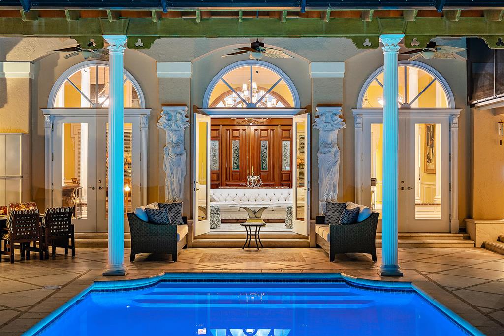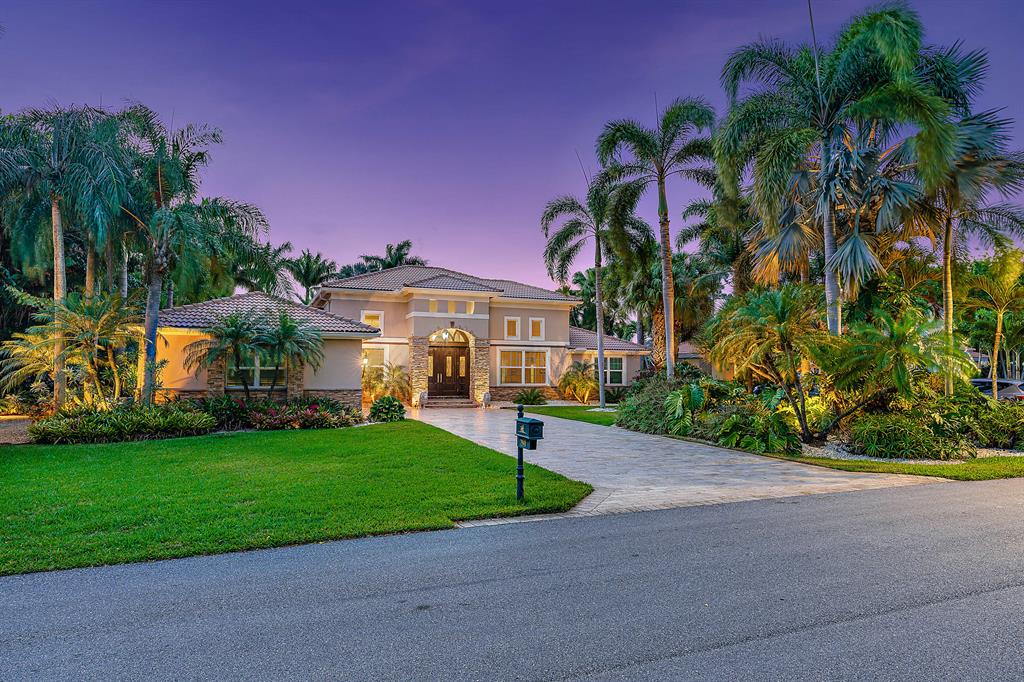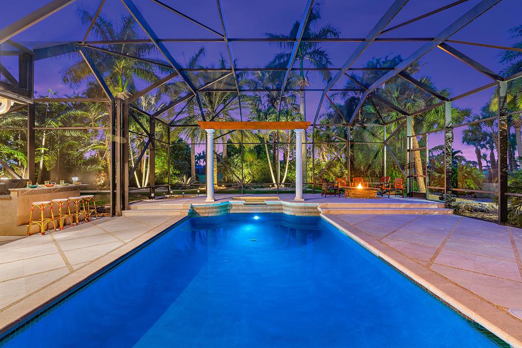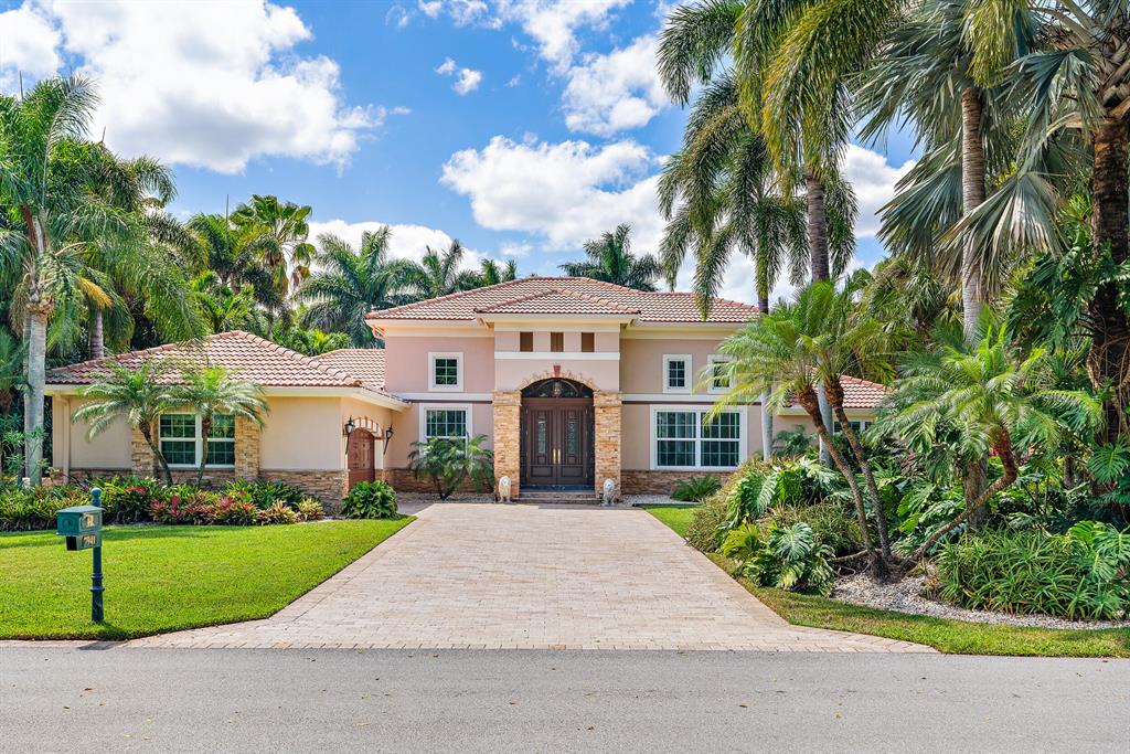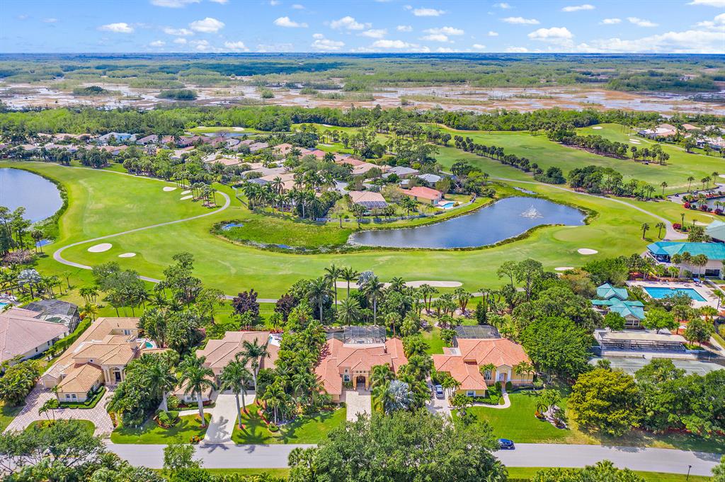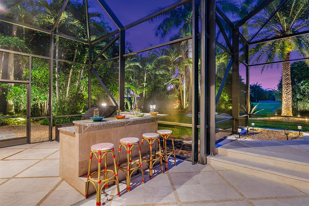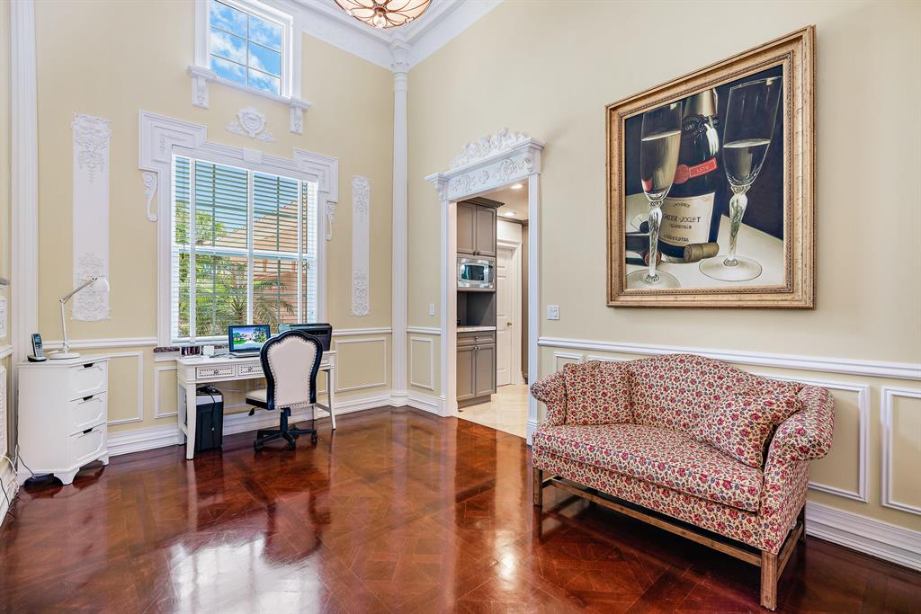 A move-in ready ''mini-mansion'' situated on the 18th fairway. This exquisite home boasts many unique fixtures and finishes including 17-ft ceilings accented with Euro-style, moldings and appliques. A beautifully renovated kitchen includes coffered ceilings, custom wood cabinets, double ovens, warming drawer, gas cooktop and marble countertops that open to an adjoining den. Gorgeous parquet floors in the great room accentuate 3 sets of French doors which open to the resort-style, patio equipped with heated pool, gas fire pit and summer kitchen. Both the master suite and cabana guest suite open onto the pool deck. The automated saltwater pool & spa overlook a tropical outdoor oasis. Full house protection ensues with a Generac generator and impact windows. Club membership not required.