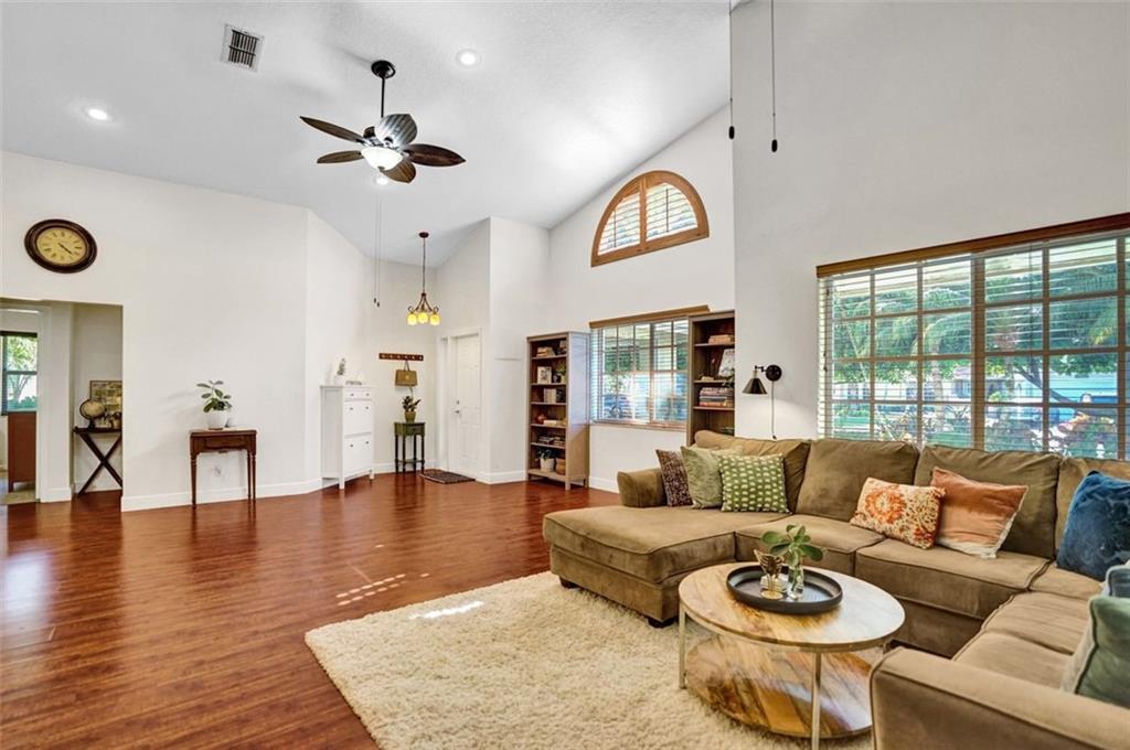 Turn-key split bedroom floor plan, 4/2, cul-de-sac home in Oak Knoll Estates. Impact windows/doors, open floor plan, vaulted ceilings. Roof 6 yrs. Updated kitchen, SS, granite, breakfast bar. Large dining room for 10, French doors leading to a screened-in lanai, large oak trees, perfect for out door entertaining. Pavers driveway, front patio, sides & extended backyard. Beautiful landscaping, fruit trees. Secluded neighborhood surrounded by nature to enjoy, easement access to the protected Pine Island Ridge Nature Preserve, with 5 miles of walking, biking, and horse trails. Membership to Pine Island Ridge Country Club w/access to golf course, swimming pools, gym, banquet hall, restaurants, & bars. Near I-595, shopping areas, universities, airport, walking distance to top rated schools.