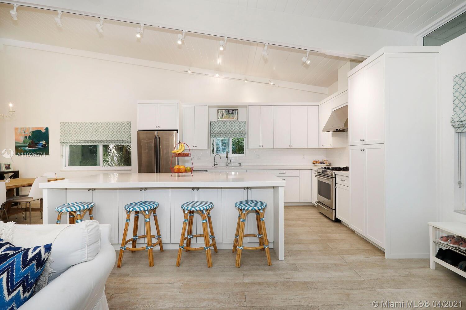 Tropical bungalow with a “coastal” vibe. Totally renovated & expanded by current owners. Light-filled, open living spaces feature high, wood-beamed ceilings & a soothing white color palette. Stunning new kitchen has wood cabinetry, gas range, quartz countertops & an oversized island w/ bar seating. Other updates include: new bathrooms, custom closets, impact windows & doors, tankless water heaters and Italian porcelain tile flooring. Master suite offers an oversized walk-in closet & overlooks the garden. Separate family room opens to spectacular, ultra-private outdoor space w/ deep covered terrace, new heated/saltwater pool & an expansive garden w/ lush tropical landscaping. Walk to nearby parks, top schools and to the Grove village center’s many galleries, boutiques, restaurants & cafes.