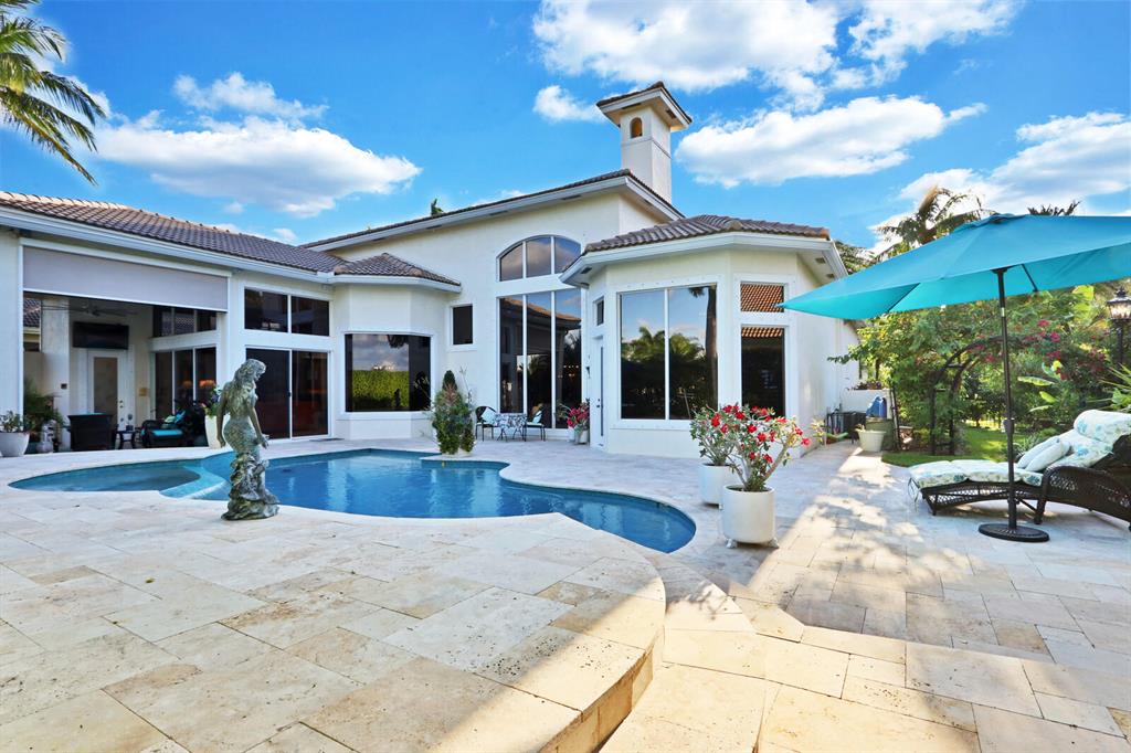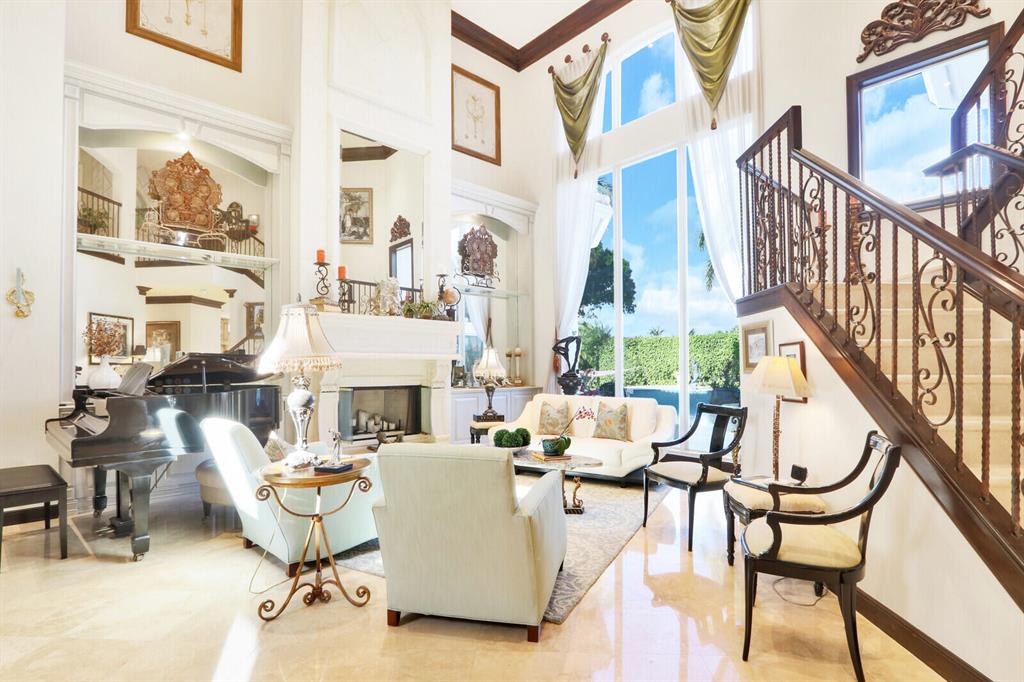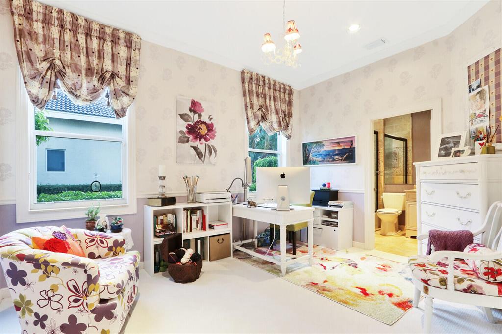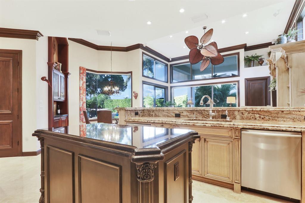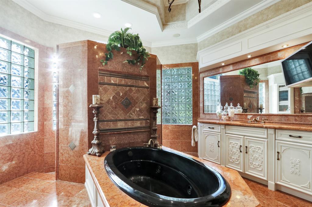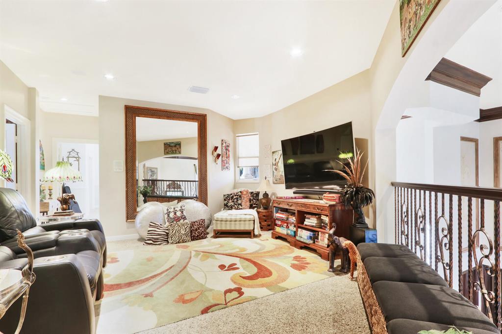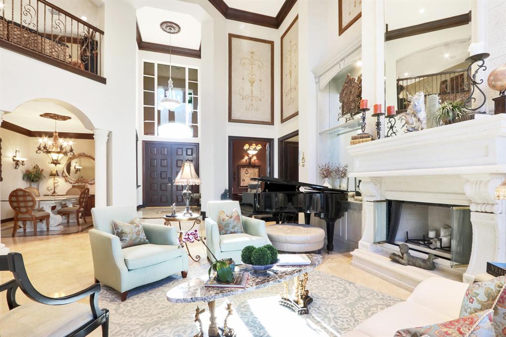 This upgraded and immaculate 5BR/5.2BA+Den estate boasts numerous recent improvements including a $130,000 pool and patio renovation. The dramatic two-story living room features a fireplace with refinished cabinetry, a wood and wrought iron staircase with polished marble flooring leading you upstairs to three bedrooms, two baths, and a versatile loft space. The main living areas feature oversized polished marble flooring in a light, creamy color. The master bedroom features new, upgraded wood flooring. Every room in this home features luxurious upgrades and custom details, adding sophistication and opulence. The freshly painted interior features moldings, elegant built-ins, custom designer window treatments and luxurious touches throughout.