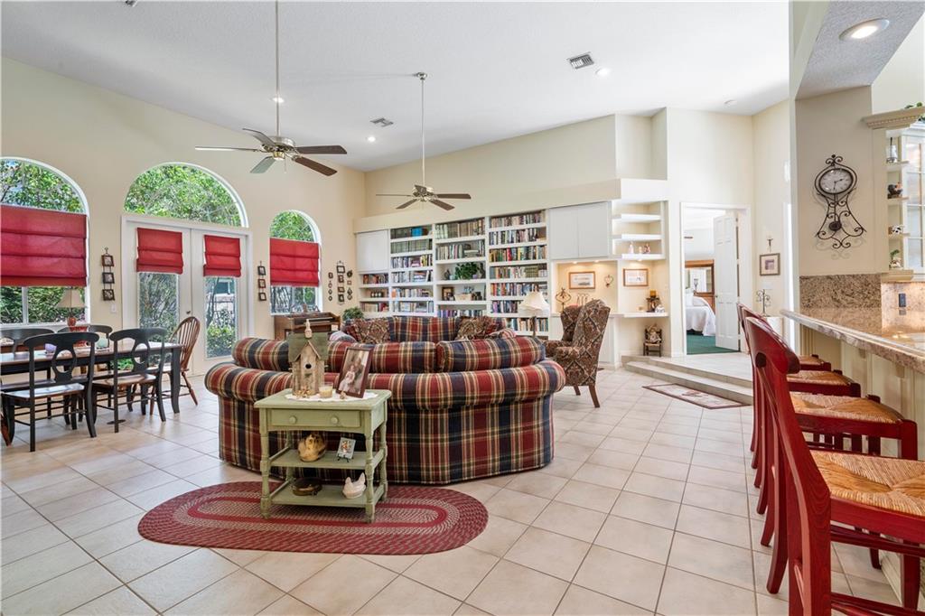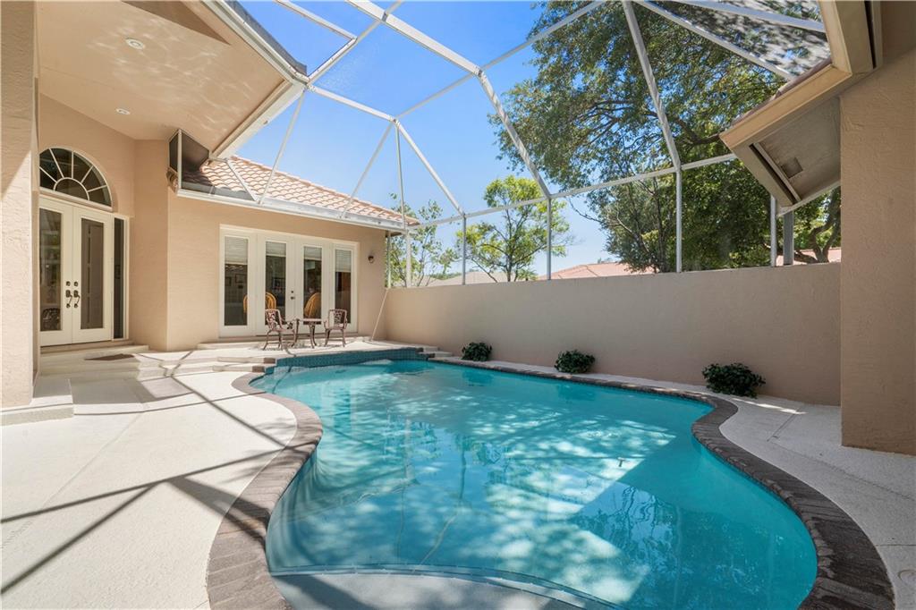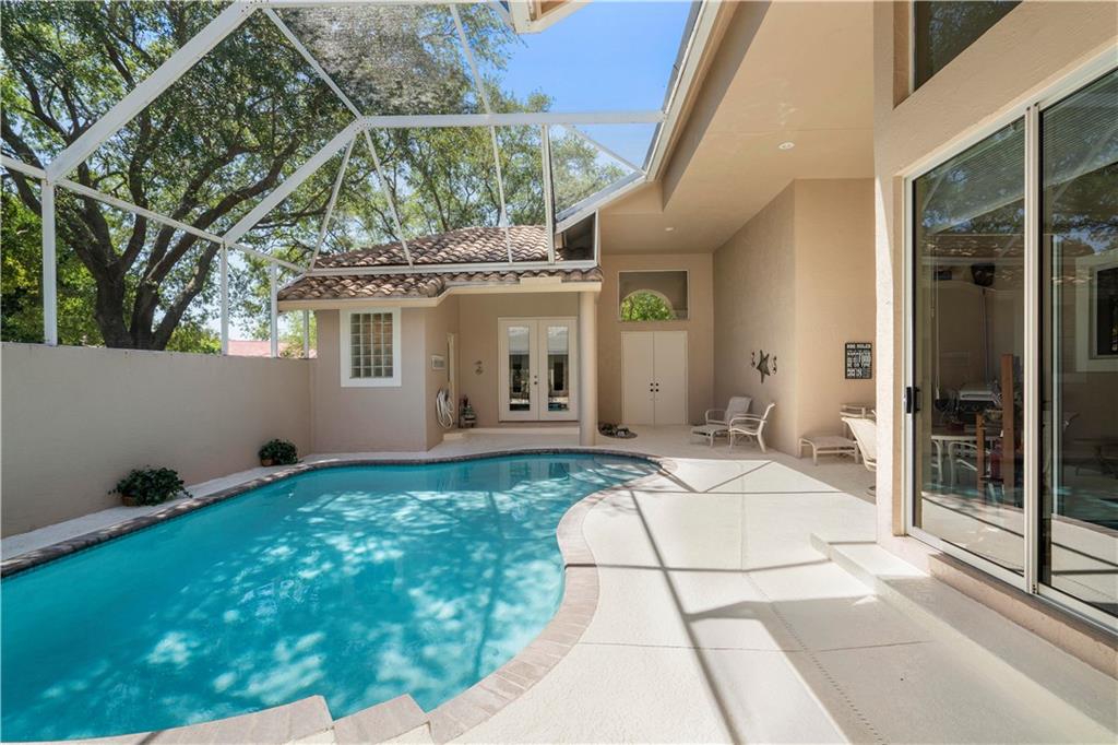 Popular Courtyard Home with separate 1 Bedroom 1 Bath Guest House. Raised foyer entry to huge great room with high volume ceilings, palladium windows and full wall built-in bookcase and bar. Remodeled gourmet kitchen features lots of cabinets space, all stainless steel Frigidaire appliances including double convection wall ovens, granite countertops and backsplash, snack bar and big walk-in pantry. Big breakfast room with views of pool/patio. Master suite with updated bath. Large secondary bedrooms with laminate and "wood look" ceramic tile flooring. Lots of fans, closets, high hat lighting and transom windows throughout. Domed, screened pool re-marcited in 2012 with large covered area & built-in bar, great for entertaining. Three car garage and stamped concrete driveway.