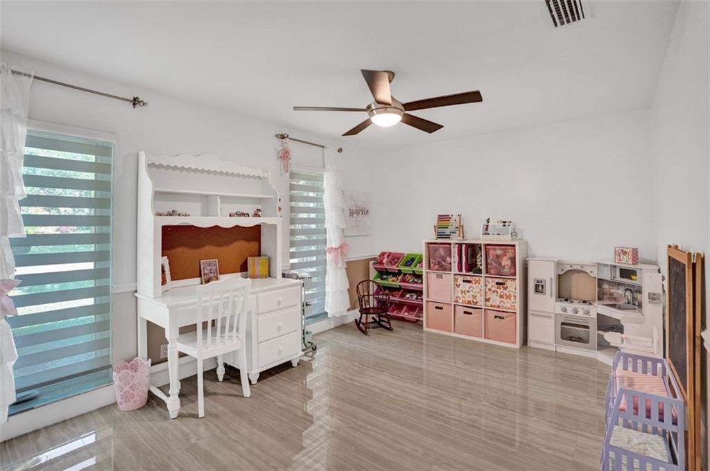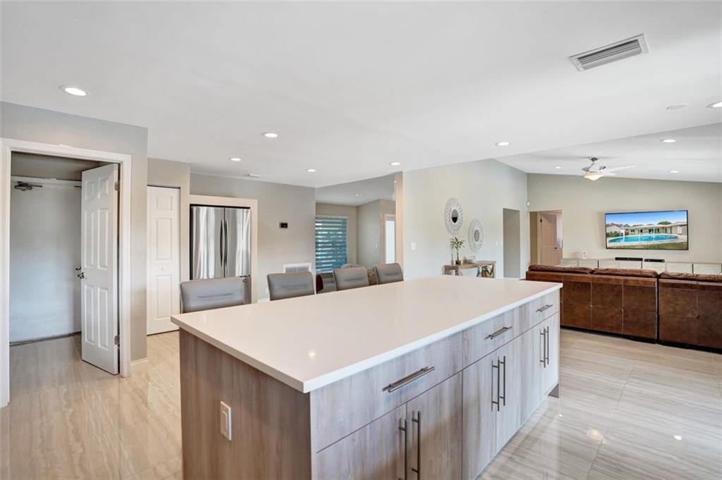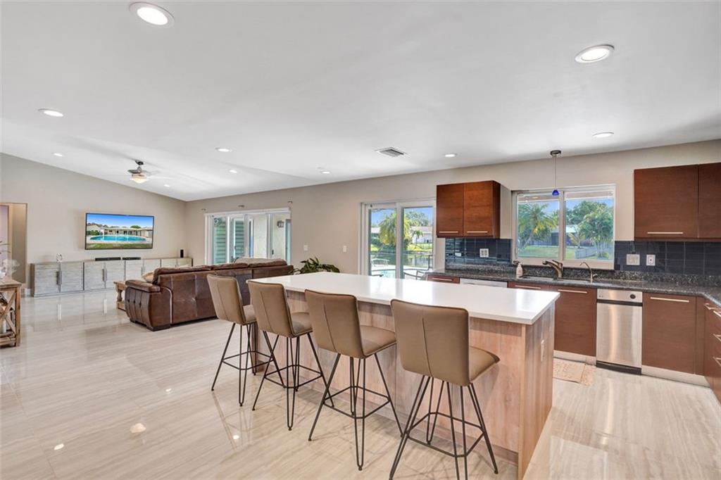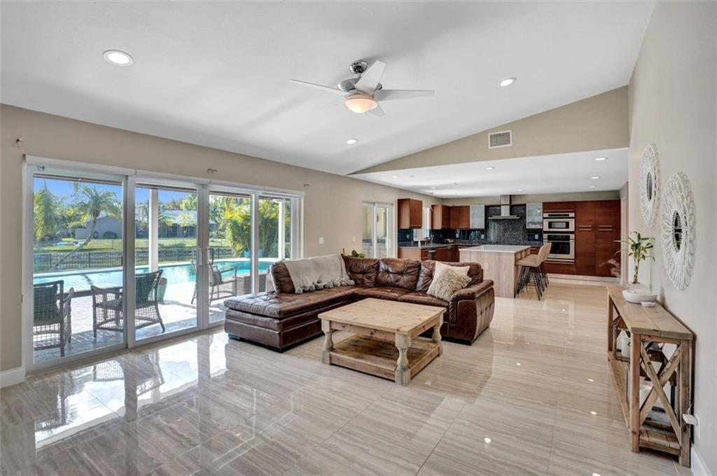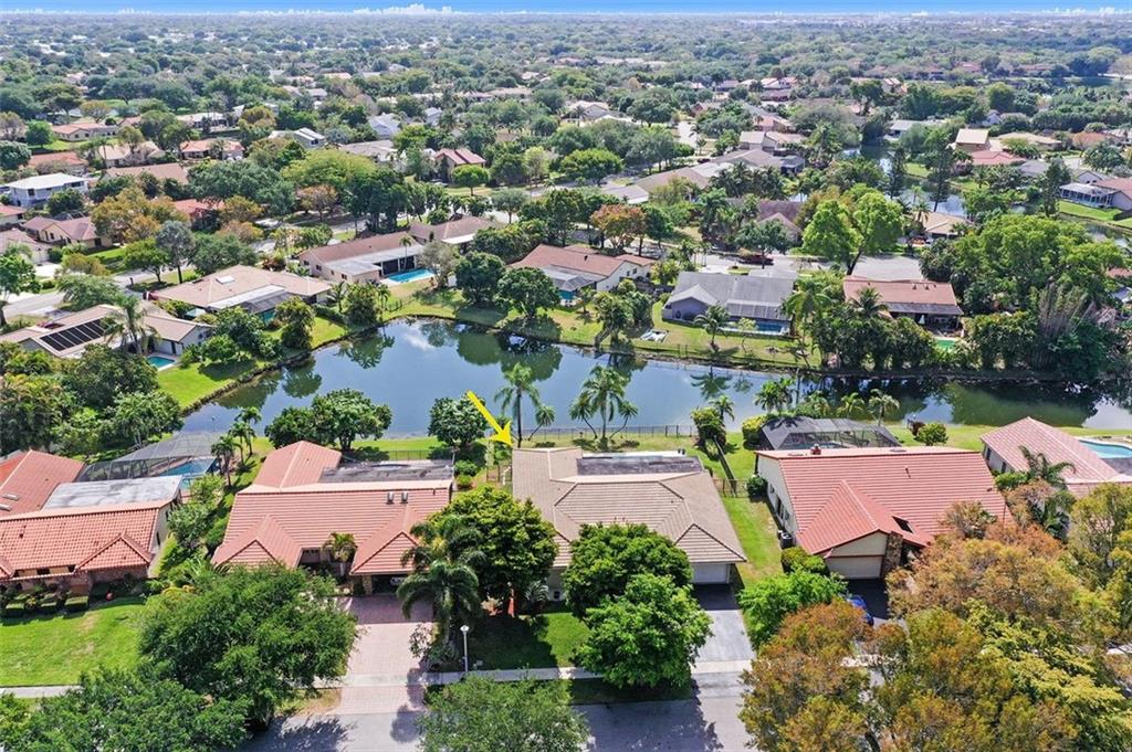 This turn key four bedroom/two bath home, located in the family oriented neighborhood of Jacaranda Lakes. This home offers vaulted ceilings, porcelain tile through out, impact windows and doors in an open floor concept. The spacious kitchen features stainless steel appliances, granite and quartz countertops with a newly installed island with extra storage. Family room, kitchen and master over look covered patio , with newer 2019 diamond bright ,salt water pool with extended travertine marble pavers. With views of the lake, perfect for family entertaining on 10,360 SF lot. Contemporary blinds on windows 2019, Master bath updated 2021, second bath 2017 and A/C 2017, all add to this well maintained home. Enclosed Zen Garden, Sapodilla fruit trees and black aluminum fencing on along lake.