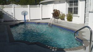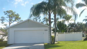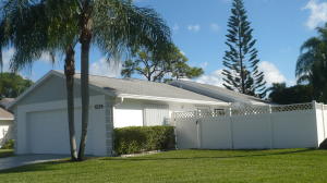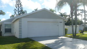 Rare opportunity to own a single family home with a private pool on an expanded corner lot in a gated WPB neighborhood! Attractive and functional floorplan with vaulted ceilings, a true living & dining room, split bedrooms and sliding glass doors that open onto the inviting open pool and patio area with privacy fencing. Other special features include accordian hurricane shutters on all windows, a newer renovated bathroom with glass shower enclosure/pedestal sink and linen closet and newer neutral carpet throughout. To complete the overall charm, the corner lot is expanded offering more yard than most houses in the neighborhood and is enhanced by mature tropical palm trees.