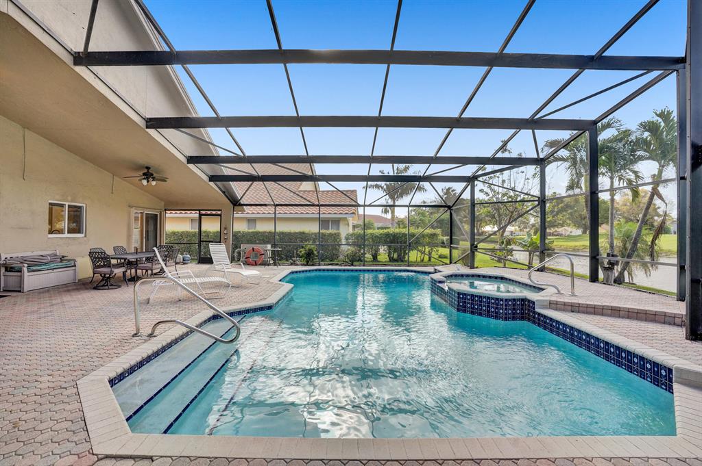 You will love the view when you walk into this beautiful home..... a 1-story pool home with both water and golf course views from many rooms. The high ceilings in the living and dining rooms make the house feel very spacious. The house is in great condition and has been well maintained. The kitchen and bathrooms have granite counters; the kitchen is large and has a nice eat-in area facing the back. The pool is salt water and is heated; the deck area has an enclosure. There is also a small screened in area outside the pool. A full house generator was installed in 2018. Boca Greens has a golf course but there is no mandatory membership.