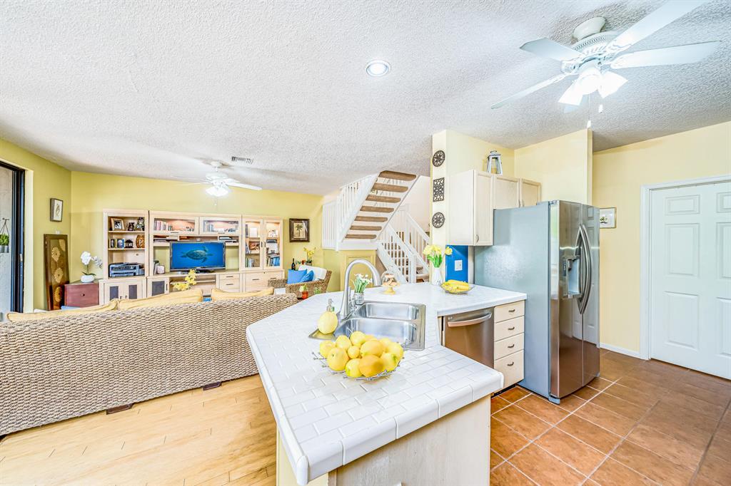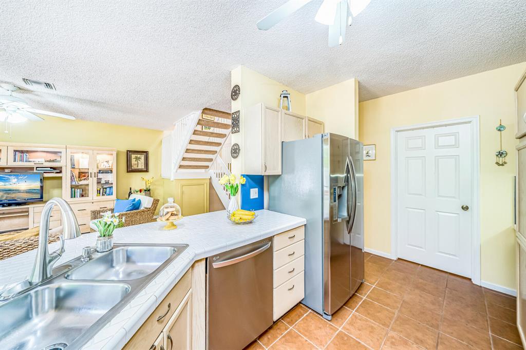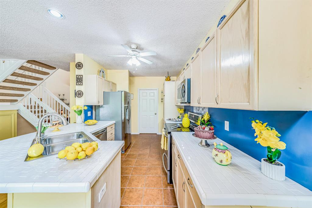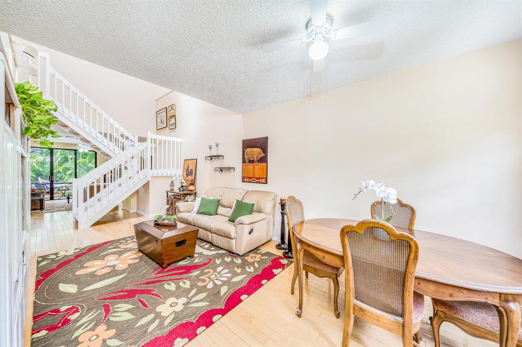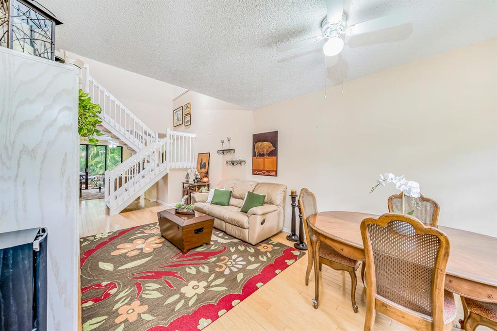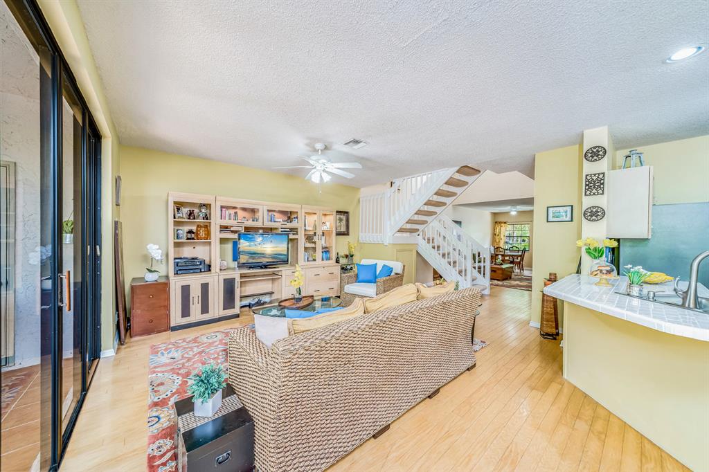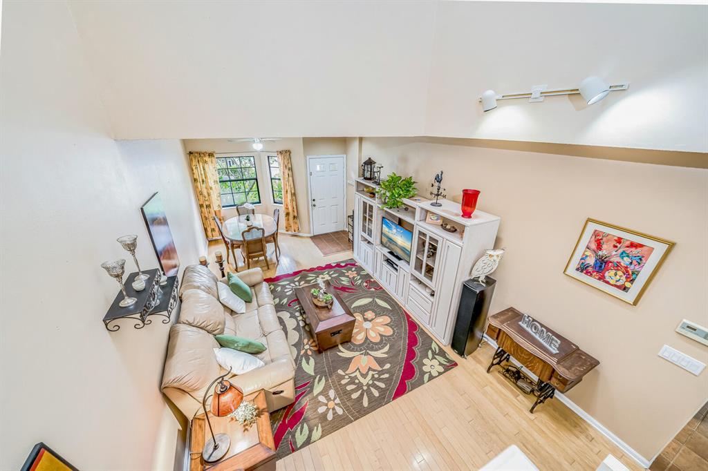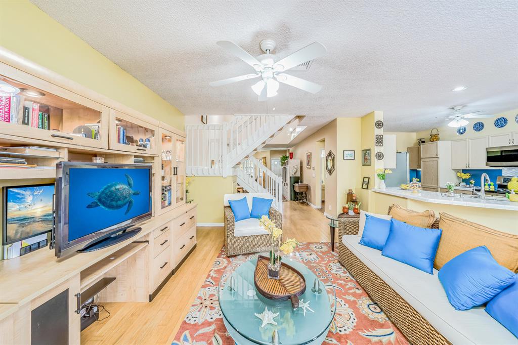 Renovated townhome w/3 bedrooms, 2.5 baths + 1 car garage + inside laundry room+ formal dining room & formal living room. Huge family room off of the kitchen. Dramatic entrance w/soaring cathedral ceilings & picturesque walls of windows/sliders/skylights that flood the inside with natural light and highlight the tropical private backyard. Enjoy the sense of openness, volume, & space throughout this home. Huge chef's kitchen featuring newer SS appliances/tons of wood cabinets, many with pull out drawers, tile counter tops with so much prep space, built in desk area, large pantry, sunny eat-in area plus over looks backyard and over looks the enormous family room! All 3 bedrooms are upstairs w/laminate wood flooring, and they are very spacious w/cathedral ceilings.