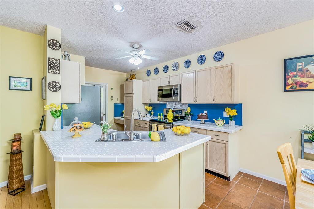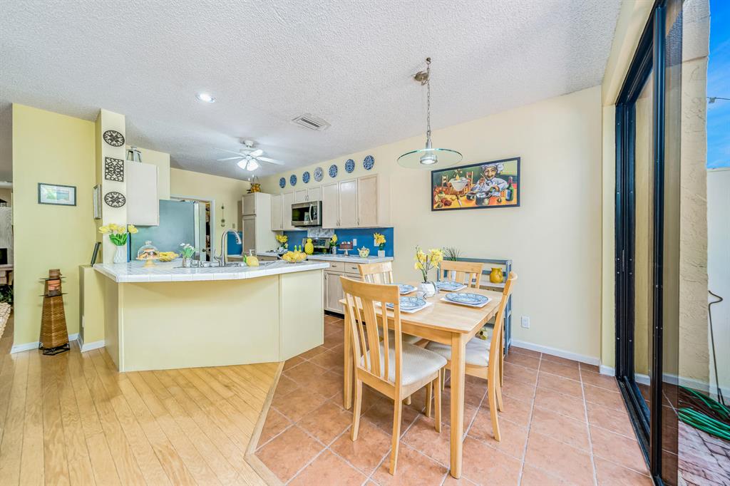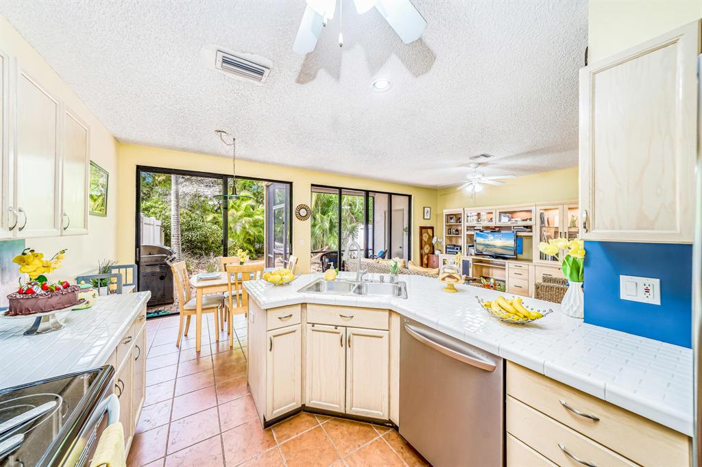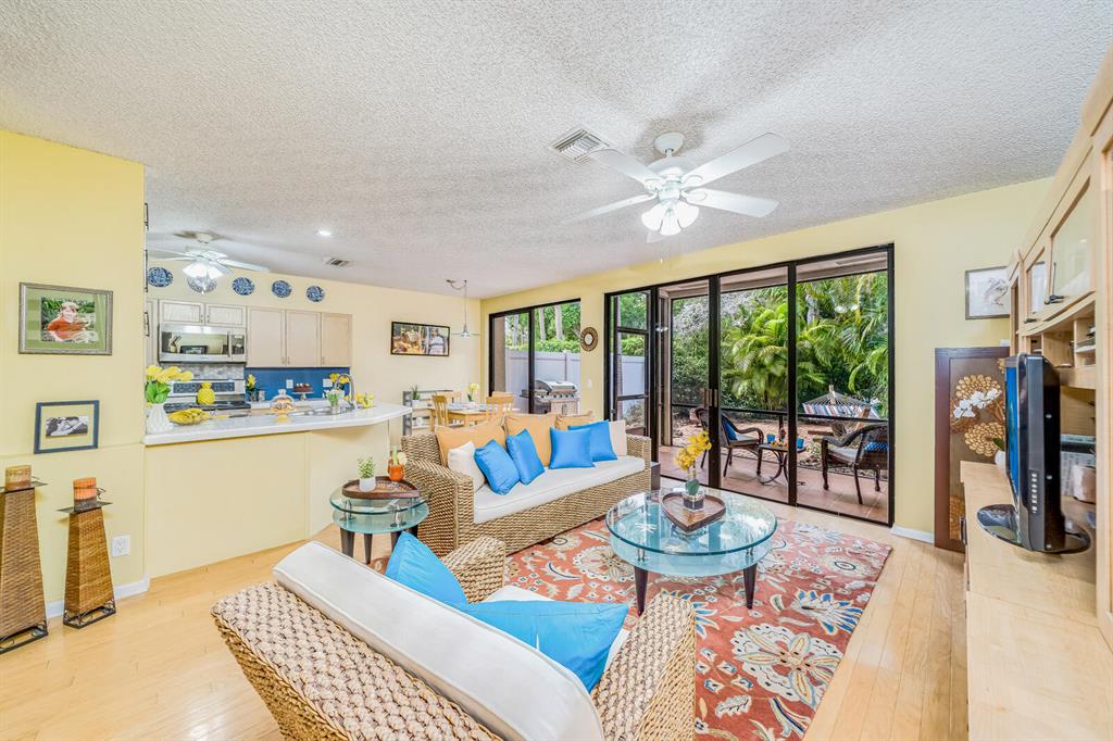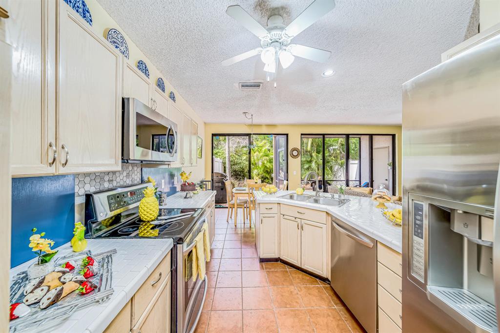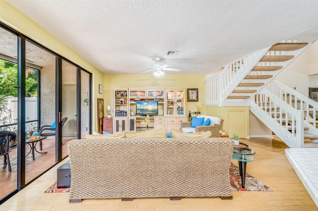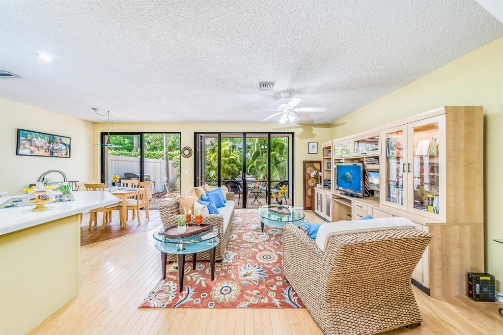 Renovated townhome w/3 bedrooms, 2.5 baths + 1 car garage + inside laundry room+ formal dining room & formal living room. Huge family room off of the kitchen. Dramatic entrance w/soaring cathedral ceilings & picturesque walls of windows/sliders/skylights that flood the inside with natural light and highlight the tropical private backyard. Enjoy the sense of openness, volume, & space throughout this home. Huge chef's kitchen featuring newer SS appliances/tons of wood cabinets, many with pull out drawers, tile counter tops with so much prep space, built in desk area, large pantry, sunny eat-in area plus over looks backyard and over looks the enormous family room! All 3 bedrooms are upstairs w/laminate wood flooring, and they are very spacious w/cathedral ceilings.