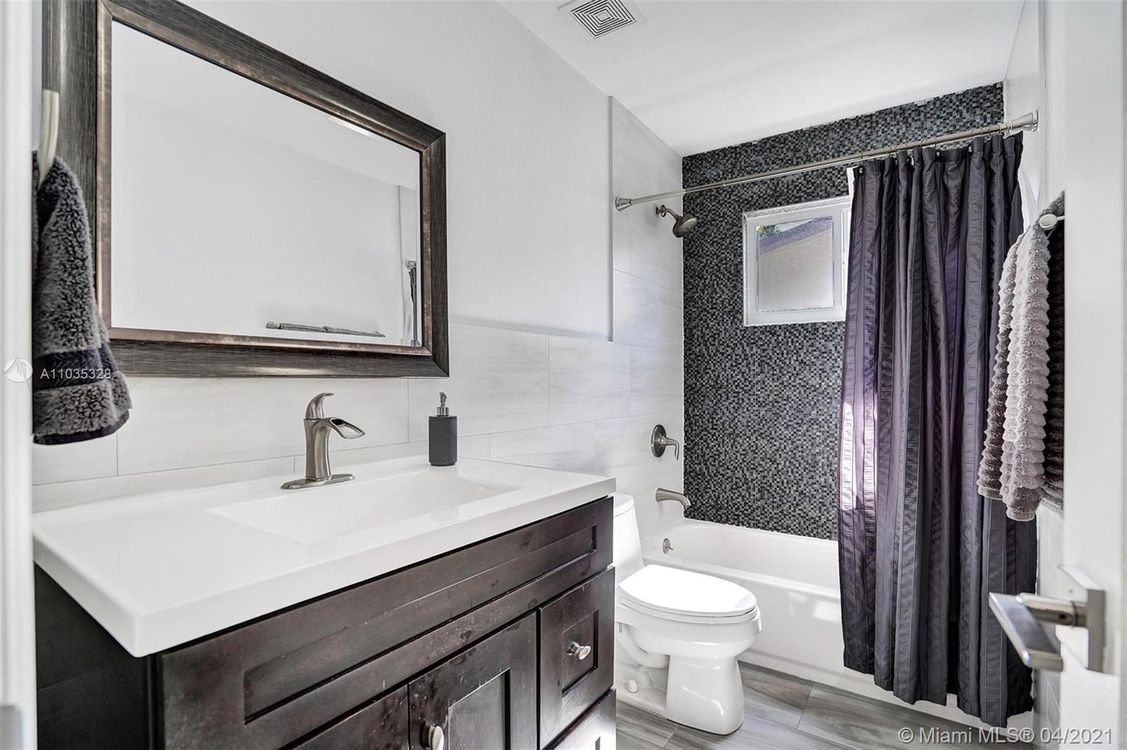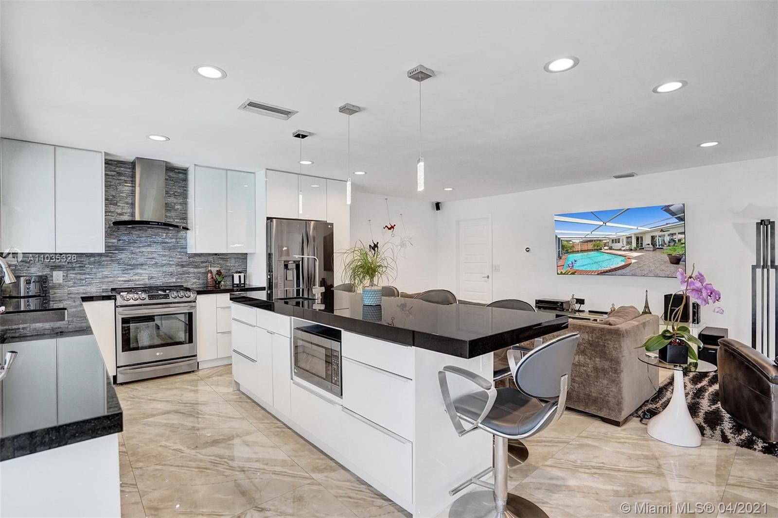 Completely remodeled 3 bedroom 2 bathroom lake-front home in quiet and pet-friendly neighborhood of Sunrise Golf Village in Sunrise. This house was tastefully updated in 2018: new PVC plumbing and electrical; gorgeous modern open kitchen with granite countertops, glass tile backsplash, stainless steel appliances; gas stove, gas dryer, tankless water heater; renovated bathrooms with triple rain shower in main bedroom; beautiful 32x32 porcelain tiles throughout. All impact windows and doors, including garage. This house is bright with lots of natural light. Relaxing views of the lake and the pool area from the kitchen, the dining room & the main bedroom. Fenced backyard with covered patio. 2-car garage. Great location close to Sawgrass Expressway, Sawgrass Mills Mall, restaurants & more.