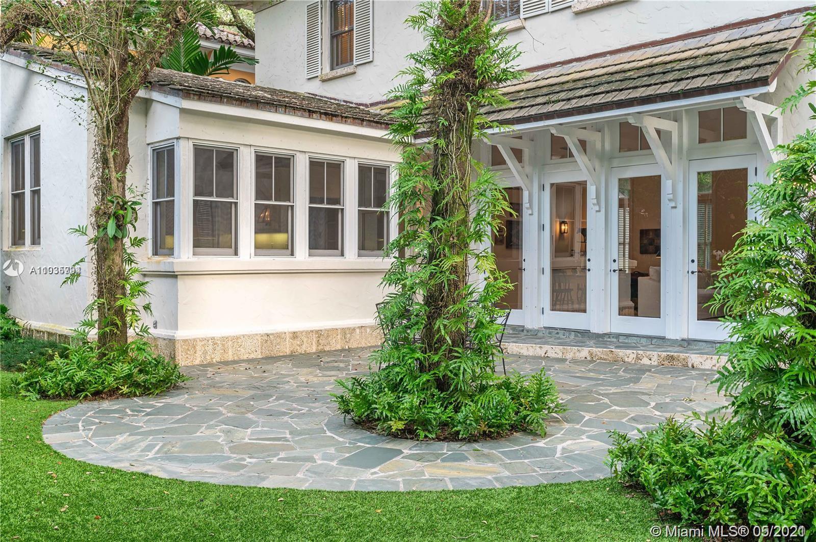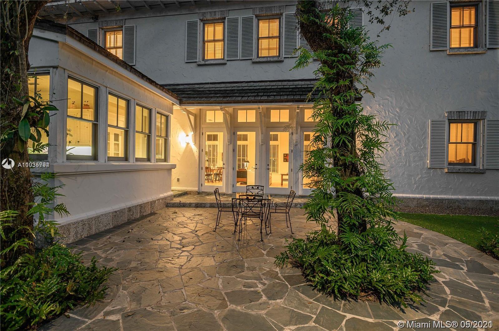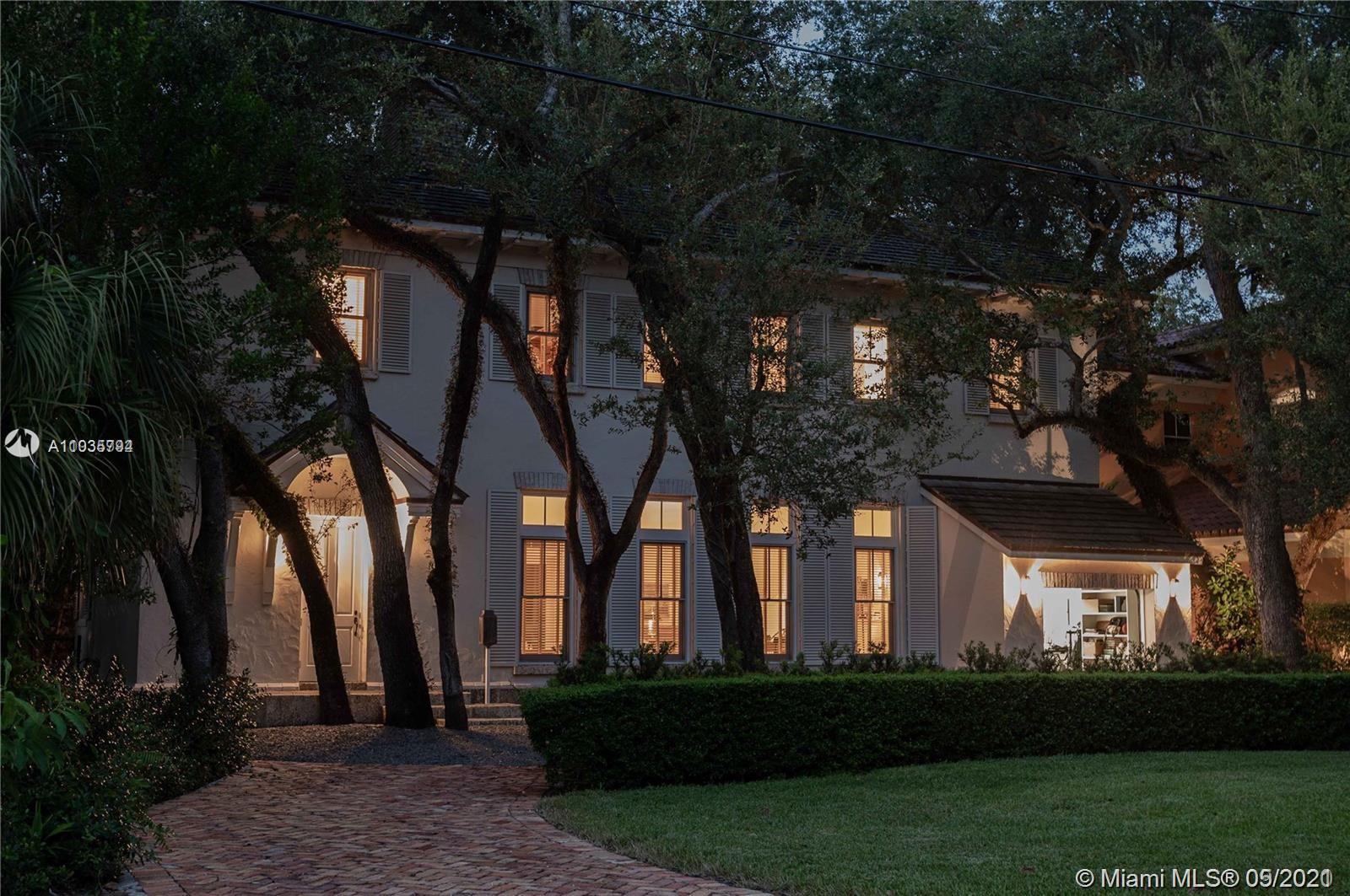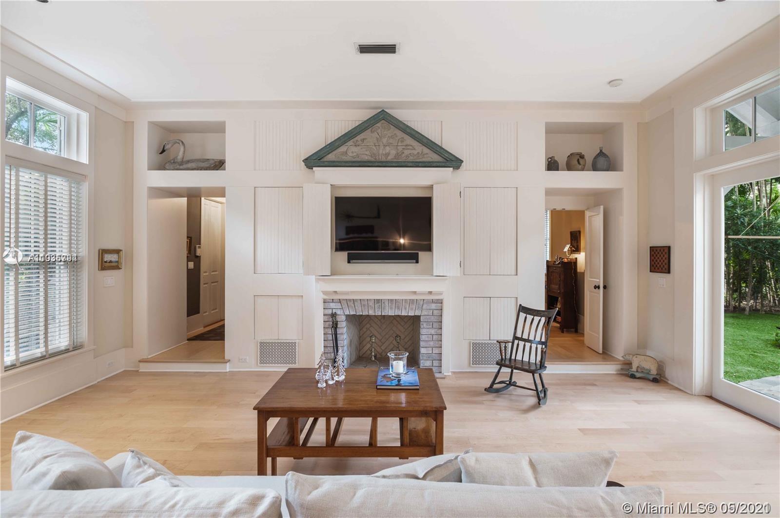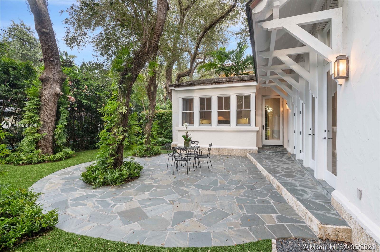 An architectural masterpiece adjacent to Coral Gables' "Pioneer Village". The open "Great" room invites you in w/ 13-foot ceilings in a bright cheerful space. A diagonal composition of the plan guides movement throughout the house. Interior details include two brick fireplaces, custom light-fixtures, mouldings, & maple-wood flooring throughout. Kitchen features cabinetry w/ hand-blown glass, soapstone counter-tops, & Viking/Sub-Zero appliances. 3-BR on the second level feature en-suite bathrooms w/ Waterworks fixtures & tilework. Downstairs room may serve as an office/study or guest room. The interiors communicate freely w/ the enchanting outdoor space. A series of french doors open out to a slate patio & turfed garden. Located steps away from the prestigious Riviera Country Club.