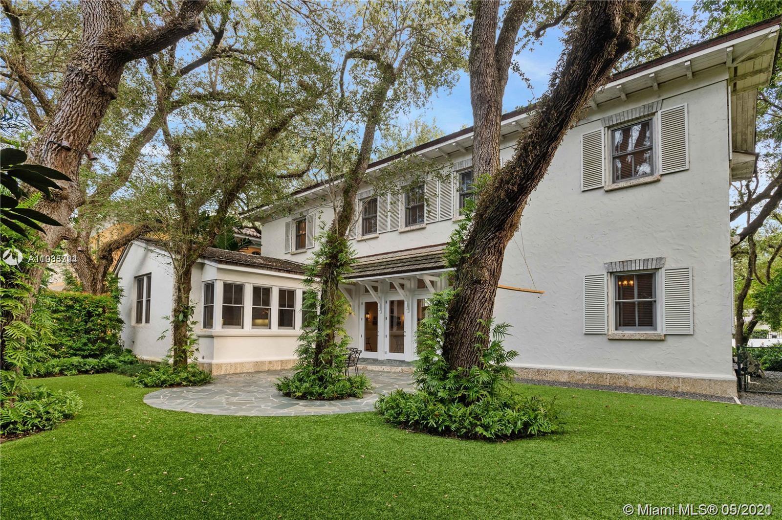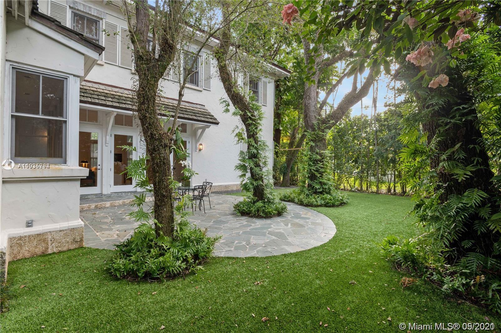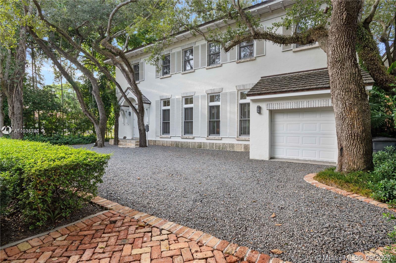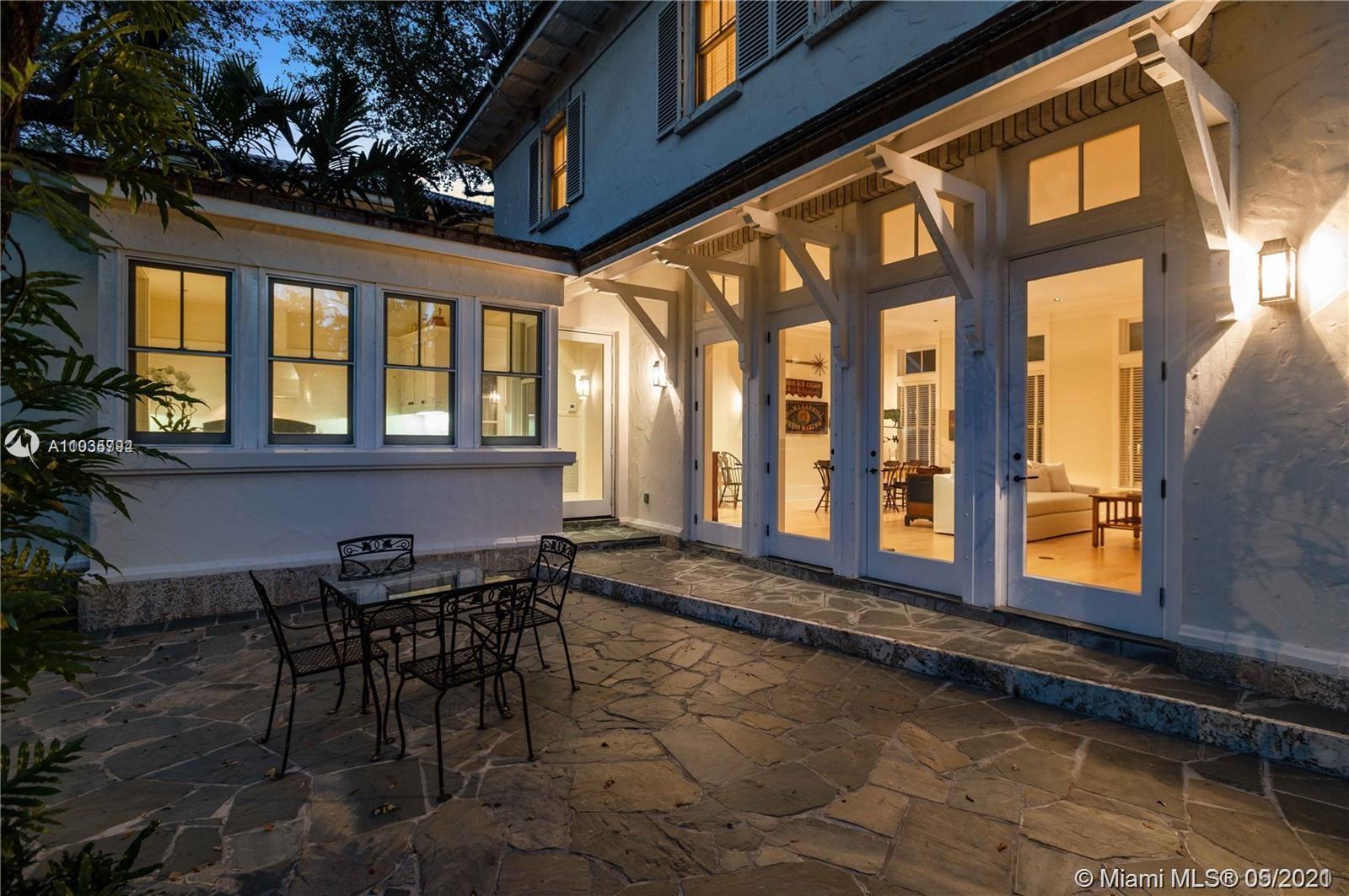 An architectural masterpiece adjacent to Coral Gables' "Pioneer Village". The open "Great" room invites you in w/ 13-foot ceilings in a bright cheerful space. A diagonal composition of the plan guides movement throughout the house. Interior details include two brick fireplaces, custom light-fixtures, mouldings, & maple-wood flooring throughout. Kitchen features cabinetry w/ hand-blown glass, soapstone counter-tops, & Viking/Sub-Zero appliances. 3-BR on the second level feature en-suite bathrooms w/ Waterworks fixtures & tilework. Downstairs room may serve as an office/study or guest room. The interiors communicate freely w/ the enchanting outdoor space. A series of french doors open out to a slate patio & turfed garden. Located steps away from the prestigious Riviera Country Club.