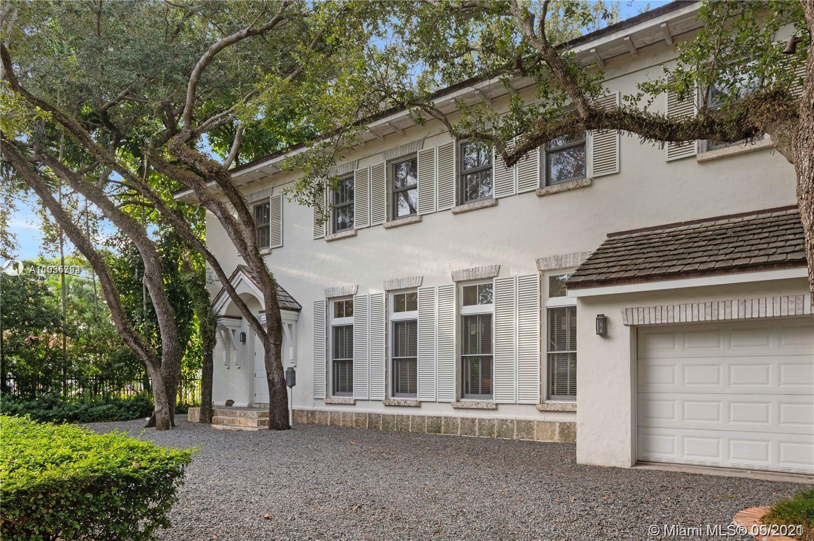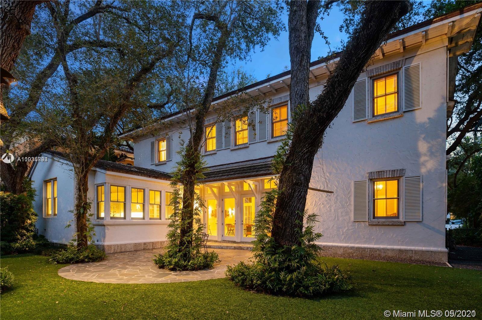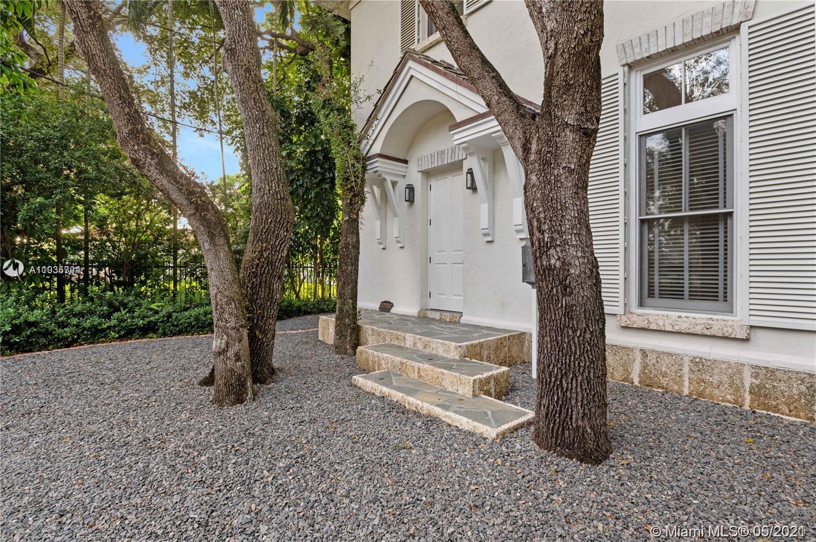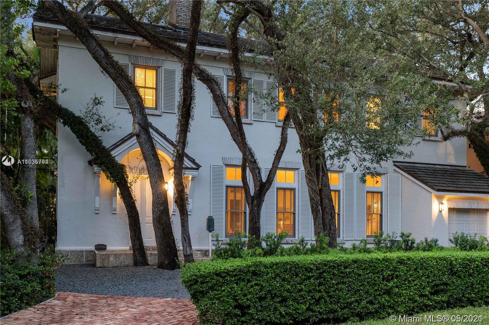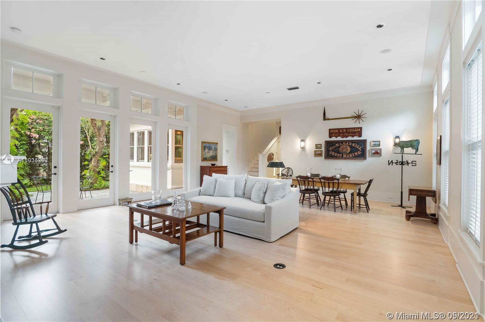 An architectural masterpiece adjacent to Coral Gables' "Pioneer Village". The open "Great" room invites you in w/ 13-foot ceilings in a bright cheerful space. A diagonal composition of the plan guides movement throughout the house. Interior details include two brick fireplaces, custom light-fixtures, mouldings, & maple-wood flooring throughout. Kitchen features cabinetry w/ hand-blown glass, soapstone counter-tops, & Viking/Sub-Zero appliances. 3-BR on the second level feature en-suite bathrooms w/ Waterworks fixtures & tilework. Downstairs room may serve as an office/study or guest room. The interiors communicate freely w/ the enchanting outdoor space. A series of french doors open out to a slate patio & turfed garden. Located steps away from the prestigious Riviera Country Club.