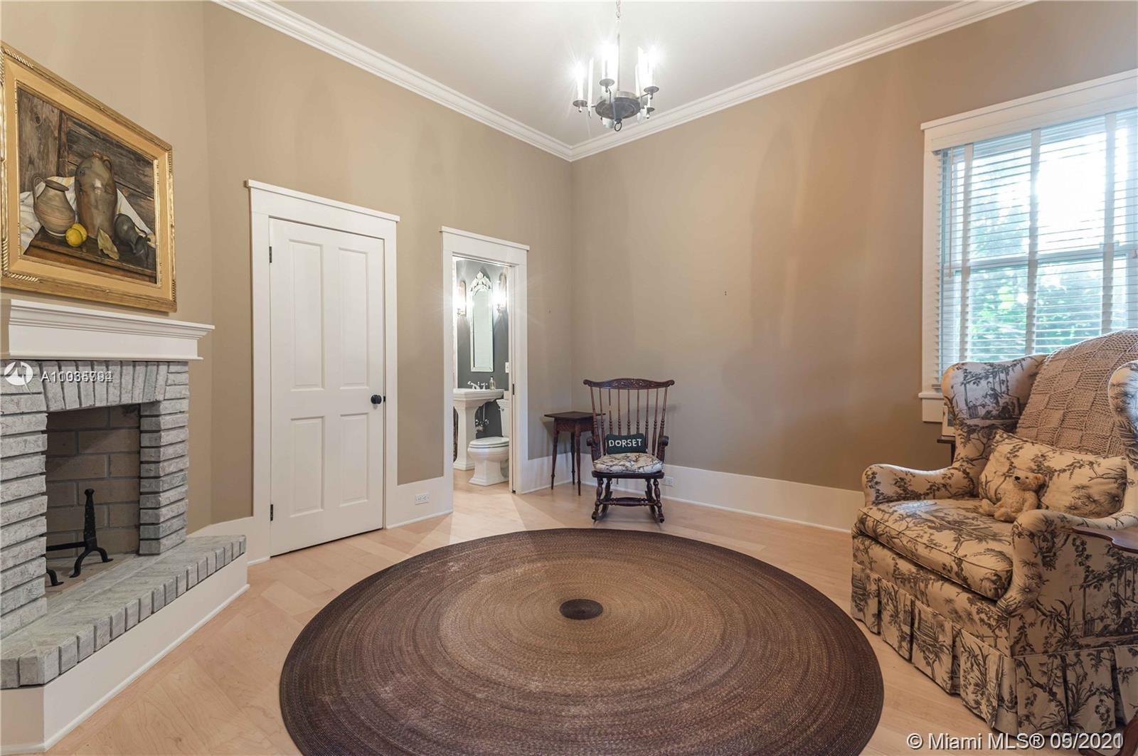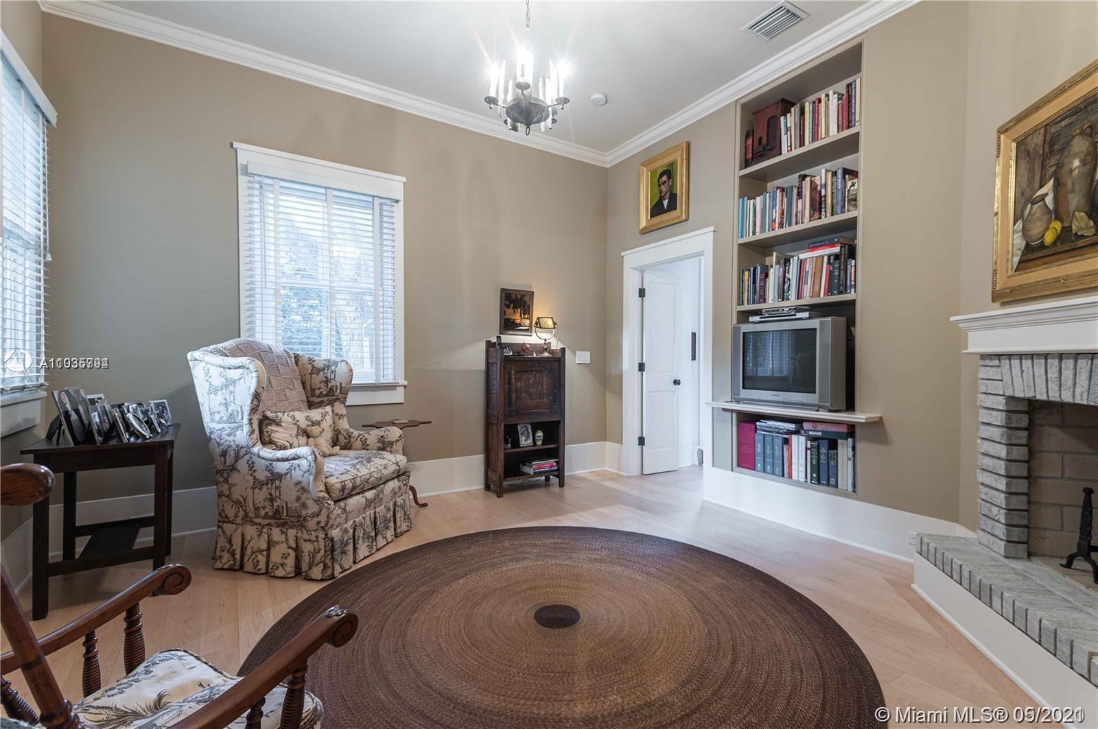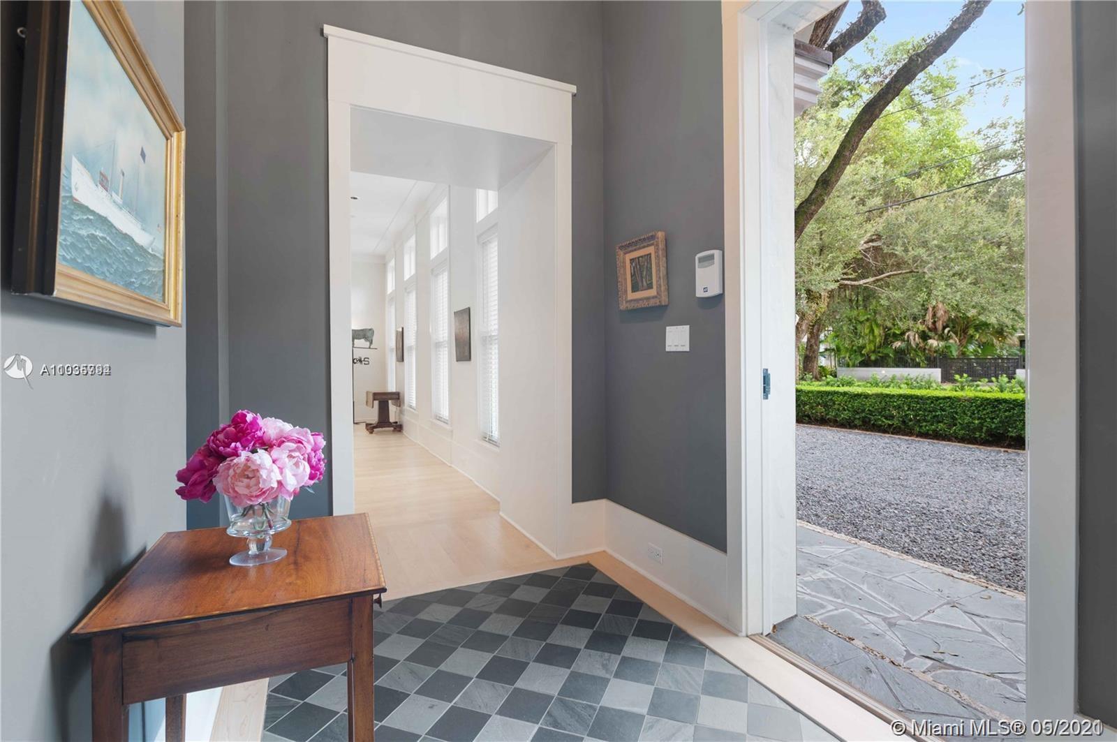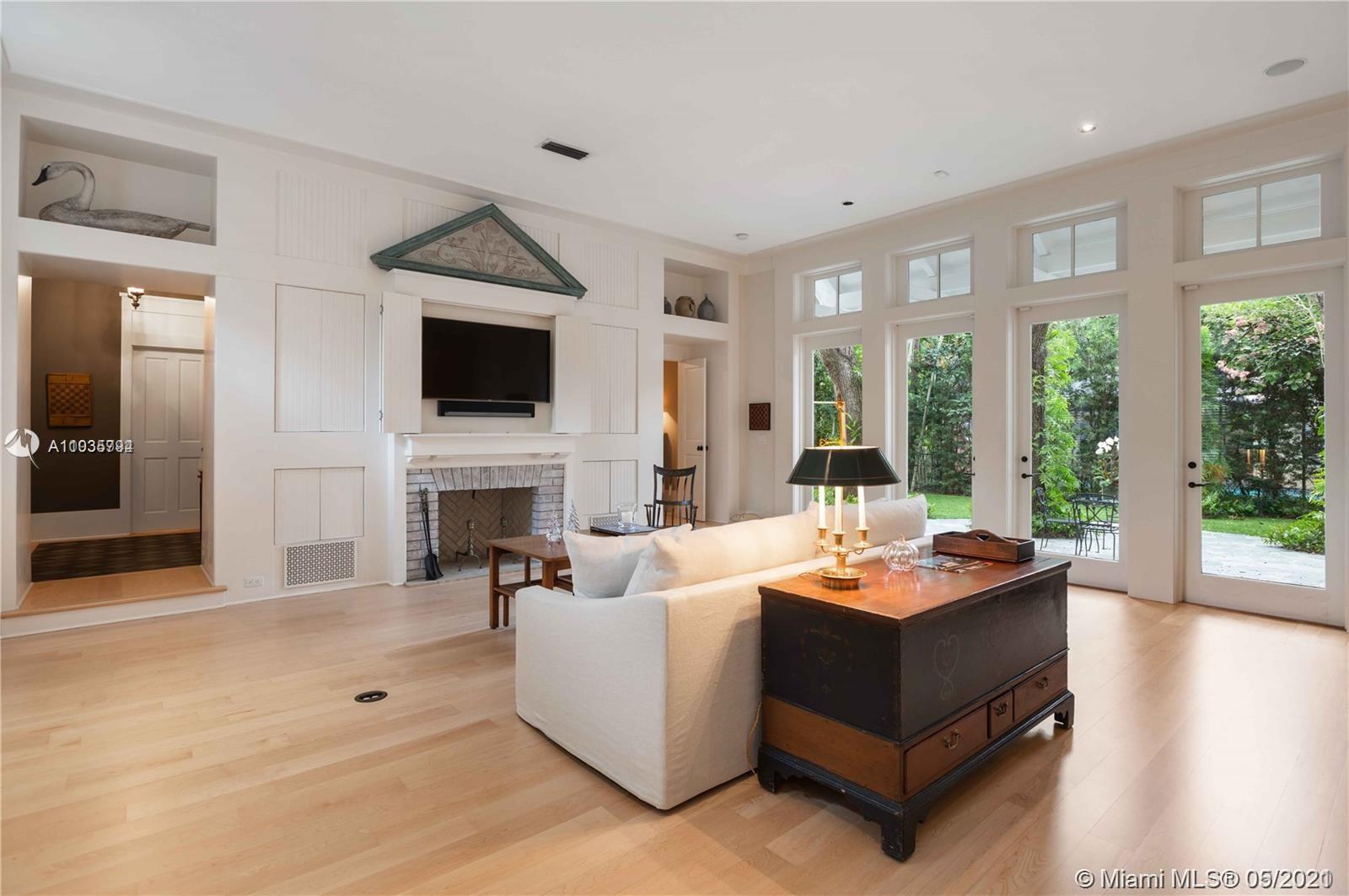 An architectural masterpiece adjacent to Coral Gables' "Pioneer Village". The open "Great" room invites you in w/ 13-foot ceilings in a bright cheerful space. A diagonal composition of the plan guides movement throughout the house. Interior details include two brick fireplaces, custom light-fixtures, mouldings, & maple-wood flooring throughout. Kitchen features cabinetry w/ hand-blown glass, soapstone counter-tops, & Viking/Sub-Zero appliances. 3-BR on the second level feature en-suite bathrooms w/ Waterworks fixtures & tilework. Downstairs room may serve as an office/study or guest room. The interiors communicate freely w/ the enchanting outdoor space. A series of french doors open out to a slate patio & turfed garden. Located steps away from the prestigious Riviera Country Club.