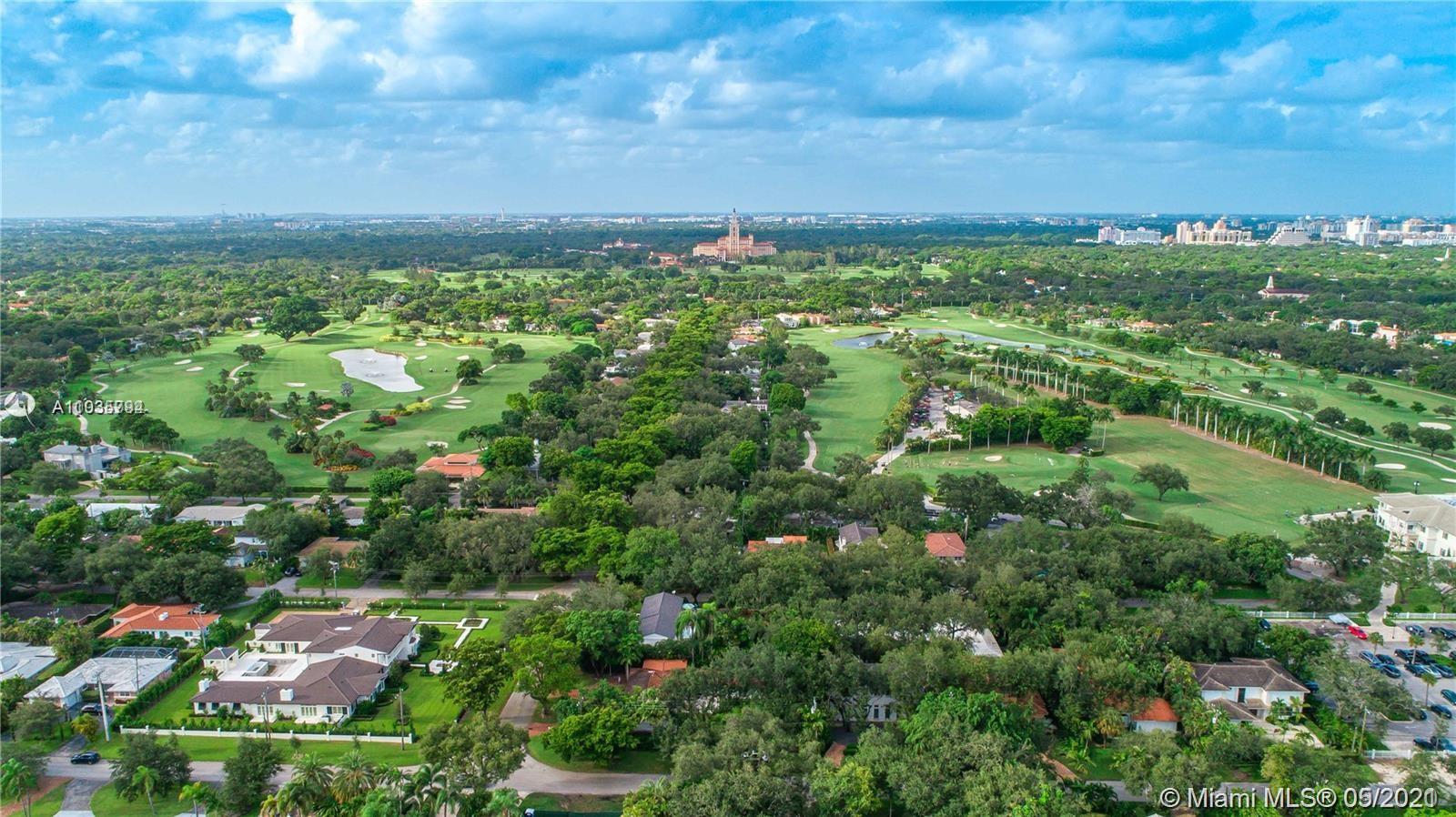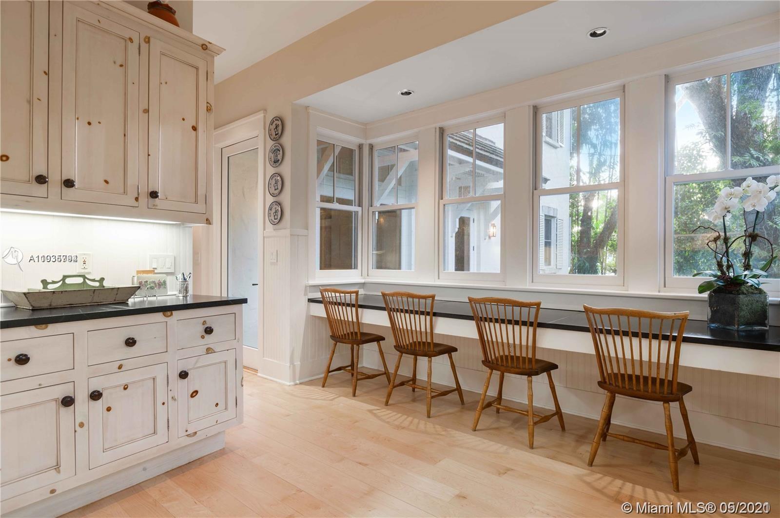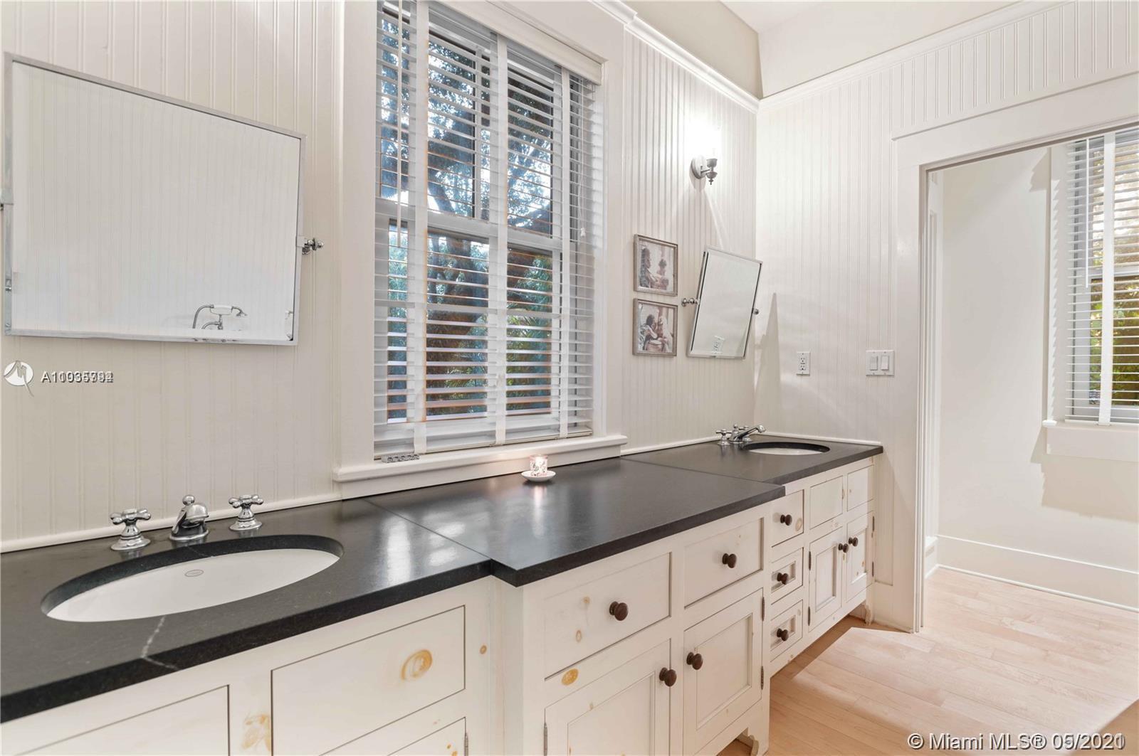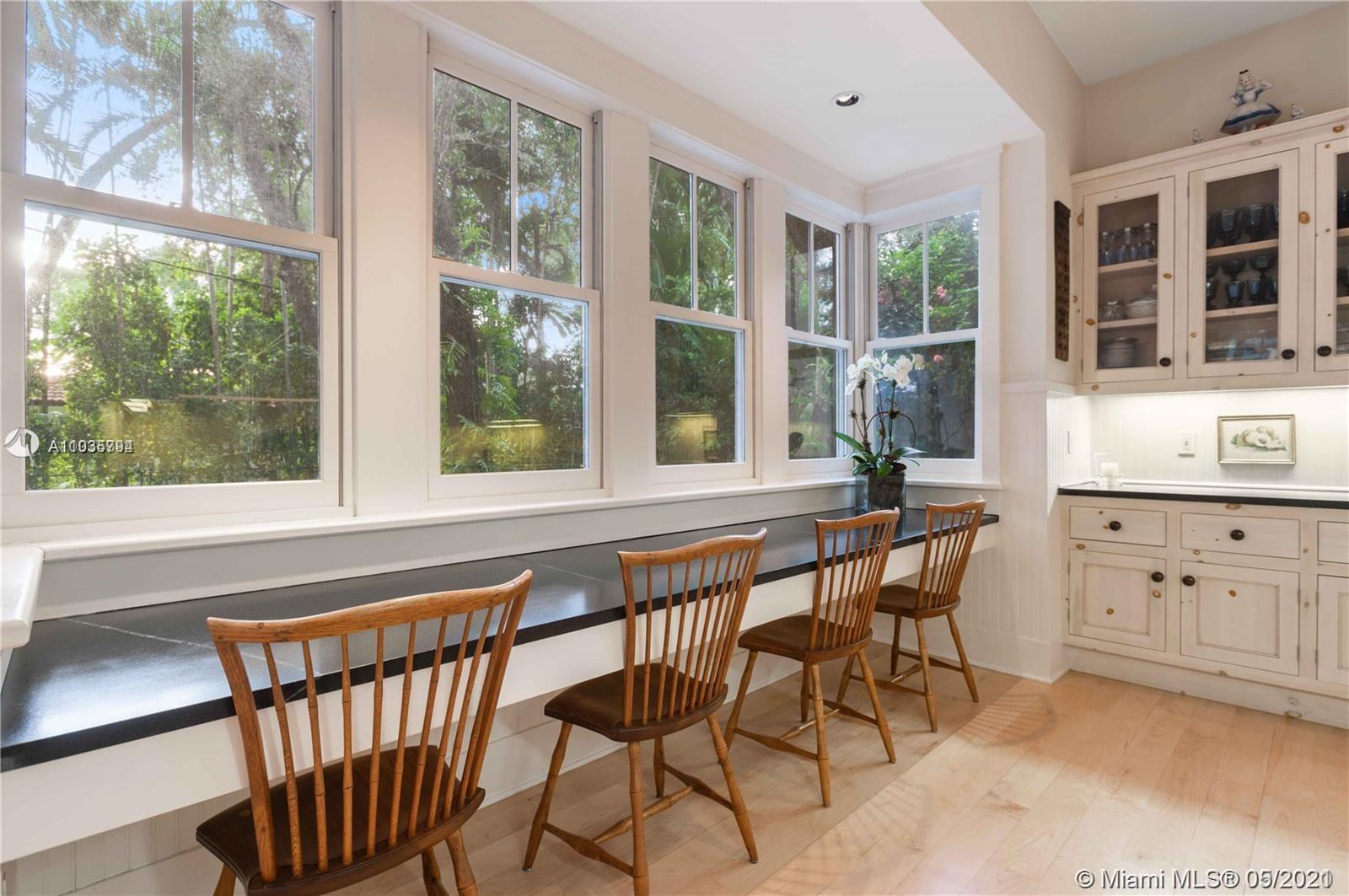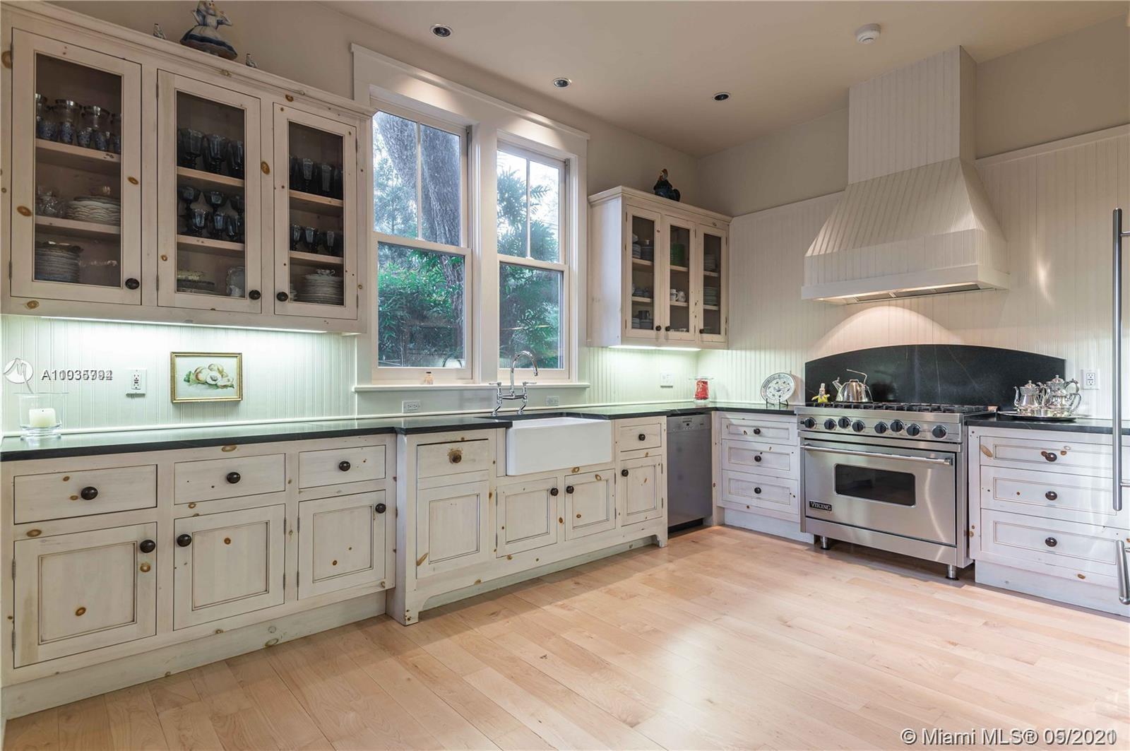 An architectural masterpiece adjacent to Coral Gables' "Pioneer Village". The open "Great" room invites you in w/ 13-foot ceilings in a bright cheerful space. A diagonal composition of the plan guides movement throughout the house. Interior details include two brick fireplaces, custom light-fixtures, mouldings, & maple-wood flooring throughout. Kitchen features cabinetry w/ hand-blown glass, soapstone counter-tops, & Viking/Sub-Zero appliances. 3-BR on the second level feature en-suite bathrooms w/ Waterworks fixtures & tilework. Downstairs room may serve as an office/study or guest room. The interiors communicate freely w/ the enchanting outdoor space. A series of french doors open out to a slate patio & turfed garden. Located steps away from the prestigious Riviera Country Club.