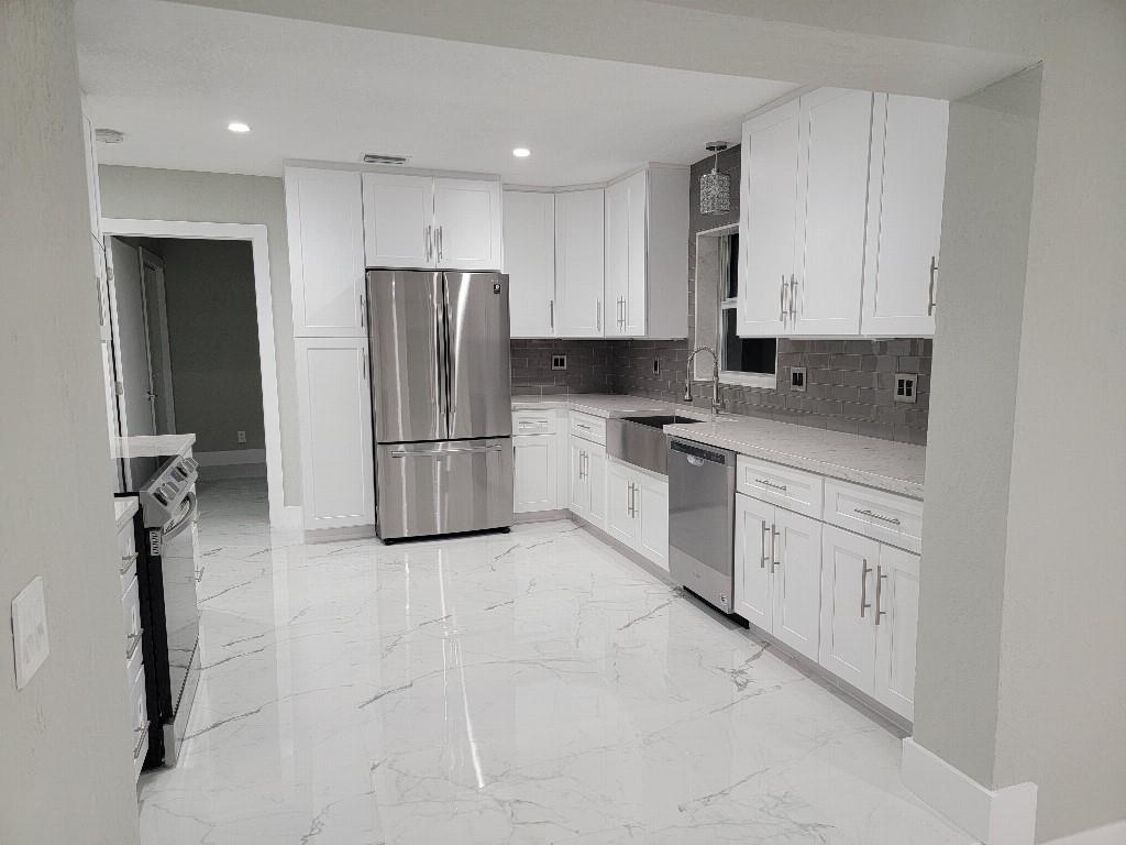 Completely renovated from the studs and all-permitted. Everything is brand new including: high-impact hurricane windows and doors, electrical, plumbing, high-efficiency 4 ton air-conditioner, sleek white Shaker kitchen cabinets with white quartz countertops and gorgeous glass backsplash open to oversized family room, high-end five-piece stainless-steel kitchen appliance suite including vent hood, vaulted-ceiling master bedroom suite with walk-in closet and luxurious master bath with double vanities and large glass-enclosed shower, guest bath with floor-to-ceiling white tumbled marble subway tile, 24x48 white polished porcelain floor tile in all rooms, recessed lighting throughout and so much more!
