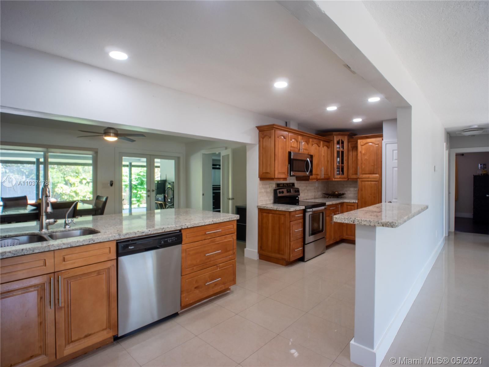 Spacious 4/3 home in beautiful Palm Springs North. Completely remodeled, new kitchen has granite counter tops with stainless steel appliances, new bathrooms, floors, baseboards, recessed lighting, impact windows, roof 5 years old & paver driveway done just 2 years ago. Currently being used as 3/2 with a 1/1. The main house is a 3/2 has a spacious master bedroom w/ large walk in closet, family room, laundry room, huge yard, covered patio with an outside bar and cooking area along with a gated driveway on east side of house. The 1/1 has it's own entrance & small patio. This room can be accessed from the main house if desired. Ideal for a family with Grandparents. Security Camera System included. Home is move in ready. Owner has meet all Miami Dade County requirements.