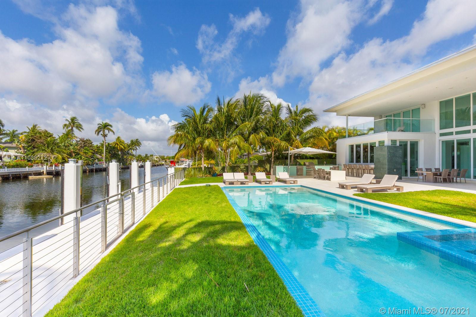 Contemporary waterfront estate in Golden Isles, one of South Florida’s most sought-after waterfront communities. Large lot (90’ x 150’), southern exposure, quiet cul-de-sac street, deep water, ocean access & no fixed bridges. Deeded Dock for large vessel. 5BR/6BA, including a large master suite with private terrace, ideal for relaxation and entertaining. Bright and spacious living area allows for an enviable indoor-outdoor lifestyle, walls of glass lead to the lush backyard, pool area and summer kitchen. The home is superbly equipped with a gourmet kitchen, bar and open dining area. Nearby restaurants, shops, beach and more, a must see.
