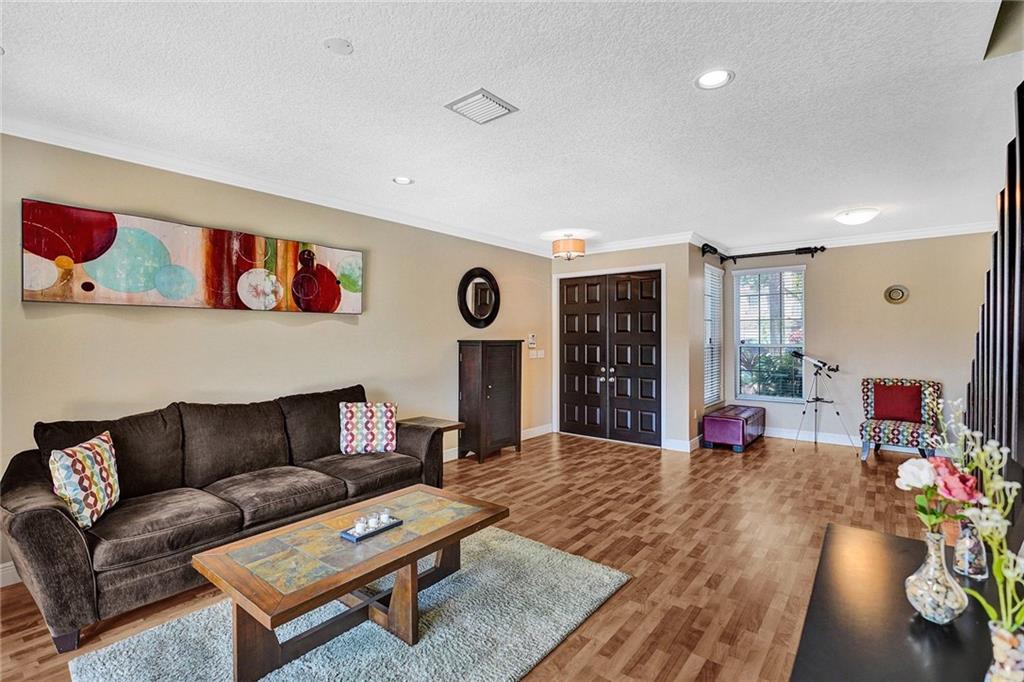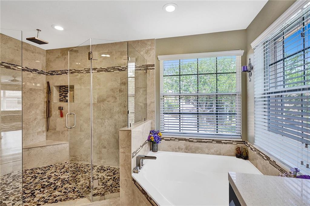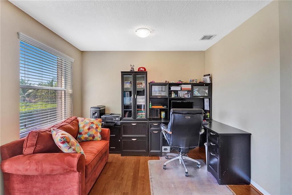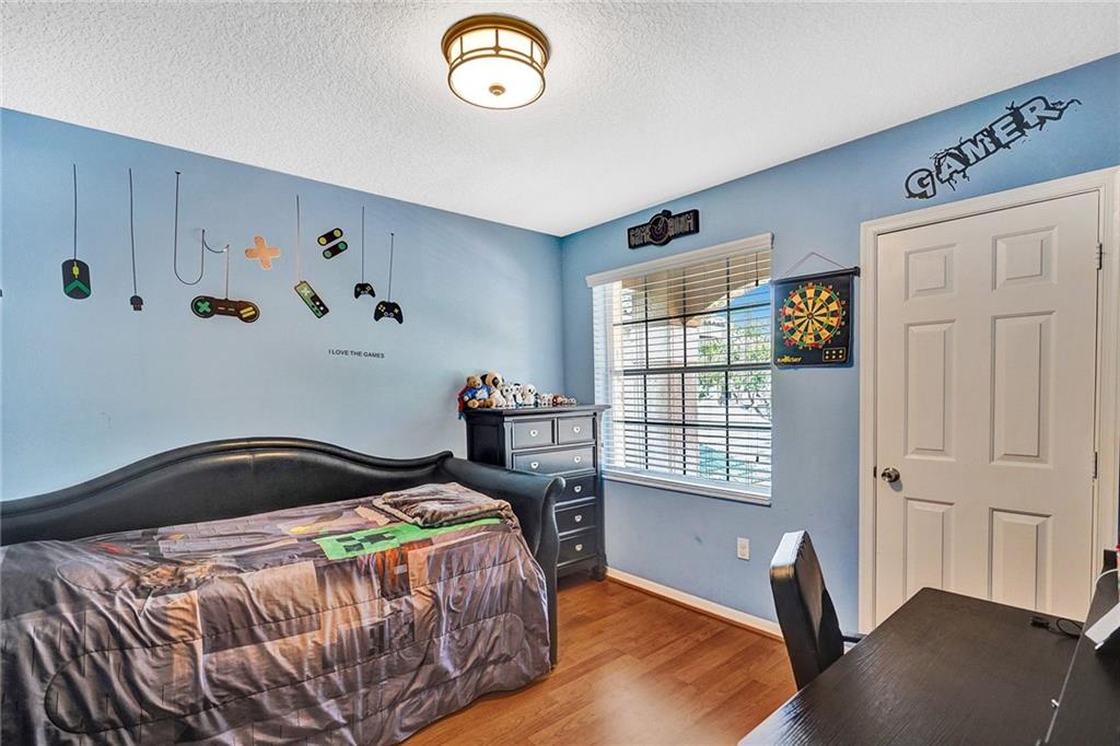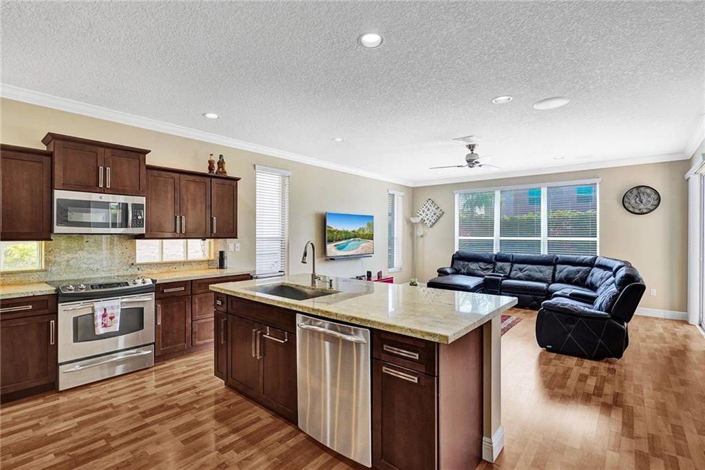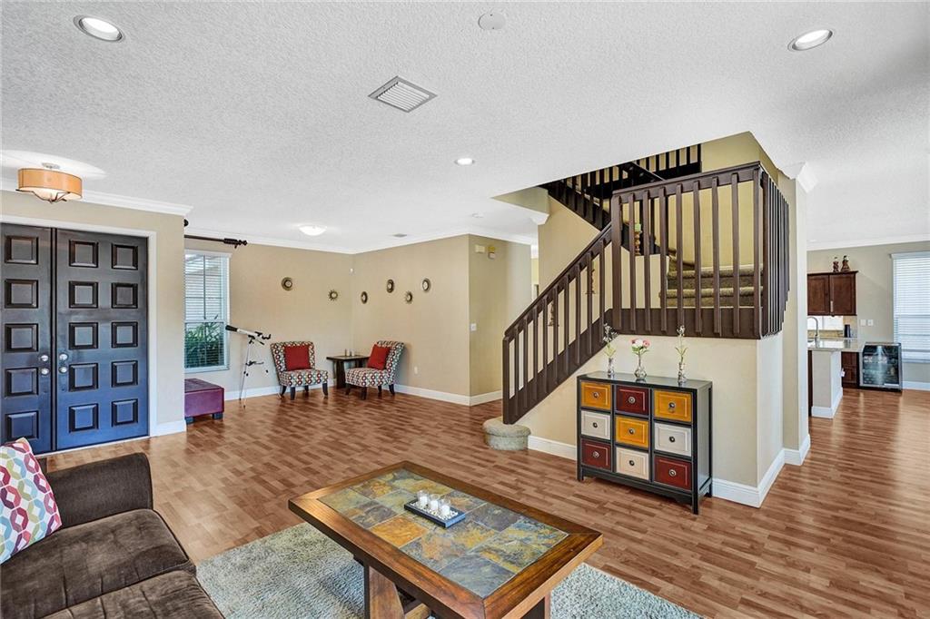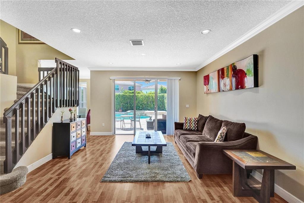 Gorgeous 5BD/3BA 3 car garage pool home w/top of the line finishes everywhere! Entertain in style in your gourmet granite/wood kitchen w/stainless appls, under-cabinet lighting, an oversized-island for additional seating, a dedicated eat-in area, overlooking the XL family rm w/built-in ceiling speakers. Big windows w/tons of natural light accentuating the warm wood floors downstairs & upscale crown moulding! Indulge your inner zen w/your backyard resort-like pool/spa views, sip a cocktail under the covered lanai surrounded by privacy hedging. BEST FLOORPLAN: 1BD/1BA down, 4BD's/2BA's Up! Huge Master Suite w/large sitting area, stunning master-bath w/rain shower,roman tub, quartz counters! Customs closets, new AC's, accordion shutters throughout! Gated w/pool, tennis, playgrnd, top schools!