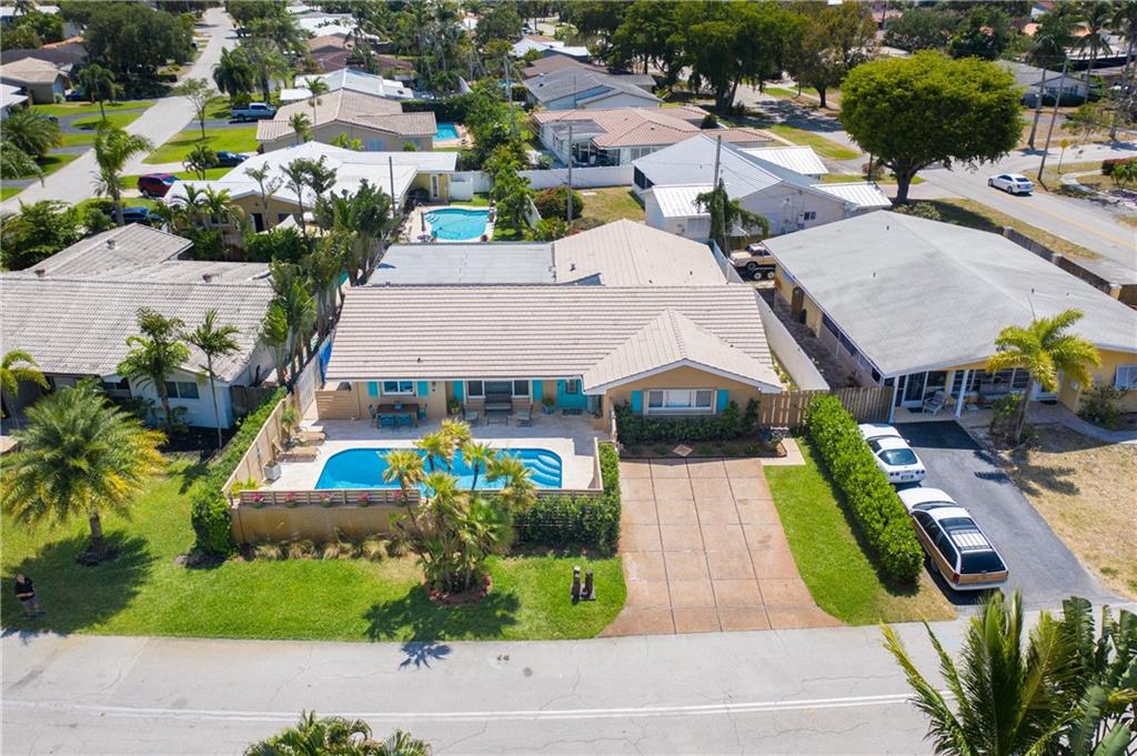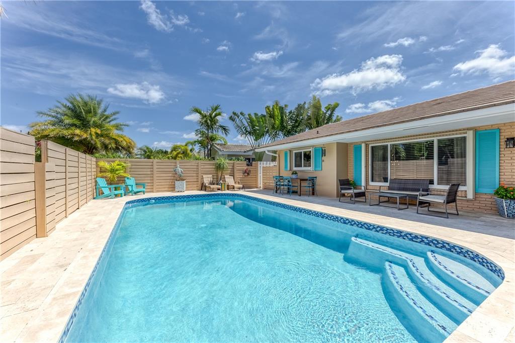 Large Open Contemporary Home in Coral Ridge Isles! Generous 4 bedrooms, 3 bath on a larger lot at 7,538sf. The newly resurfaced solar heated pool with attractive Travertine pavers greets you as you enter your gated compound. Truly open concept living, the kitchen is perfectly situated for entertaining - marble backsplash, quartz counter tops, all stainless steel appliances, cook island & wine cooler. Ceramic plank flooring throughout the house, new central AC system in 2019 with added AC mini split in the 2nd living area. House protected with mostly all impact windows & doors, easy accordion shutters for the back office corner. Two Bedrooms have en suite bathrooms, the other 2 bedrooms share a hall bathroom. Large indoor laundry room too. Welcome home to your private resort!
