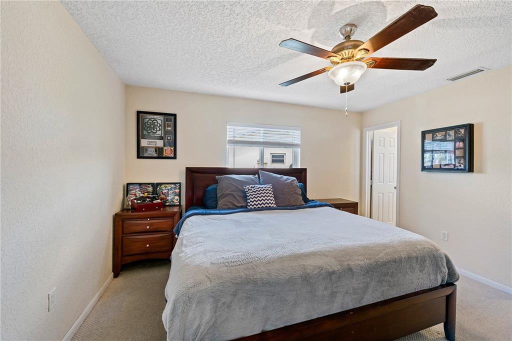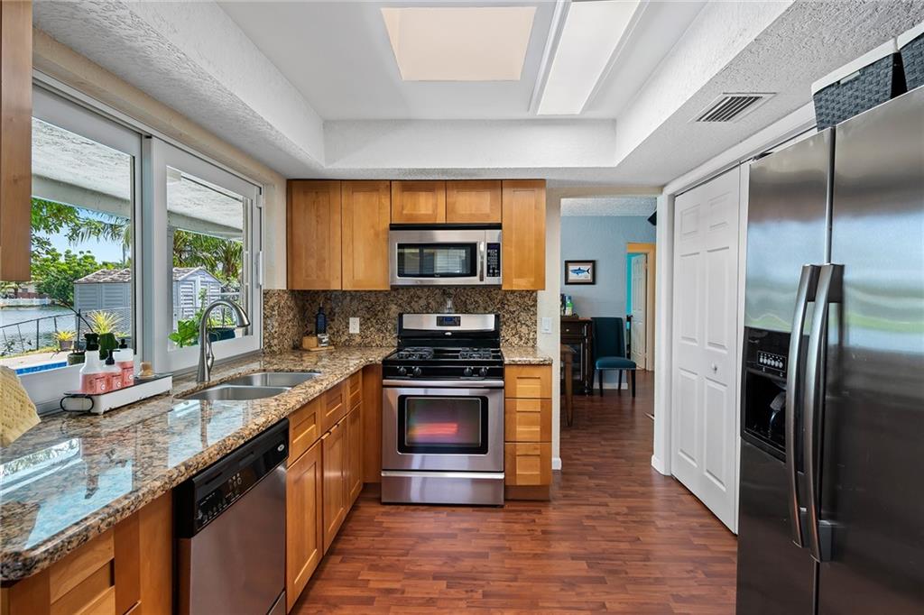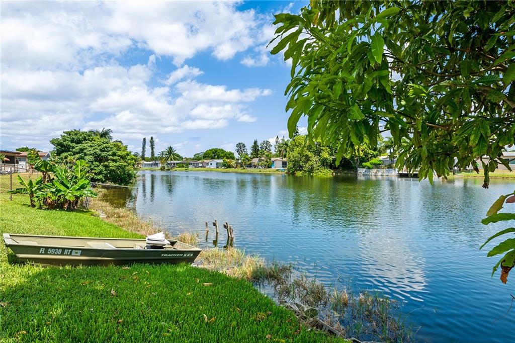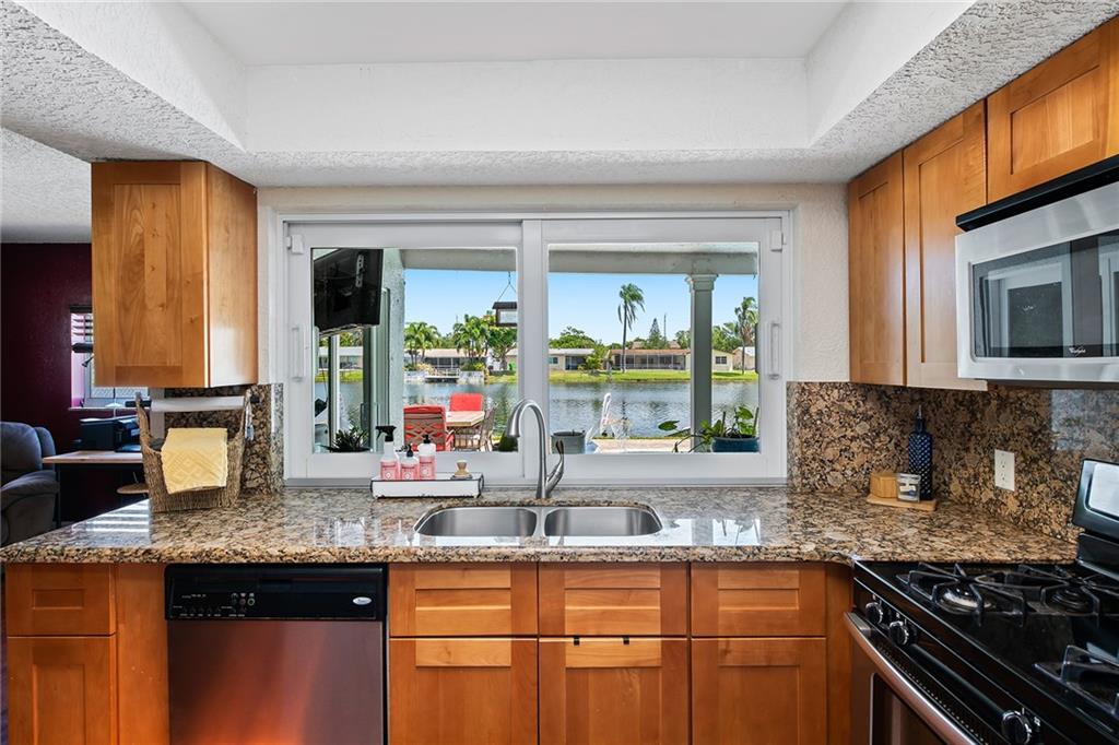 This lovely waterfront home is located in the desirable Sunrise Golf Village community. This three-bedroom, two-bathroom home boasts full impact windows and doors, one car garage, brand new water heater and split bedroom floor plan. Kitchen features a gas stove, wood cabinets with granite counter tops, stainless steel appliances and opens to a bonus space for a play room/den/office. The outdoor space includes a fenced yard with fruit trees and garden beds, updated pool and patio area with brick pavers, and a covered area perfect for entertaining family and friends. Don't miss this move-in ready home with no HOA!