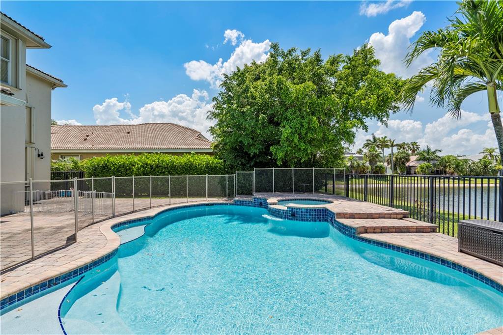 Beautifully renovated Dubonnet model in this upscale gated community of Saturnia in Boca Raton. This 5 bedroom home features 4 bedrooms upstairs plus loft area / 2 baths & 1 bedroom down with a full bathroom. There are beautiful built - ins upstairs in the loft- perfect for a home office. Playroom downstairs also has custom built-ins. Recently redone flooring in 3 bedrooms upstairs- Crown moldings- New water heater - New A/C- Upgraded landscaping- Designer floor to ceiling window treatments- Garage is finished with custom cabinetry & epoxy floors. Salt water & heated pool sits on a serene water view. Baby pool fence- Windows and doors protected by accordion hurricane shutters. Community amenities include a clubhouse, heated pool, tennis, tot lot & fitness center.