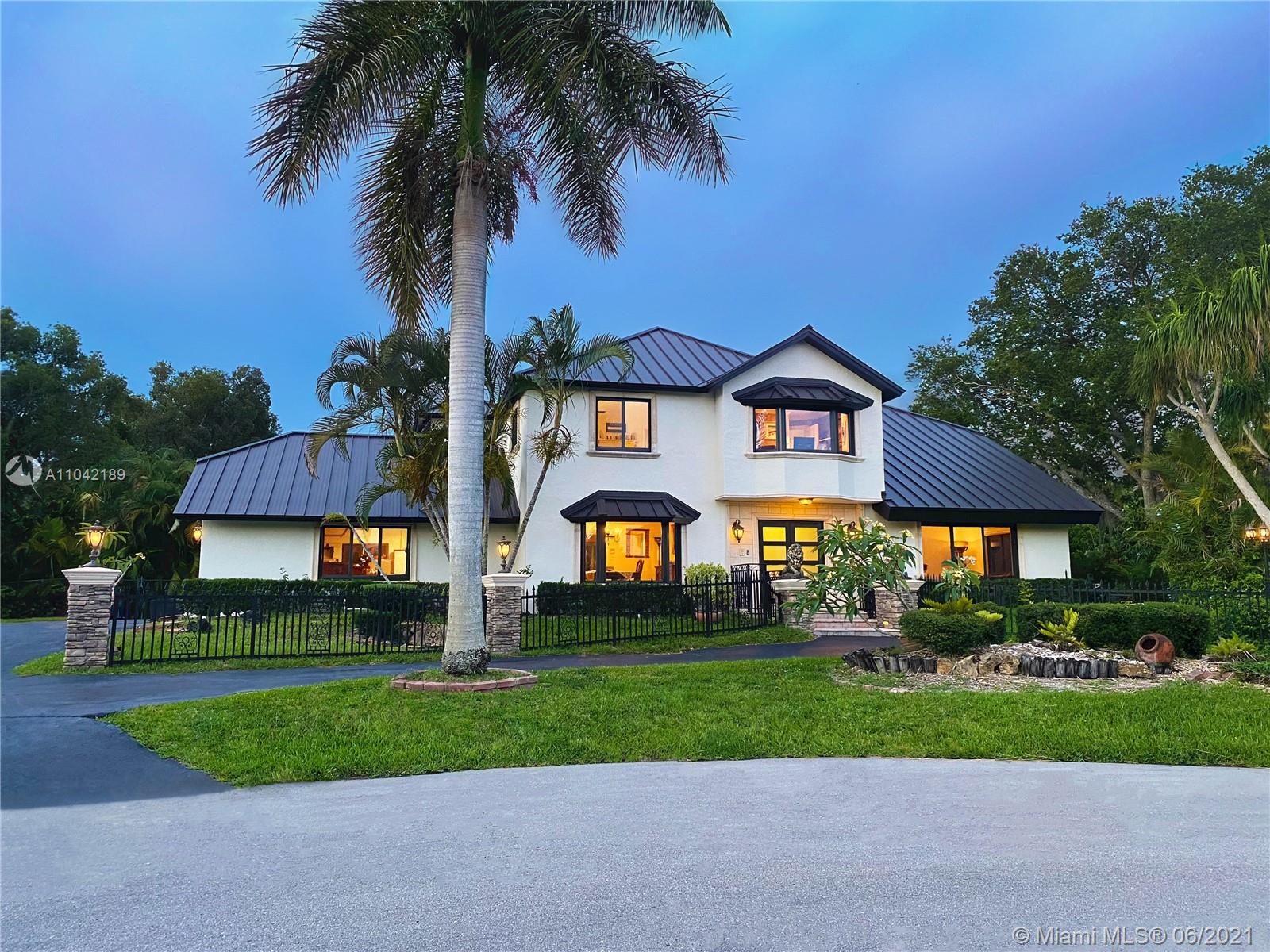 Stunning 4 Bed/3 Bath High Elevated property, situated on 1 ACRE lot on a cul-de-sac, in Plantation Acres. New Steel Roof, Impact Doors & Windows. Complete fenced property featuring Decorative Aluminium Fence w/ Illuminated Pillars. Chef’s Kitchen w/quartz counter, Thermador Ref & Gas Stove, Build-in Miele Coffee Maker, 2 Temp Wine Ref, Garbage Compactor, LG W & D. Marble Cabana Bath on 1st floor. 30 feet ceiling in Living Area, Family Rm w/ Fireplace. 6 Water Salt Water Spa, Pergola w/ draping bougainvilleas, Pool totally redone w/Salt Water System, Diamond Bright Deep Ocean Blue backyard with Stadium light, Avocado & Mango Trees. Circular stainless steel stairs lead to spacious balcony w/access to Master Bedroom and 2nd largest Bedroom w/ brazilian cherry wood floors.
