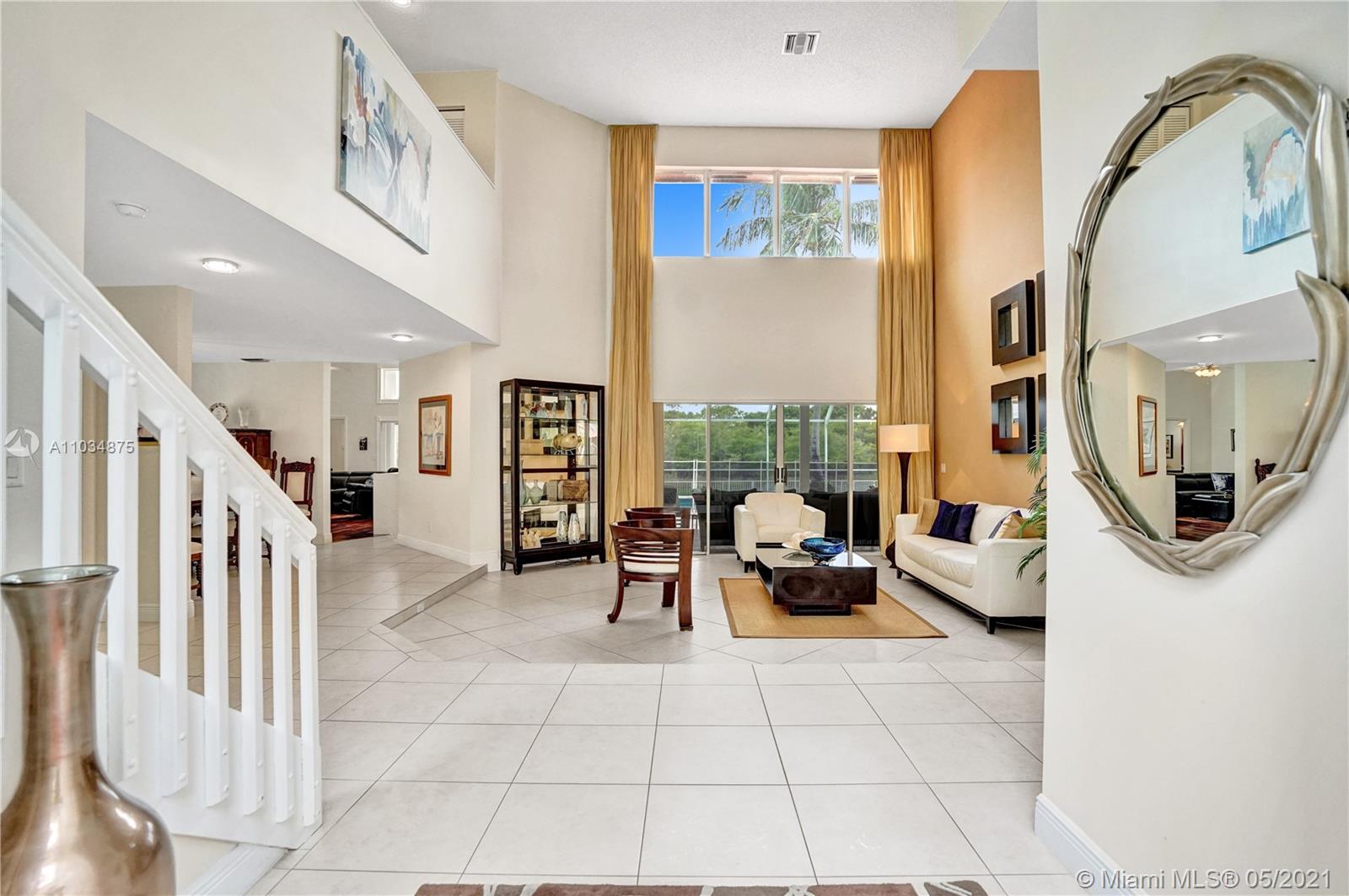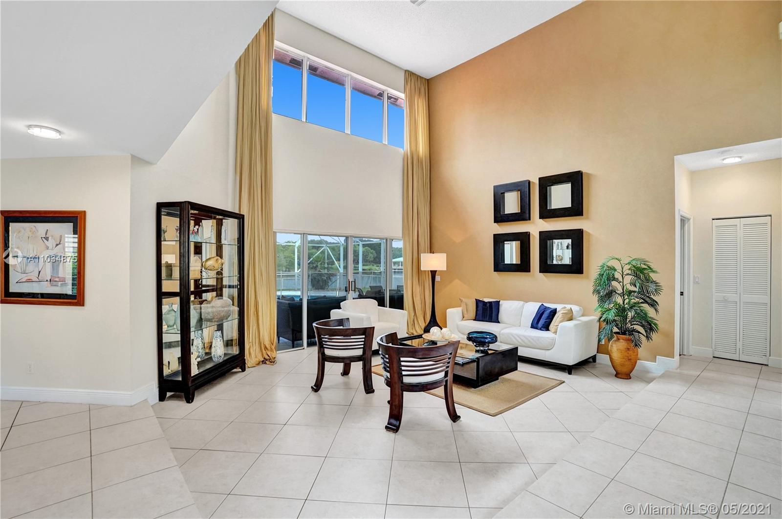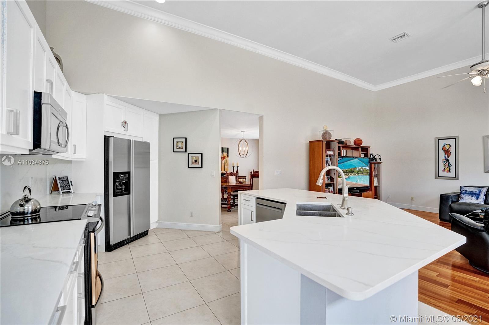 This spacious pool home sits on a premium oversized lot, boasting 133 feet of endless views & waterfront enjoyment. Unique architecture featuring a bright interior & dramatic 18 ft ceilings. This smart floor plan offers a ground level master suite, updated bath with marble finishes, whirlpool tub & separate stall shower w/glass enclosure. Cooking & entertaining is a pleasure in the BRAND NEW KITCHEN, featuring a generous center island & quartz counters w/waterfall design. Enjoy the outdoors in your covered patio, a fully screened pool & totally fenced yard with lake access for light boating in the largest lake in the area. Bonus features: Plantation shutters, Impact windows & accordion shutter protection, 2 zone A/C cooling. Ideal location, gated access, walking distance to park & pool!