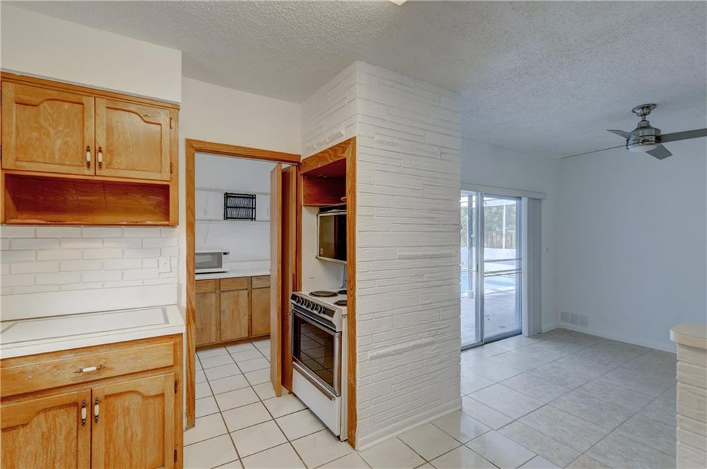 Charming Driftwood pool home. New roof 2019. Upgraded electric 2014. Tile and terrazzo floors. Large screened and covered patio area with sparkling pool! Freshly painted interior. Large kitchen, open to living area. Super bright family room with lots of windows and vaulted ceiling. Dedicated laundry room. Large covered area on patio. Entire patio and pool is screened. Nice yard with plenty of room for entertaining. Home is in very good condition. All carpeting has been removed, tack strips are still in place, please be careful not to step on them. Spacious home with large and open with lots of natural light. Super easy to show.
