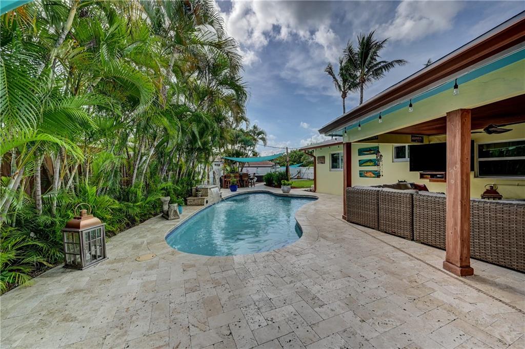 **WELCOME TO PARADISE IN EAST POMPANO BEACH** HUGE private fenced corner lot (11,420 sq ft) to store ALL of your toys!!). This home is completely & beautifully remodeled, ready to move in & enjoy! Featuring 3 bedrooms & 2 baths, an AMAZING tropical backyard with a free-form pool with waterfall & firepit, hot tub, fantastic landscaping, 2 sheds & exterior lighting. Cute front porch, back patio has 2 covered overhangs for entertaining. All impact windows & doors PLUS generator, beautiful laminate wood flooring with lifetime warranty. New roof in 2015, a/c less than 1 year old, hot water heater less than 6 months, Samsung Smart kitchen appliances 2 years old...list of upgrades too long to mention! Close to beach, I95, shopping & dining. DON'T MISS THIS ONE! Owner occupied.