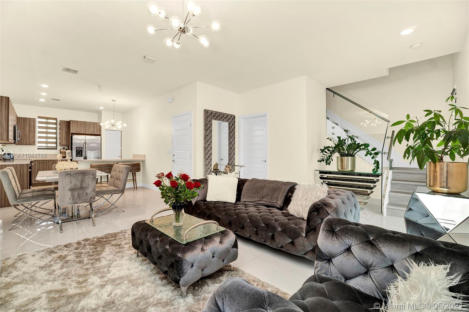 Modern, open concept layout townhome in the newest community in Doral. This newly built home has beautiful porcelain floors throughout and wood on stairs. The stair railings have been upgraded to a sleek glass design. Window coverings are all professionally done with zebra blinds. One car garage permits the parking of one inside and one car outside. Impeccable home and no detail has been spared. This home is close to all of the restaurants and shops that Downtown Doral has to offer. New state of the art clubhouse is a must to see. Contact me for showings.