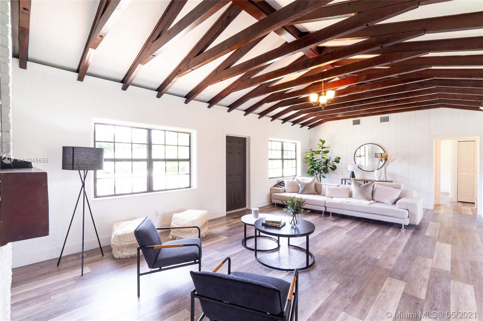 Beautifully renovated single-family home nestled in North Miami Beach situated on a prime corner lot. The home features 3 beds/2 baths and was completely updated including the plumbing and electrical systems. Built in 1948, the home retains some old Florida charm with an original fireplace, stunning exposed beams, brick masonry details, and wood paneling. Modern grey hardwood-style flooring, ultra-wide modern baseboards, and all new fixtures throughout. Contemporary kitchen with quartz countertops, glossy two-toned cabinets, and a mosaic tile backsplash. $5000 seller credit towards new appliances. Enjoy the South Florida lifestyle under a gorgeous avocado tree in the sprawling yard. Plenty of space for a boat and more on the 13,526 sqft. lot. Excellent location surrounded by parks. No HOA!