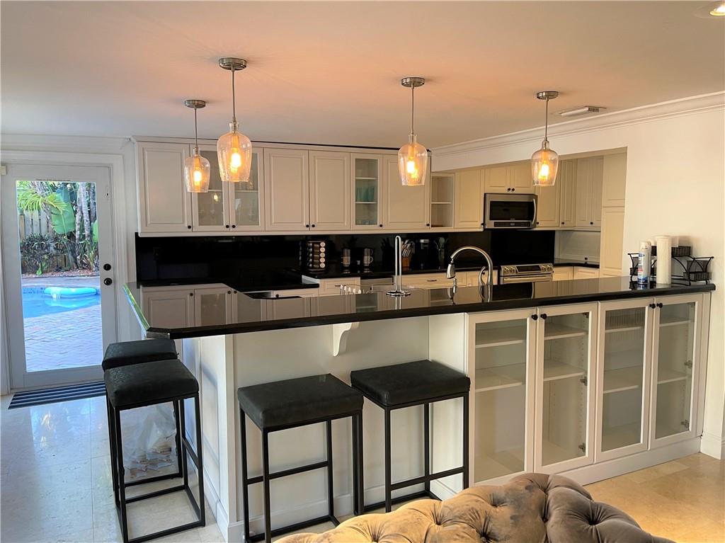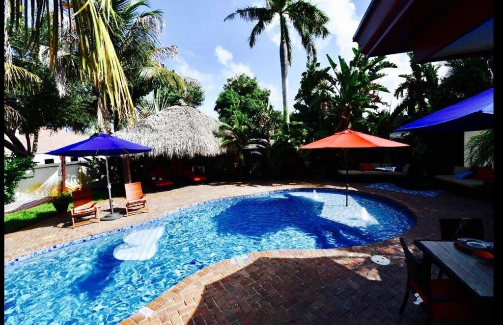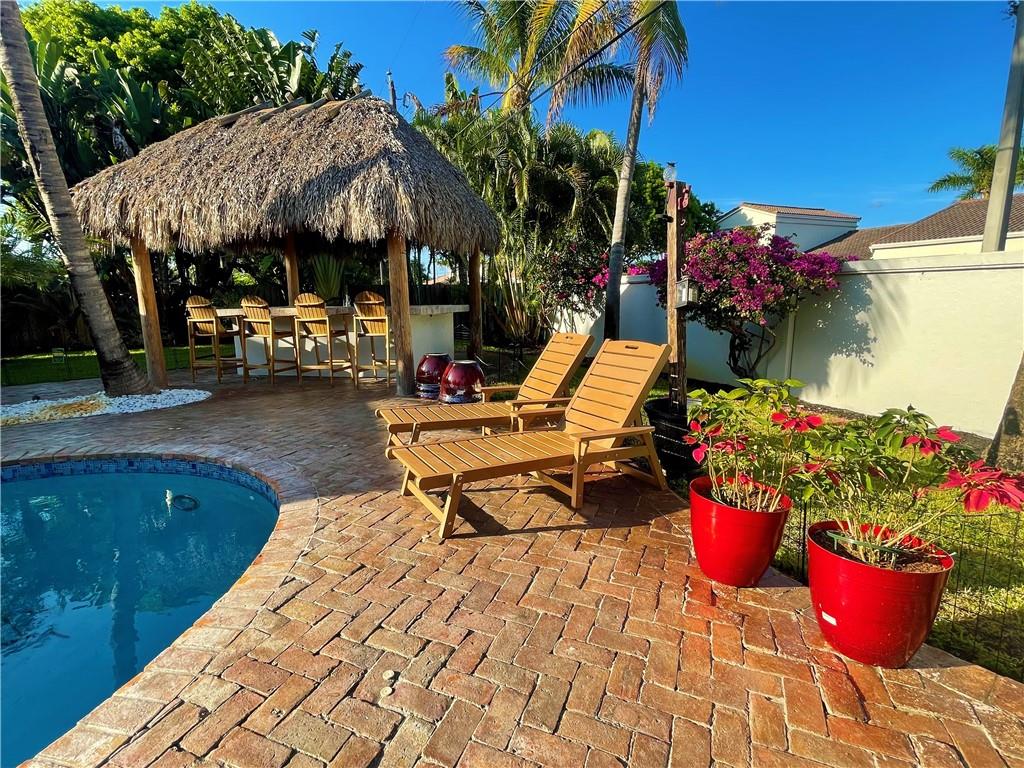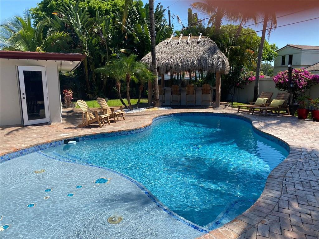 3 Bedroom 2 Bath pool in east Boca, 1 mile to the beach. Backyard is a tropical Paradise with 2 custom tiki huts, saltwater heated pool with a sun shelf. Inside you will find a nice open split layout with a large custom kitchen with granite, wine fridge, wood, and Limestone Marble floors throughout, tankless hot water system, large size laundry/utility room, plantation shutters, outdoor bar/kitchen counter with kegerator. Impact windows and doors. Brand new washer and dryer, refrigerator and pool heater. The driveway has plenty of parking. The home is located close to Mizner Park and a short ride to Delray Beach. Come see this one today before is gone.