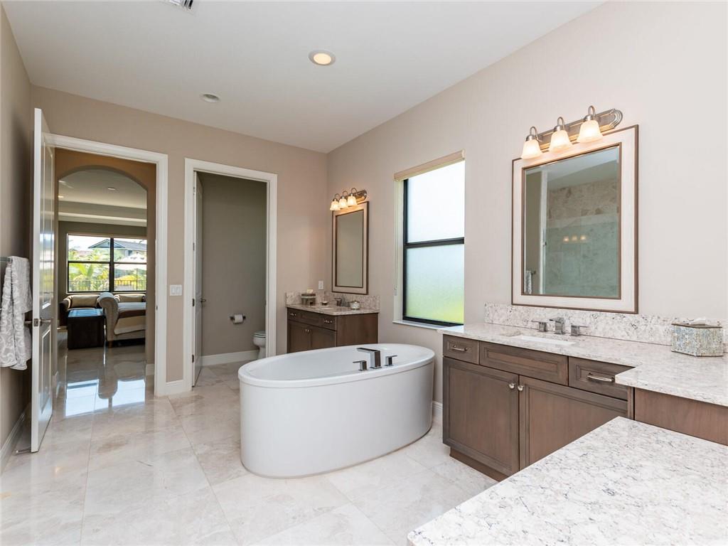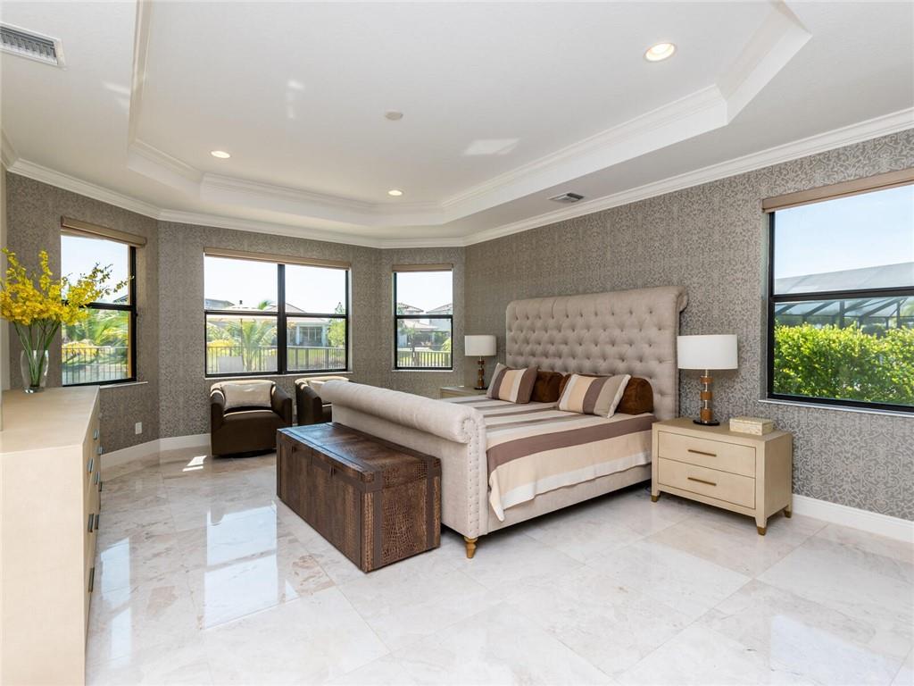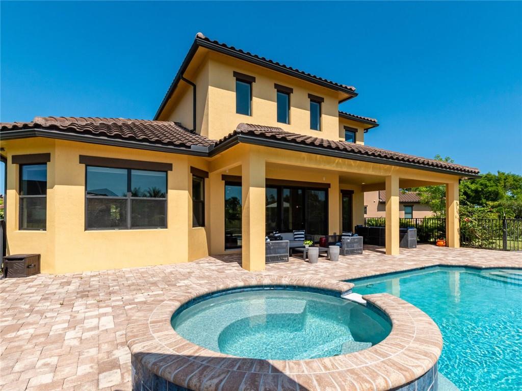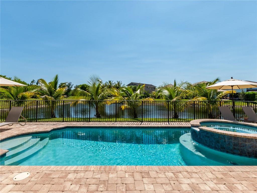 Gorgeous 4 beds + library/office (5th Bedroom) & loft/bonus room, 4 baths, 3 cg pool home on a private oversized lake lot highly upgraded w/ over $150,000 in upgrades including impact windows & doors, marble & wood in living areas, upgraded kitchen top of the line designer solid maple wood cabinets, select granite, glass tile backsplash, Jenn Air appliances including gas stove & walk-in pantry. Family rm overlooks the covered patio, pool, lake & backyard oasis. Library w/double glass drs, full cabana bth & laund. rm. The master suite is on the 1st fl w/ walk-in/built-in closet & all marble bthrm w/ dual vanities, free-standing soaking tub & shower. The 2nd fl boast a bonus room/loft as well as the remainder 3 beds & 2 baths. The community offers resort style amenities. Nearby A-schools!