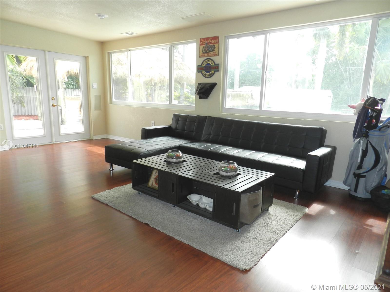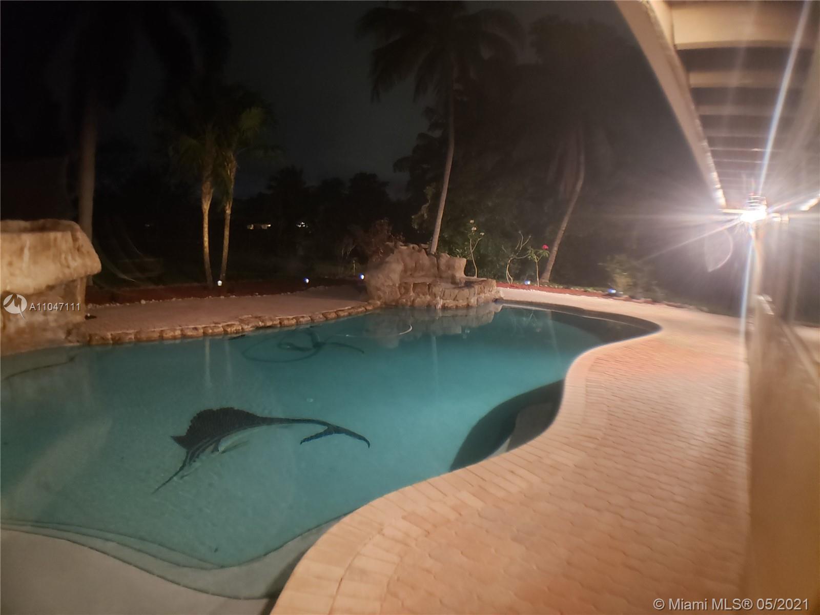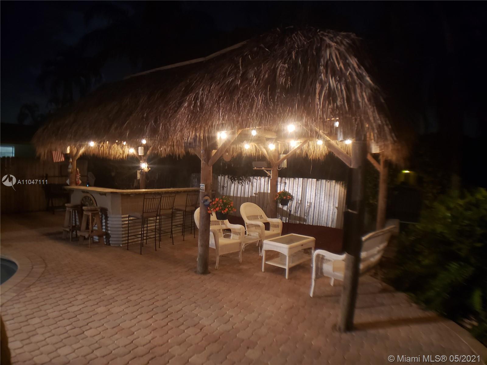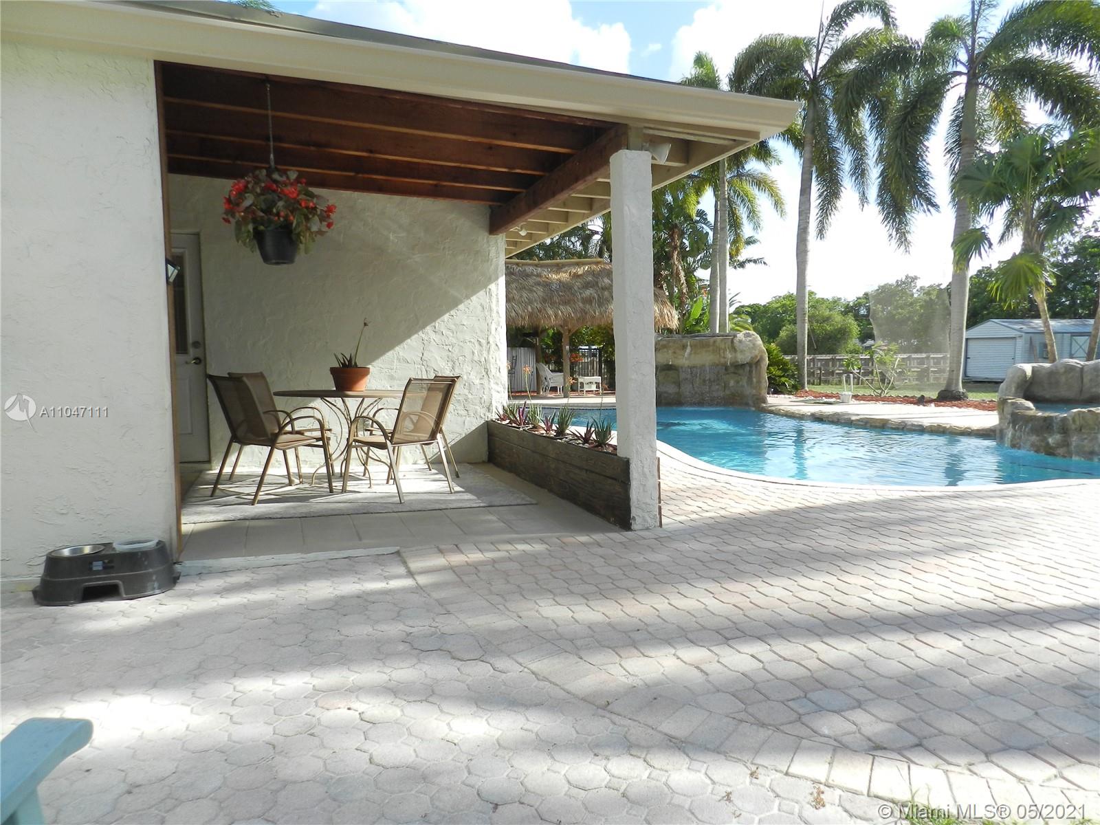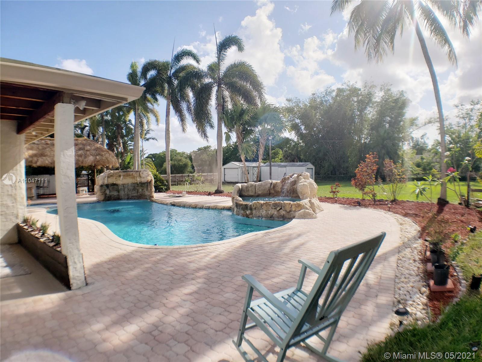 Immaculate 3BR/2BA, plus Florida room, sitting on almost an acre of waterfront land on a quiet dead end street in the peaceful SW Ranches. Bright and open, this home features a spacious family room, a bonus game room/TV room/bar, a large, modern kitchen with wood cabinets and gorgeous granite countertops, 3 large bedrooms, 2 sheds, a 1.5 car garage, and 2 driveways with plenty of room to park all your toys, boats, RV's, etc. Perfect for outdoor entertaining or to unwind after a long day, the backyard boasts alfresco dining from the covered porch overlooking the stunning pool and garden views, a custom made tiki bar with seating area and outdoor speakers, and a beautiful salt water pool with 2 waterfalls. Excellent schools, close to shopping and major highways.