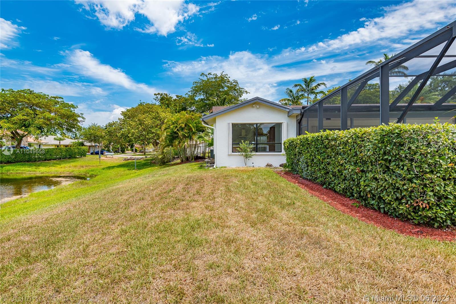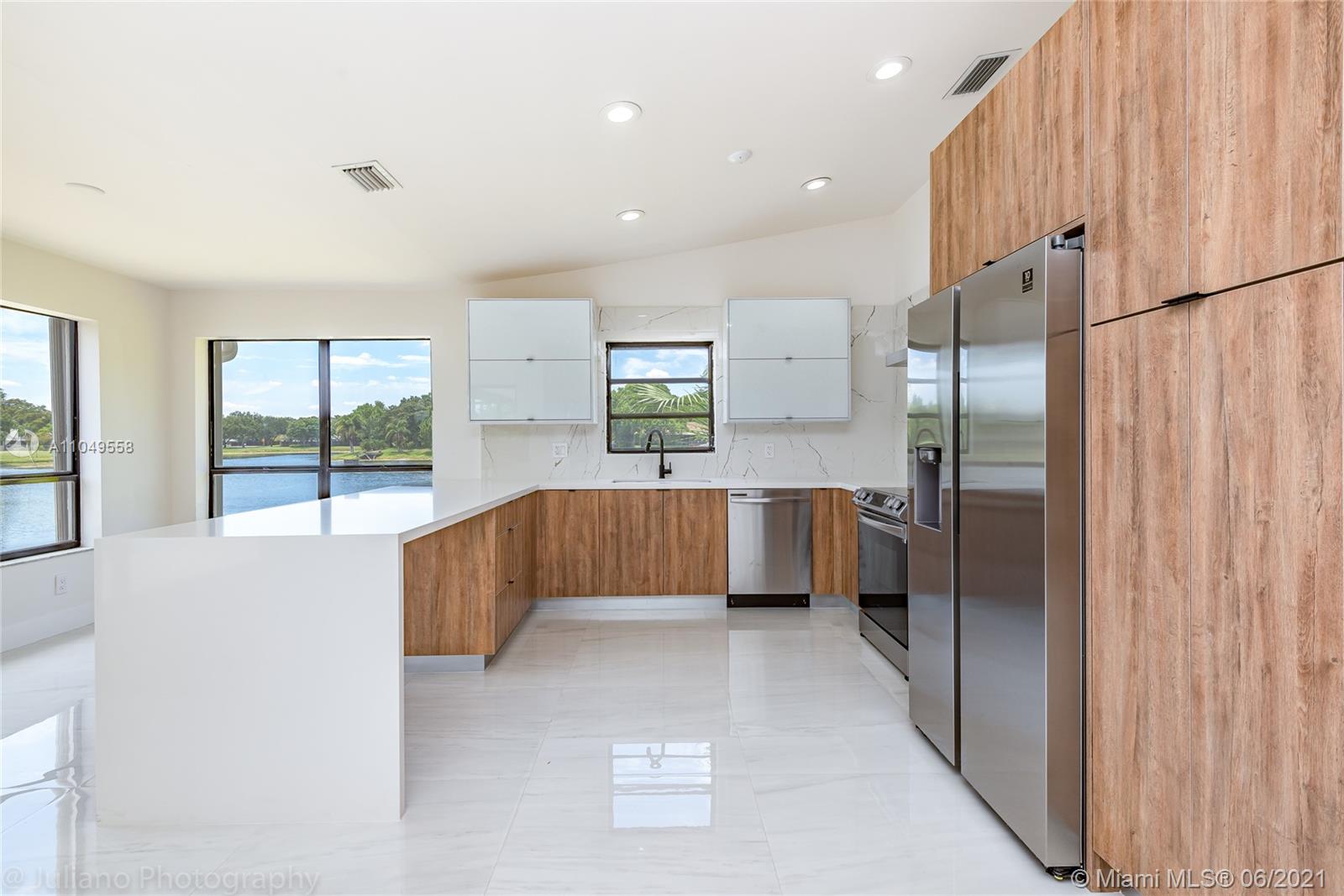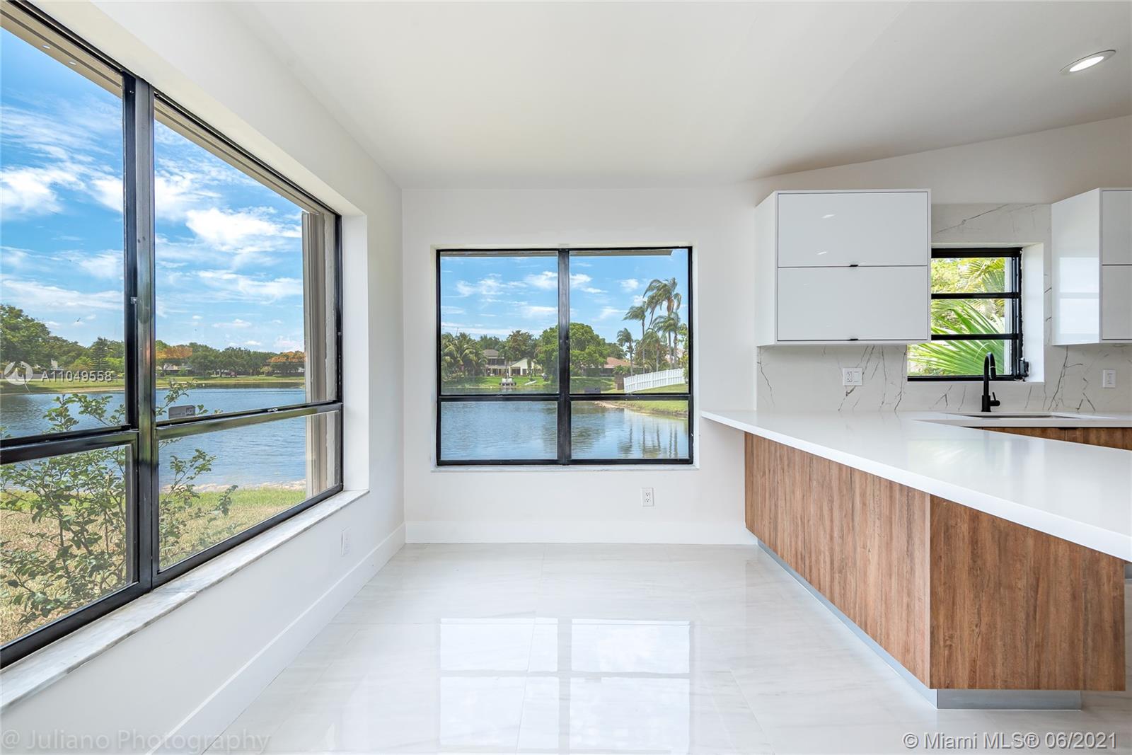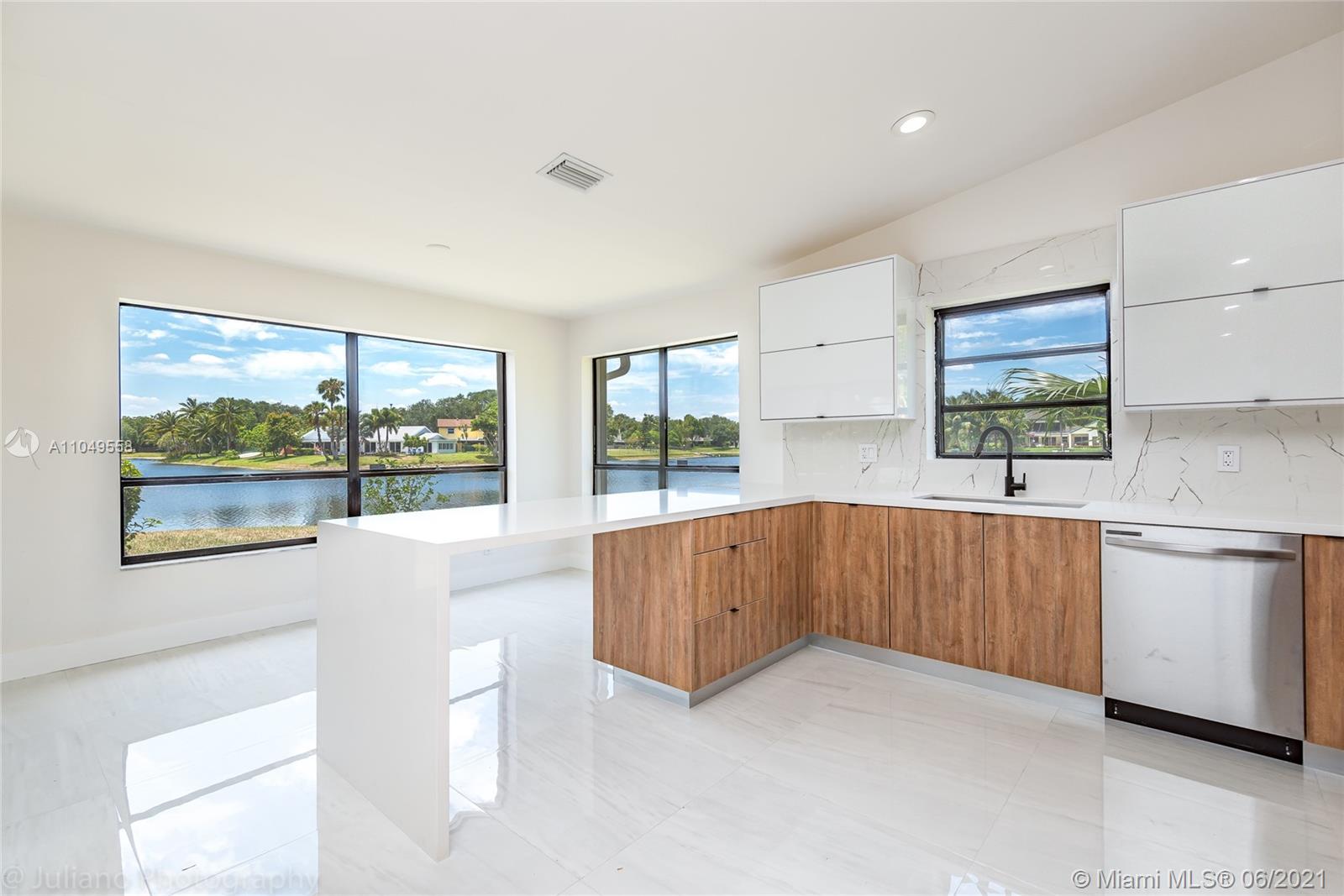 You won't want to miss this unique home located in Cooper City's Rock Creek neighborhood. This home has an amazing open floor plan and is perfectly laid out with lots of living space, 4 bedrooms, and 2 ½ baths. From the moment you walk through the front door, there are floor-to-ceiling glass windows with AMAZING water views and high ceilings.The lot is surrounded by water on 2 sides and makes for a complete gem. Imported porcelain floors in living area and vinyl in bedrooms. Italian kitchen and bathrooms. New roof and accordion shutters