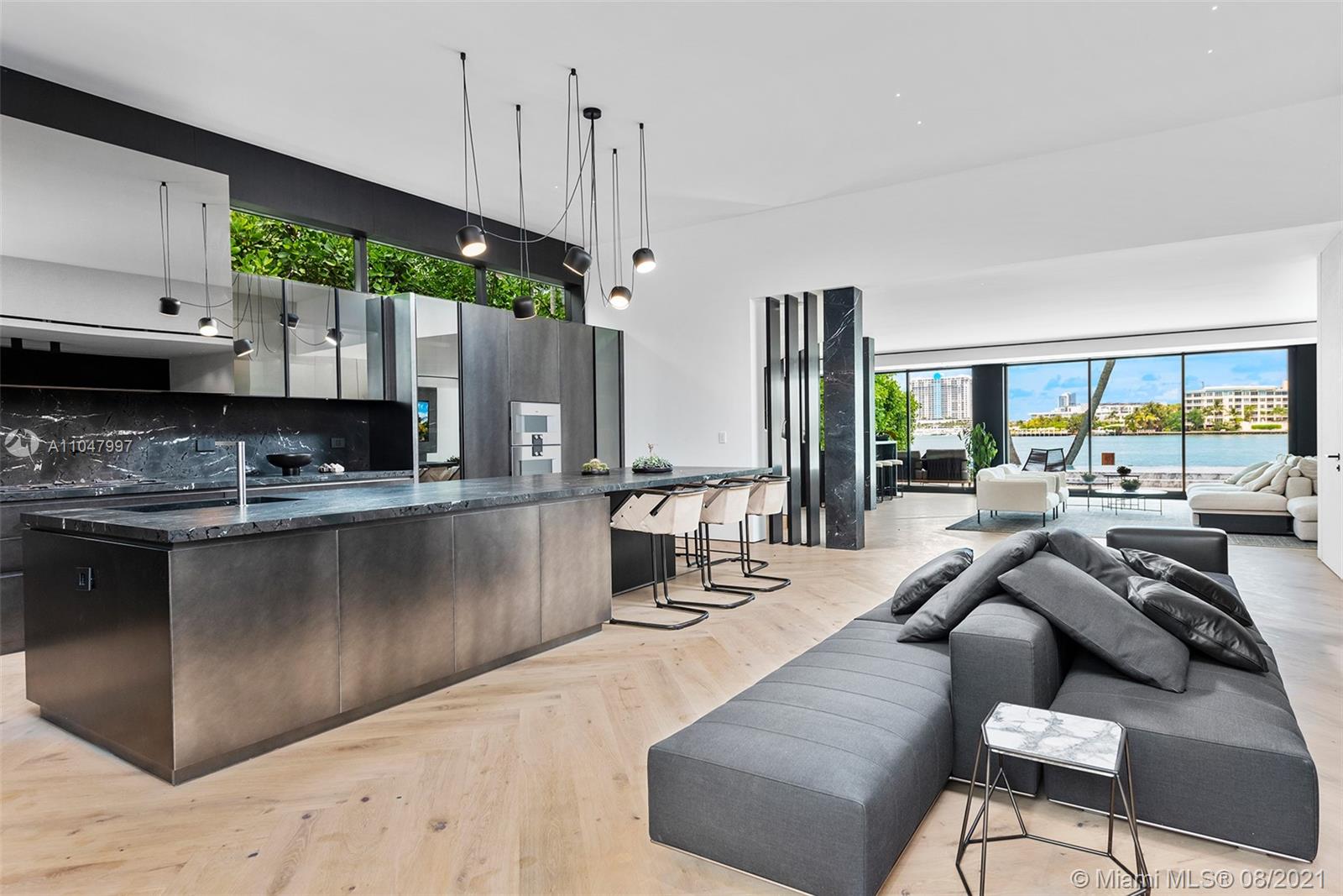 An extraordinary modern waterfront estate offers a completely custom living experience where every space was created to achieve a resort-like lifestyle bursting with amenities. Exquisite features include Boffi baths, Porsche lighting, Gaggenau appliances, custom Italian cabinetry, spacious kitchen, dining, bar & entertainment areas, commissary kitchen & laundry & staff quarters accessible through a service entrance. The principal suite & spa bathroom transport you to a tranquil resort w/ a rooftop deck to enjoy panoramic views of South Beach. Vertical gardens & organic stone claddings soften the exterior & provide a tropical modern feel. The outdoor experience is completed by a Statuario Marble clad acrylic infinity edge pool, jacuzzi & Ipe dock.