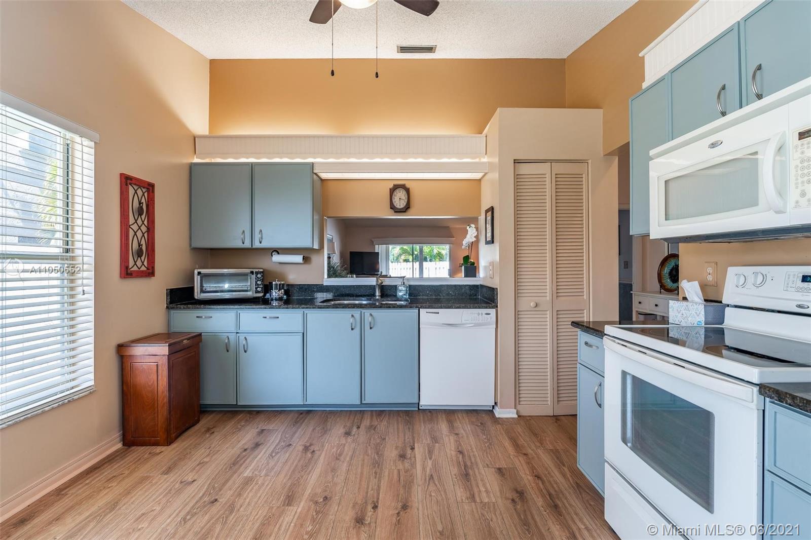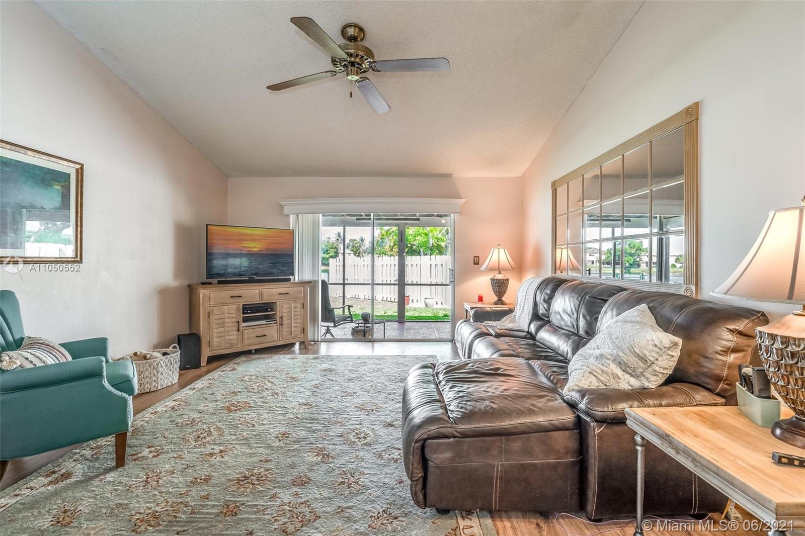 Adorable and Affordable describes this 2/2 lakefront beauty. Originally a 3 bedroom, the kitchen was expanded to make a terrific eat in area. Almost 1500 sf of living area with soaring ceilings and natural lighting. Upgrades include gorgeous laminate wood plank flooring throughout, window moldings and 2018 AC. Open concept with great room. Terrific exterior features include a covered screened patio, fenced lot and beautiful views of the lake. Enjoy fishing or canoeing from you own backyard. Hurricane shutters offer protection from storms. One car garage, driveway and guest parking. Excellent location with easy access to highways high quality restaurants, shopping and the fabulous schools.