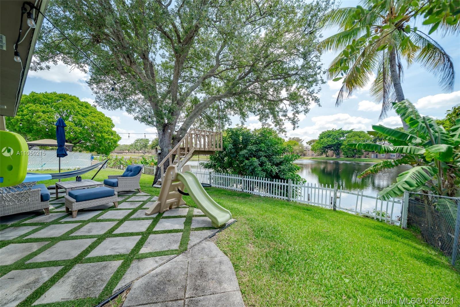 This stunning 3 bedroom 2 bathroom + Den lakefront home is in the heart of Pembroke Pines awaiting a new owner. With plenty of natural light the spacious layout of over 2,000 square feet is fully tiled with gorgeous lake views from the kitchen, living room and den. Kitchen features wood cabinets, granite counter tops and SS appliances. All bedrooms are beautifully layered in dark chocolate bamboo flooring. Master bedroom is spacious with his and her walk in closets along with an upgraded bathroom. Backyard has plenty of space for a pool and boats gorgeous lake views with modern pavers in the sitting area. Custom made tree house for the little ones and complete sprinkler system using lake water. 2 Car garage, Stamped concrete driveway easily fits 6 cars, NO ASSOCIATION and New Roof!