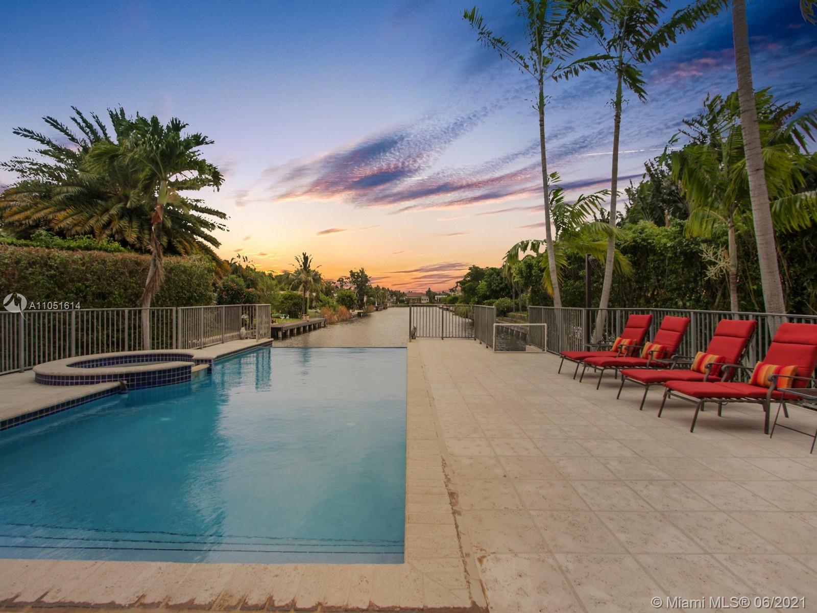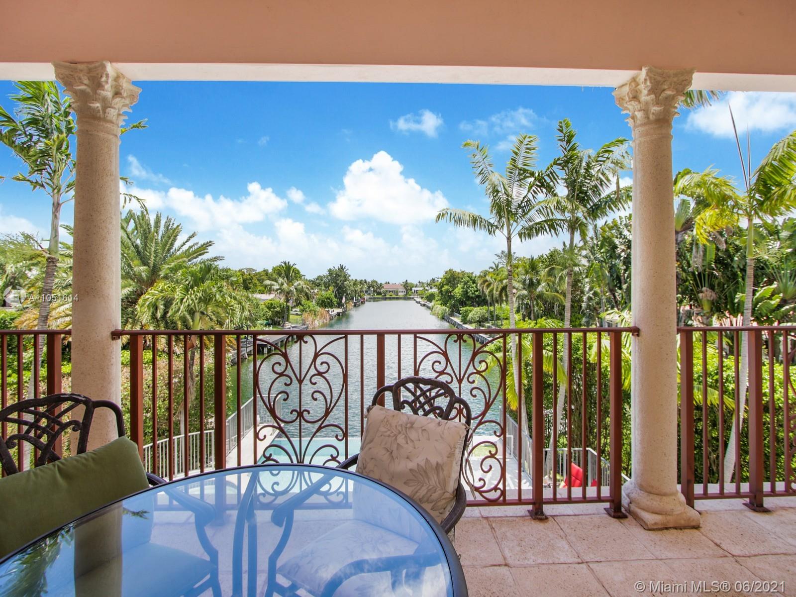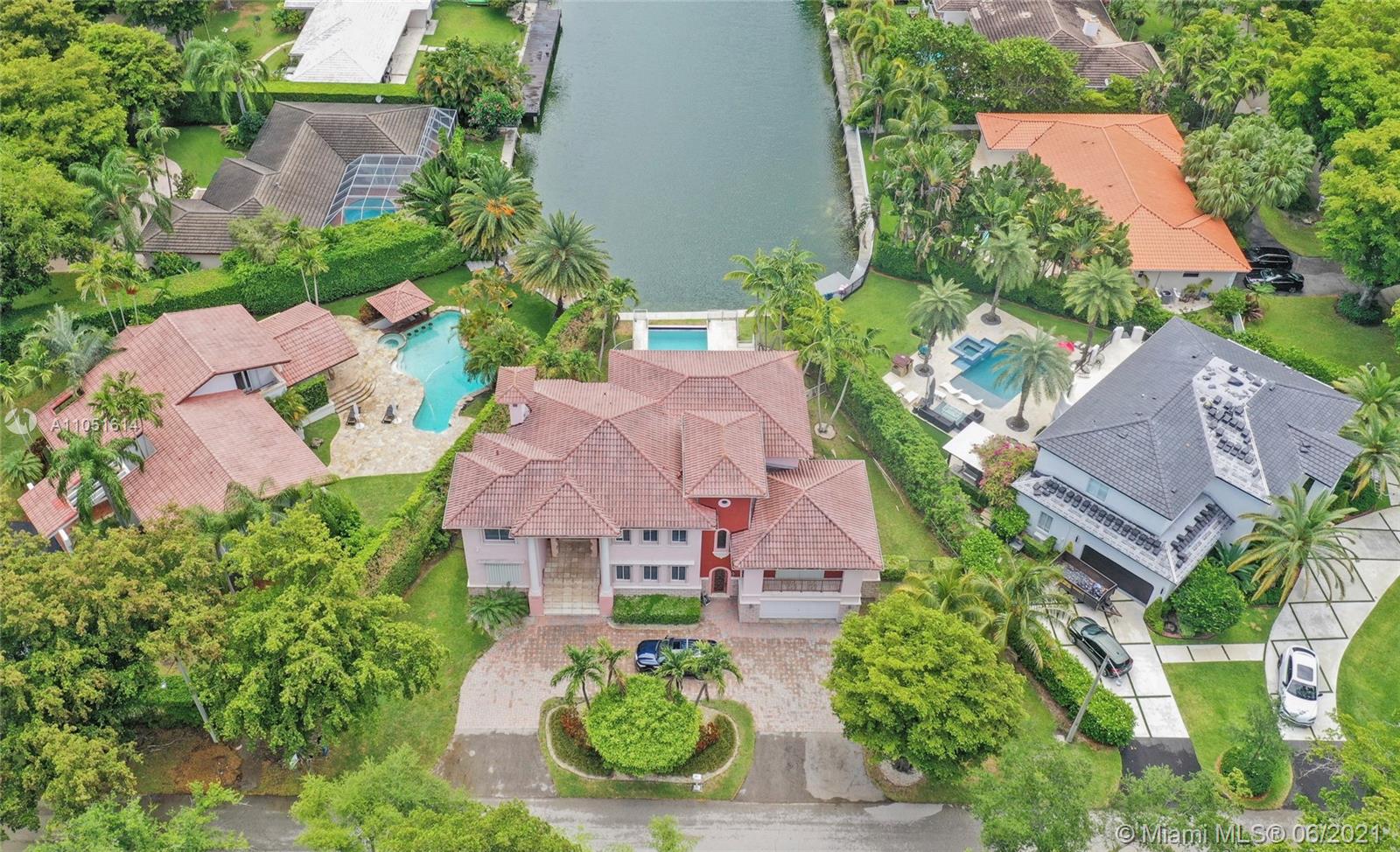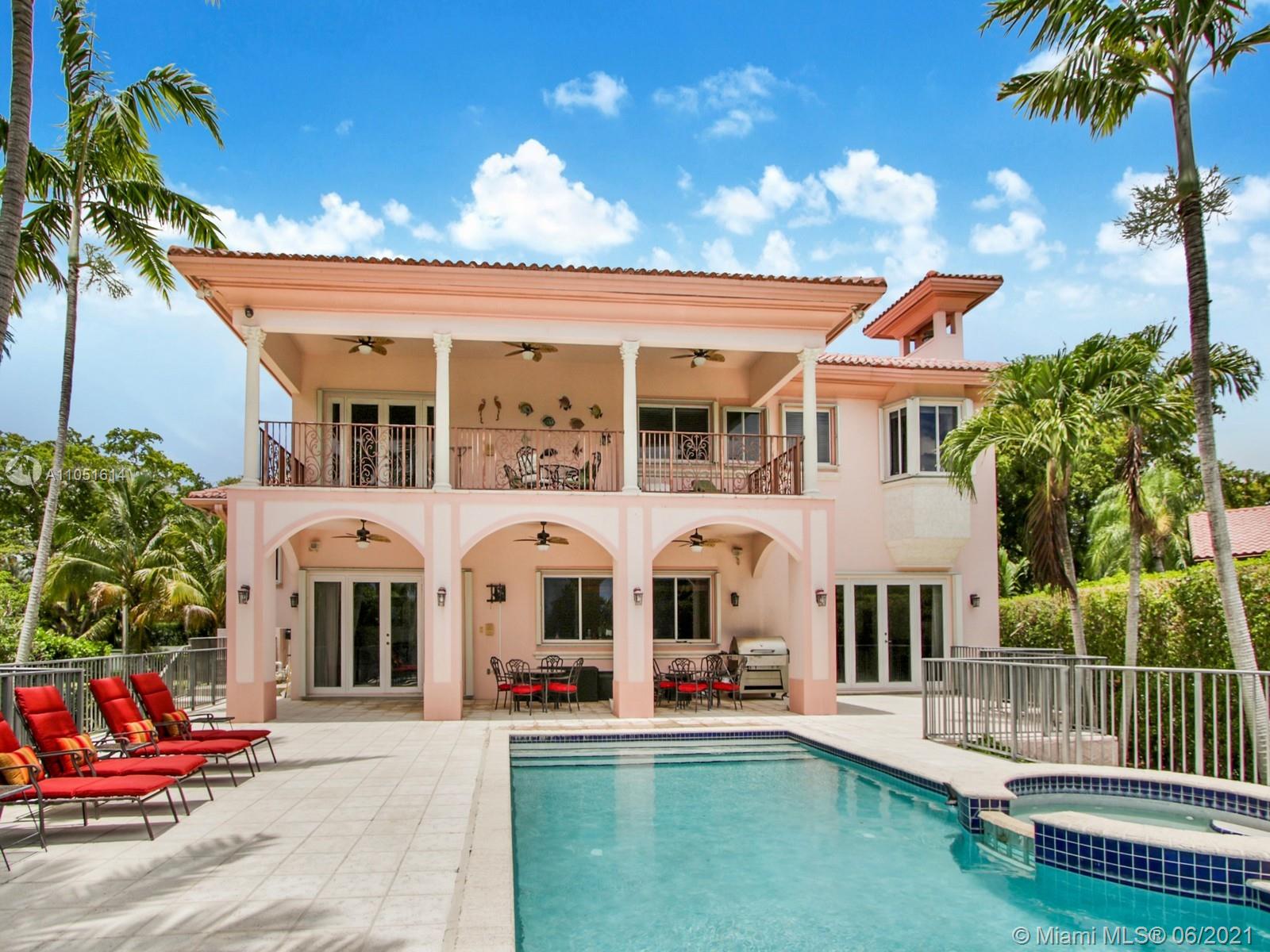 One of only a few end lot homes in Gables by the Sea, this grand 4,407 SF home sits at the end of the waterway with lush landscaping for the ultimate in waterfront privacy. At 12,500 SF, the lot is open and sunny, with water views in the backyard, a beautiful infinity edge pool, and large covered terraces both upstairs and downstairs for outdoor entertaining. Inside, the spacious home boasts 12 foot ceilings, a large eat in kitchen that connects to the family room, formal living and dining rooms, and a separate game room. Each of the home’s 5 bedrooms has its own en-suite bath, and an upstairs laundry room & kitchenette provide the ultimate in convenience. Gorgeous 2 story Mediterranean style home built in 2002 offers great frontage on Red Road w/quick access in & out of the neighborhood.