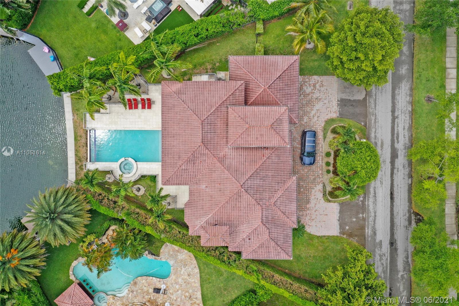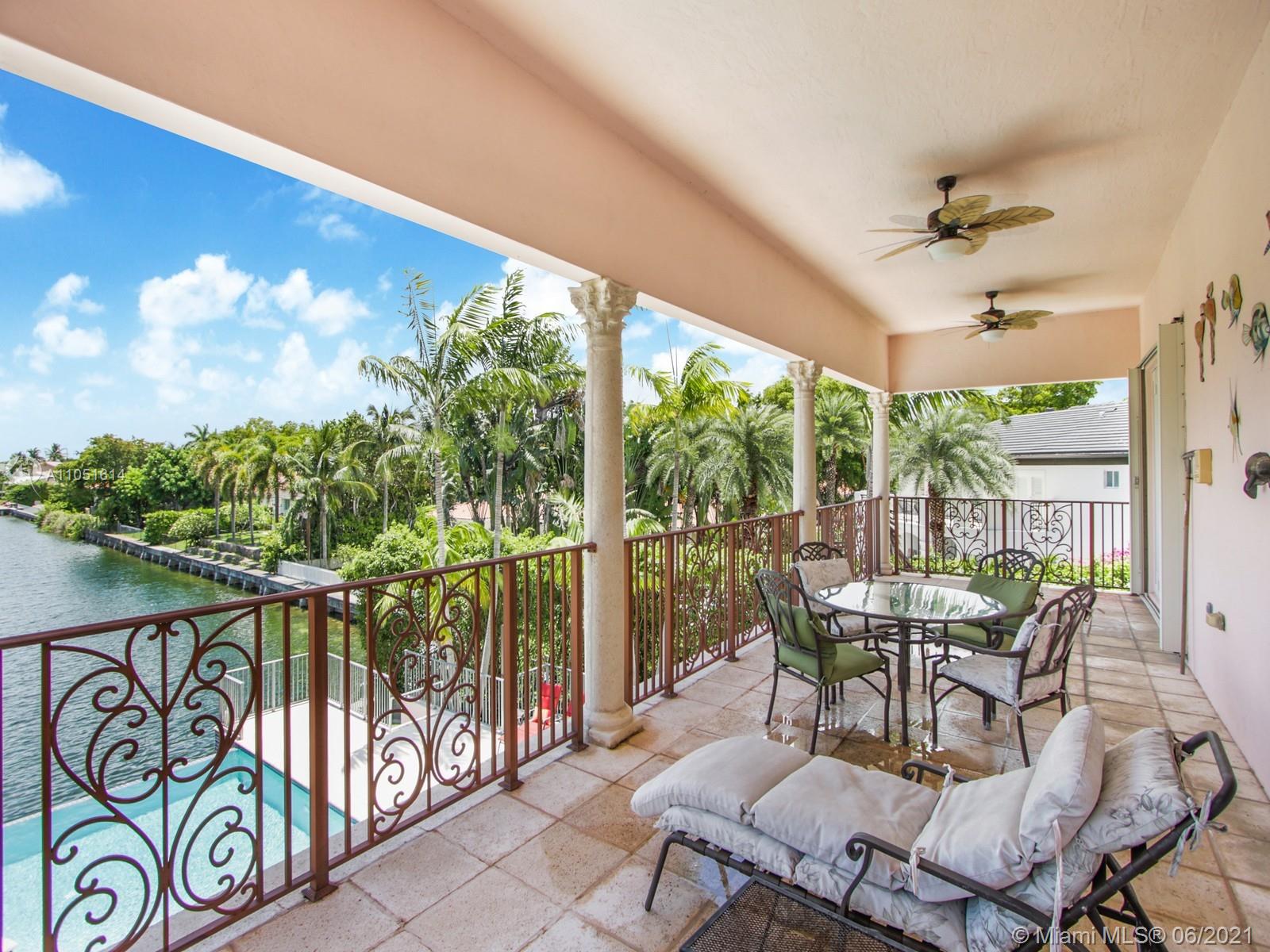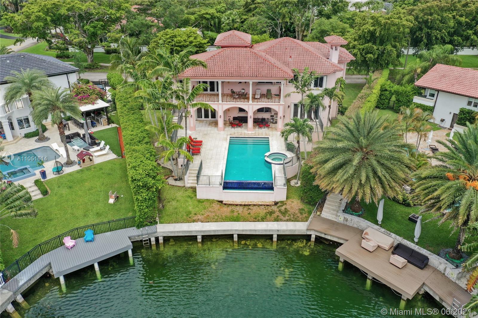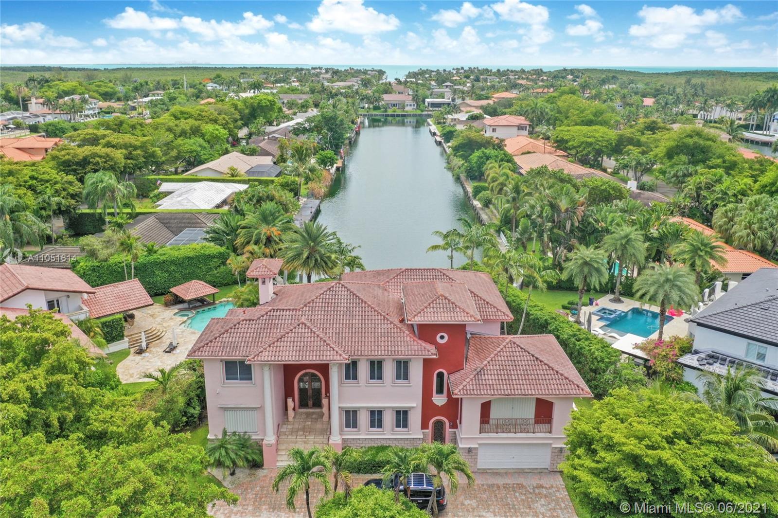 One of only a few end lot homes in Gables by the Sea, this grand 4,407 SF home sits at the end of the waterway with lush landscaping for the ultimate in waterfront privacy. At 12,500 SF, the lot is open and sunny, with water views in the backyard, a beautiful infinity edge pool, and large covered terraces both upstairs and downstairs for outdoor entertaining. Inside, the spacious home boasts 12 foot ceilings, a large eat in kitchen that connects to the family room, formal living and dining rooms, and a separate game room. Each of the home’s 5 bedrooms has its own en-suite bath, and an upstairs laundry room & kitchenette provide the ultimate in convenience. Gorgeous 2 story Mediterranean style home built in 2002 offers great frontage on Red Road w/quick access in & out of the neighborhood.